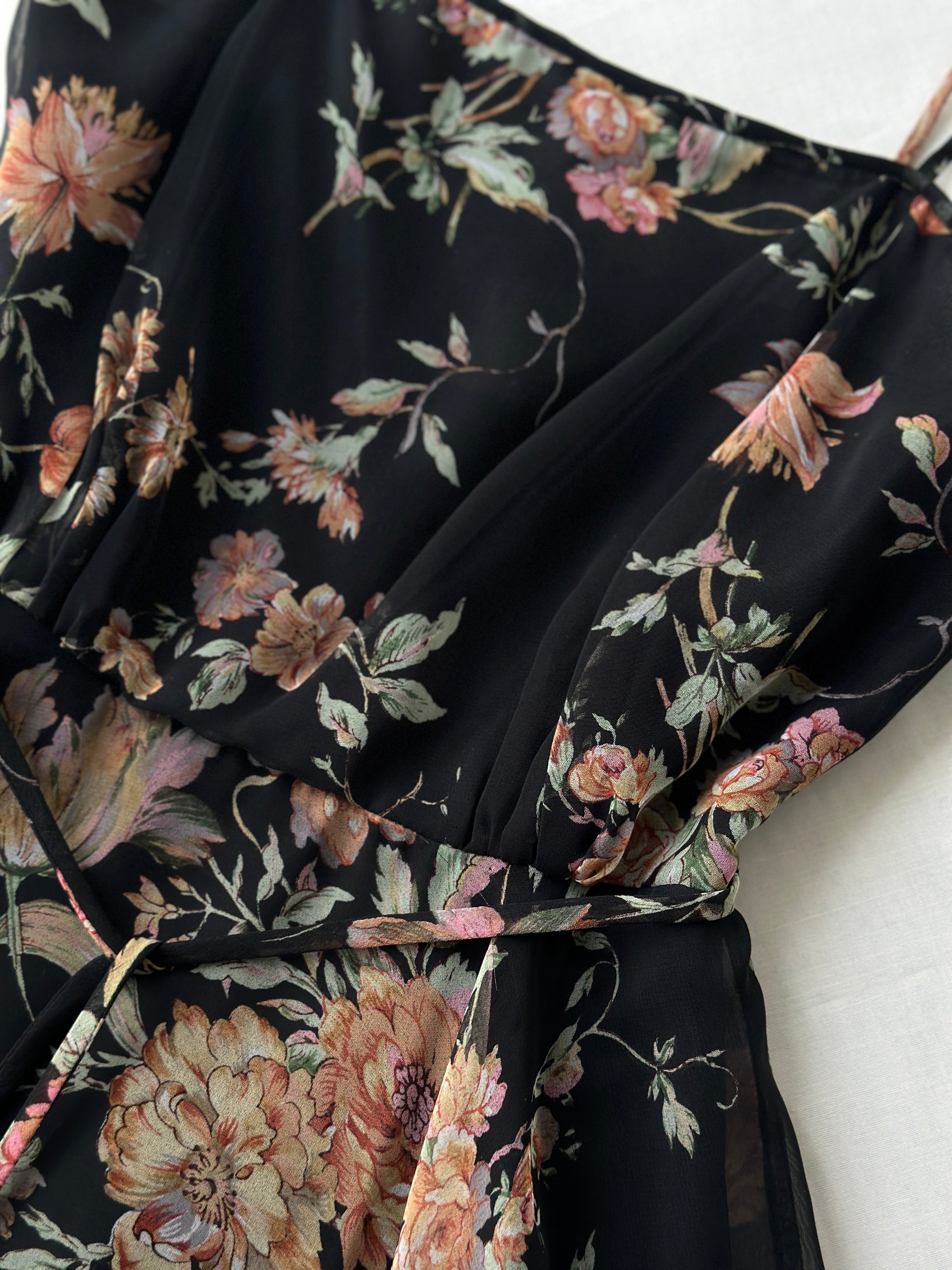 description. absolutely beautiful 70s two piece dress, the fabric is a very timeless floral pattern. the dress comes with a sheer coverup blouse, and an absolute fantastic fit