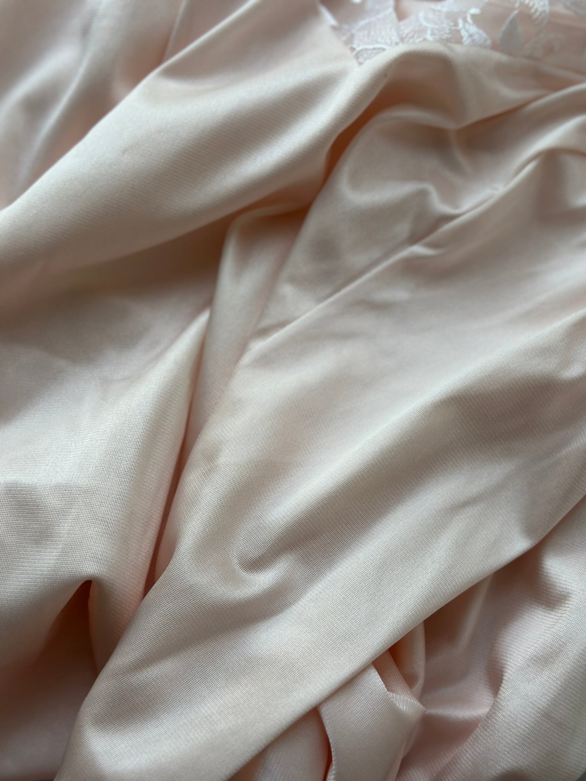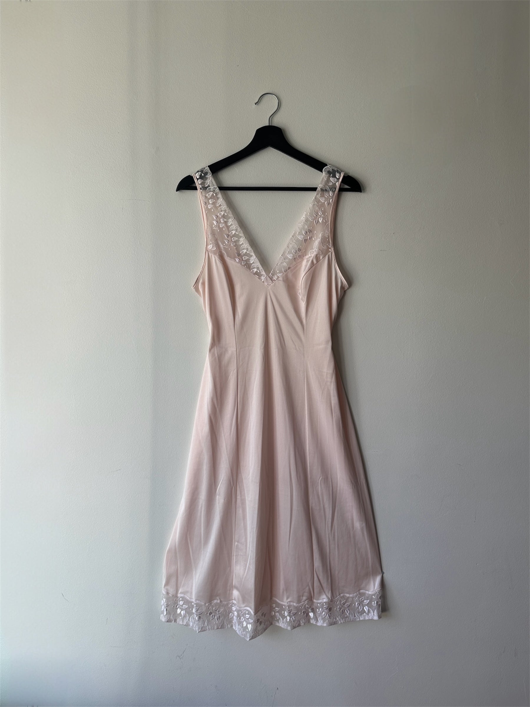description. the sweetest light pink night slip with adorable love heart shaped leaves on a vine, the lace goes along the bottom hem as well as the front v neck line