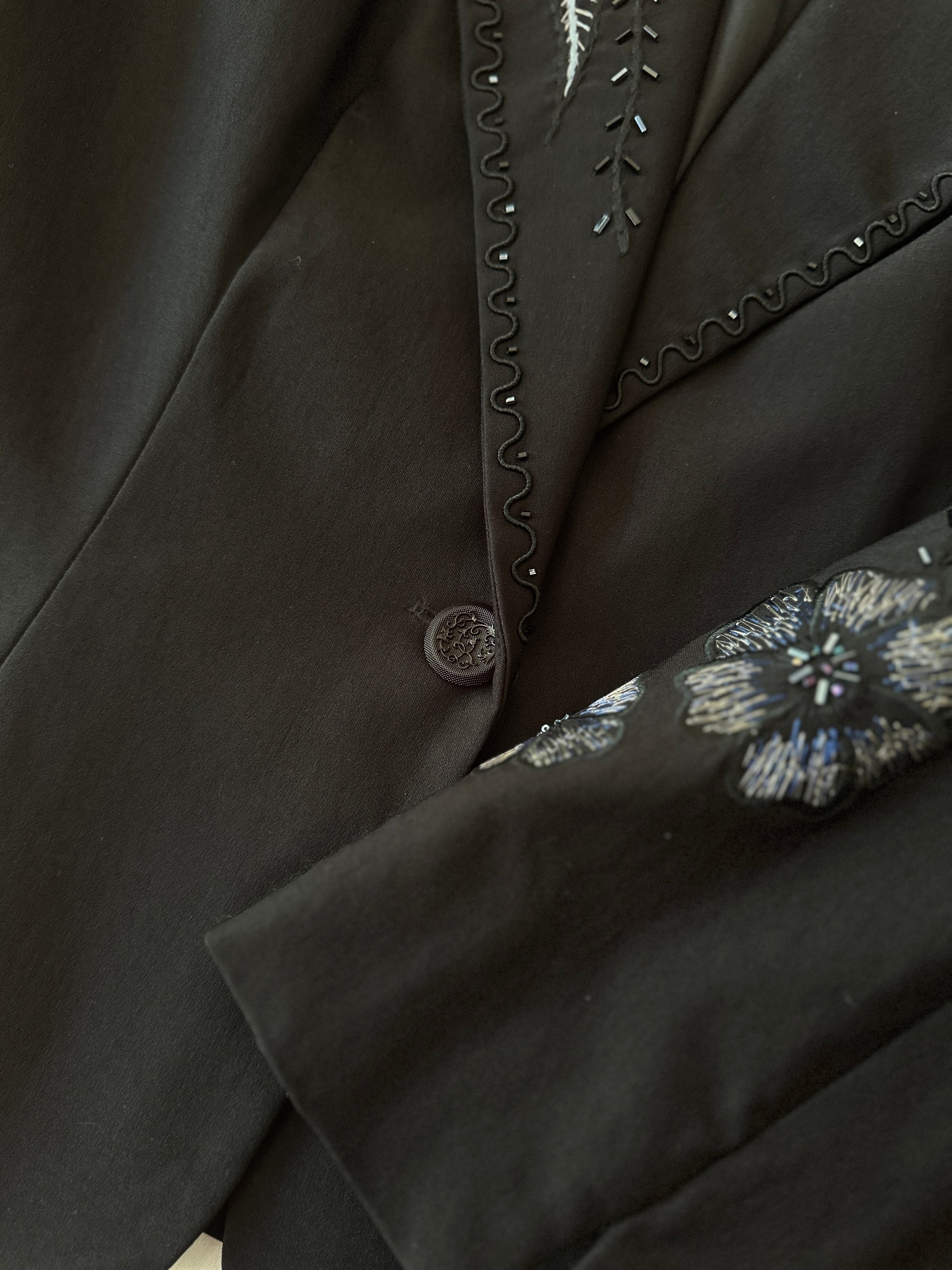 description. an absolute one of a kind piece, this femme suite needs a home. the material has such comfortable stretch to it, while we can't overlook the actual reason why this piece is special- the beaded embroidery on the jacket and pants, alternating sides, makes it such a fun set. honestly this is your go-to when wanting to make an impression at your next event