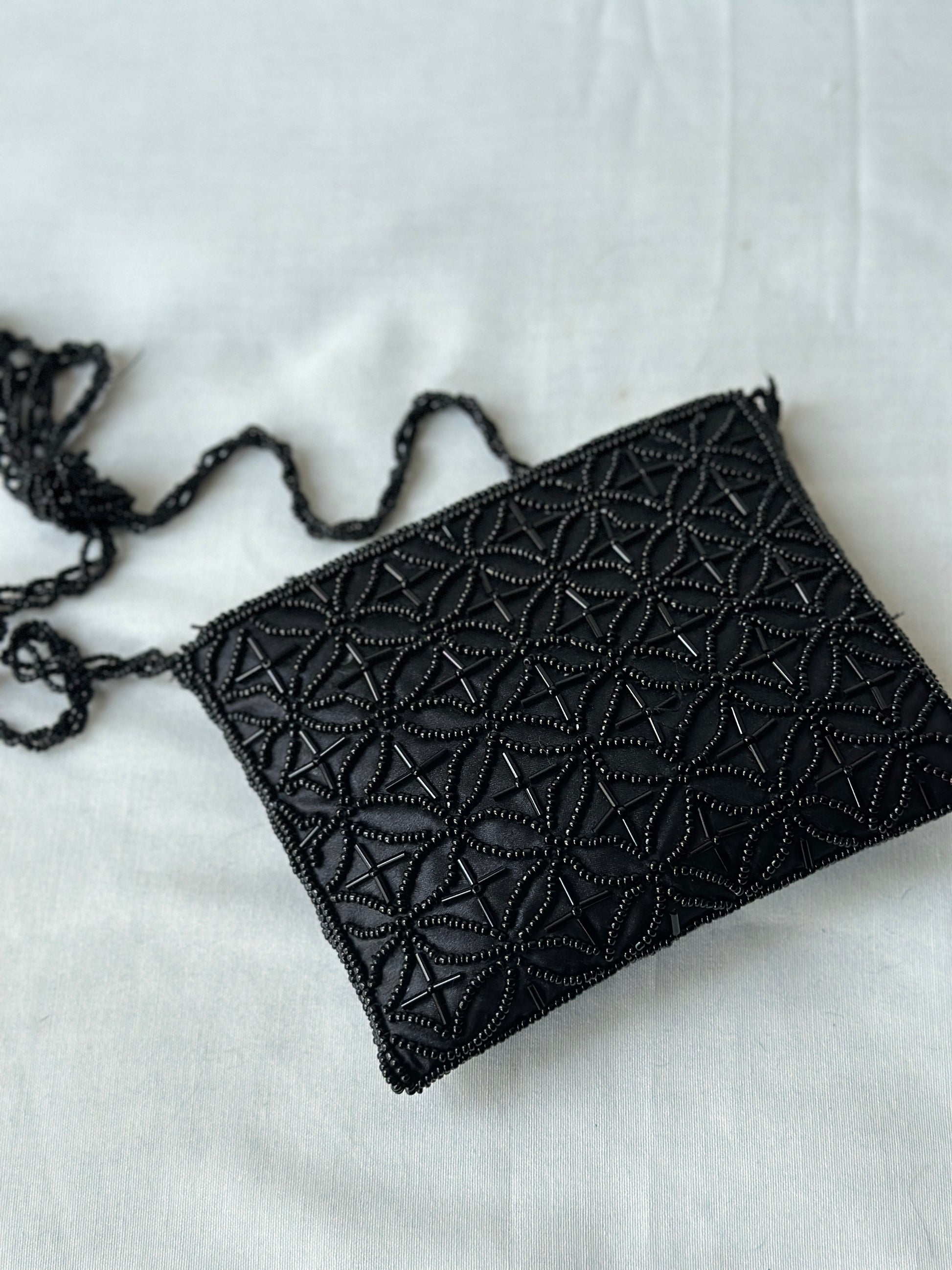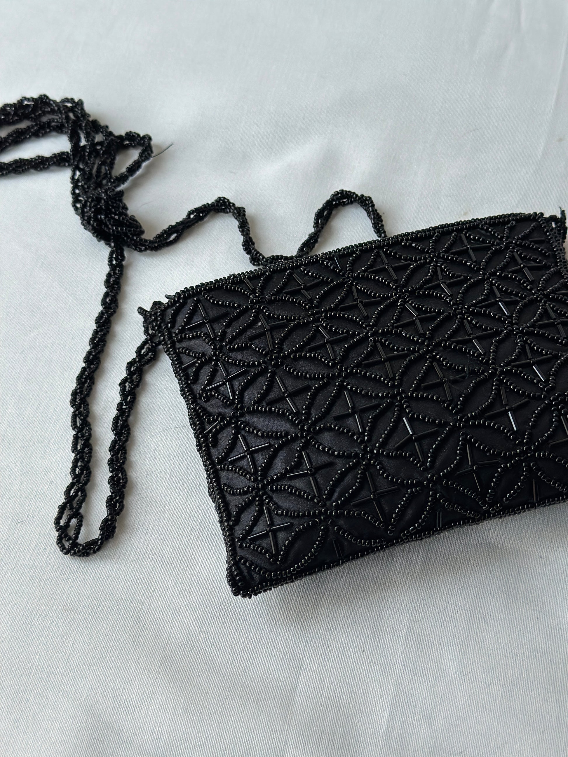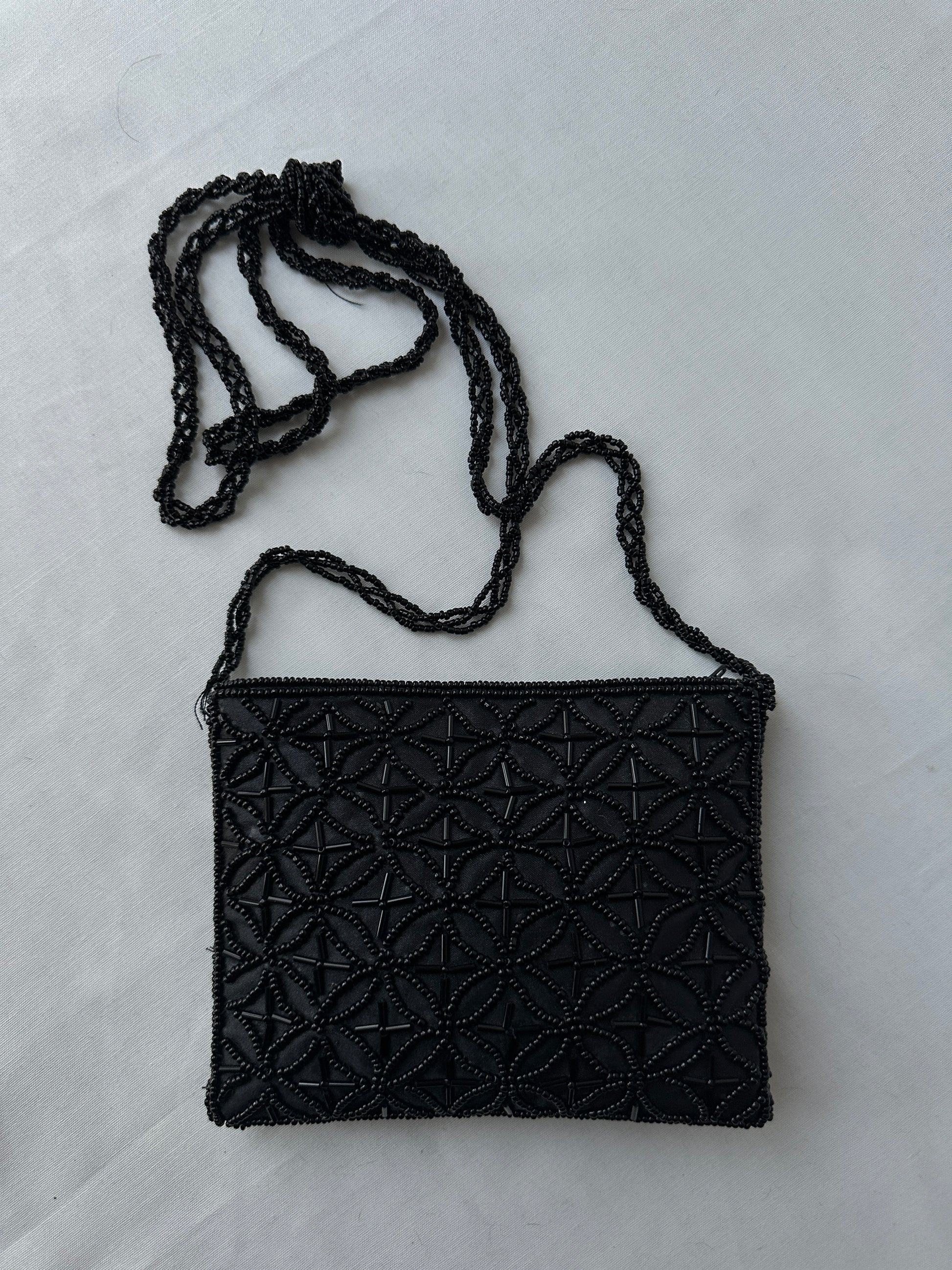 description. this black sating beaded purse is really sweet and has a super long beaded strap. the beads are stitched in a sort old diamond pattern, consistent across the entire front and back of the purse.