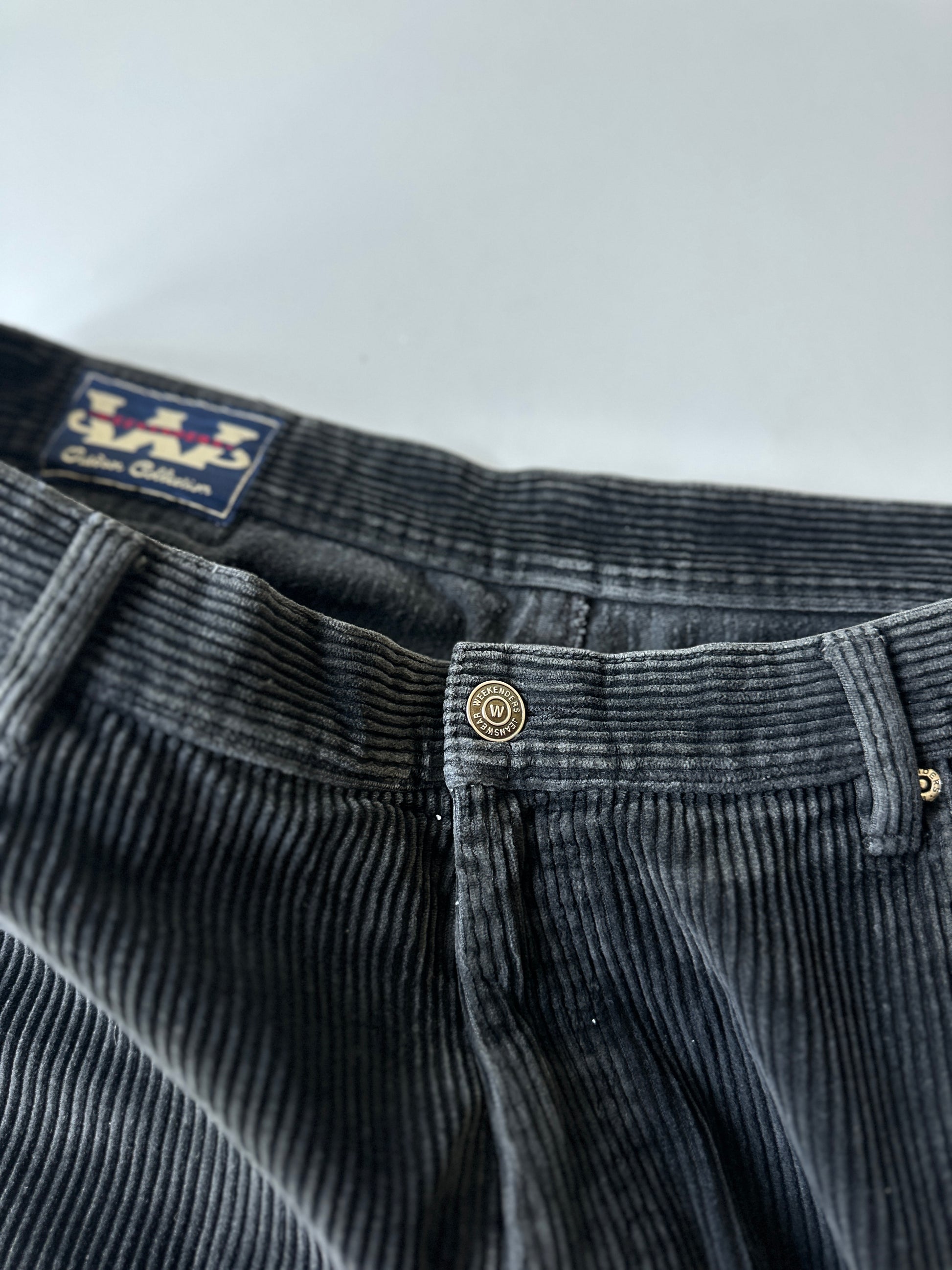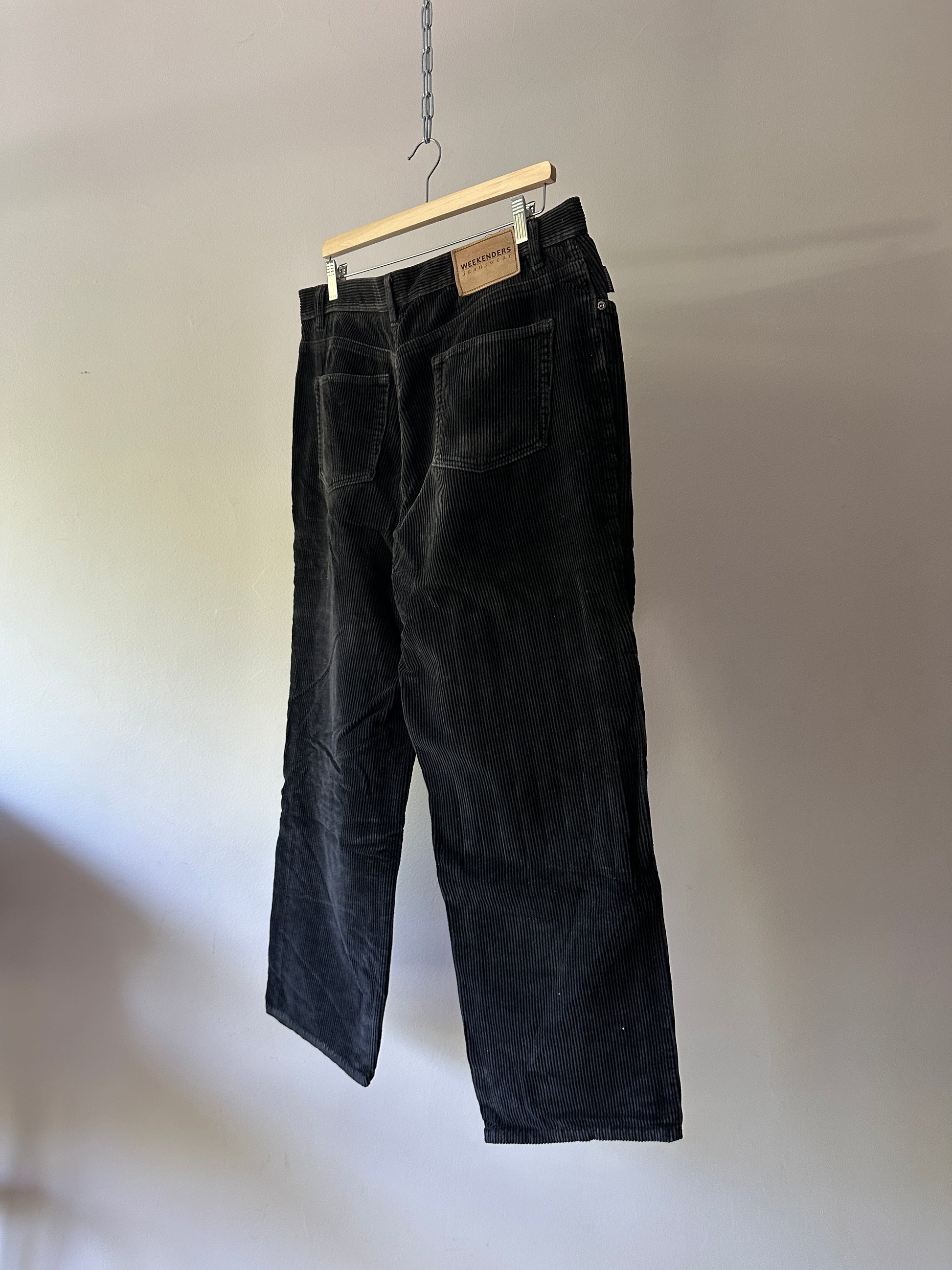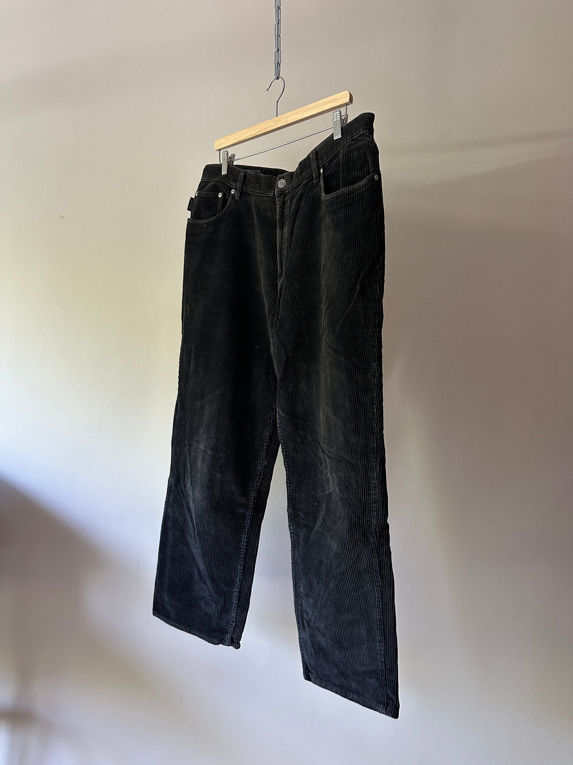 description. a great pair of black corduroy pants, with a slight fade to the fabric these are perfect if you like the vintage, faded, worn look. a super straight leg, they'll scrunch fantastic at the bottom or just roll them up with a pair of boots!