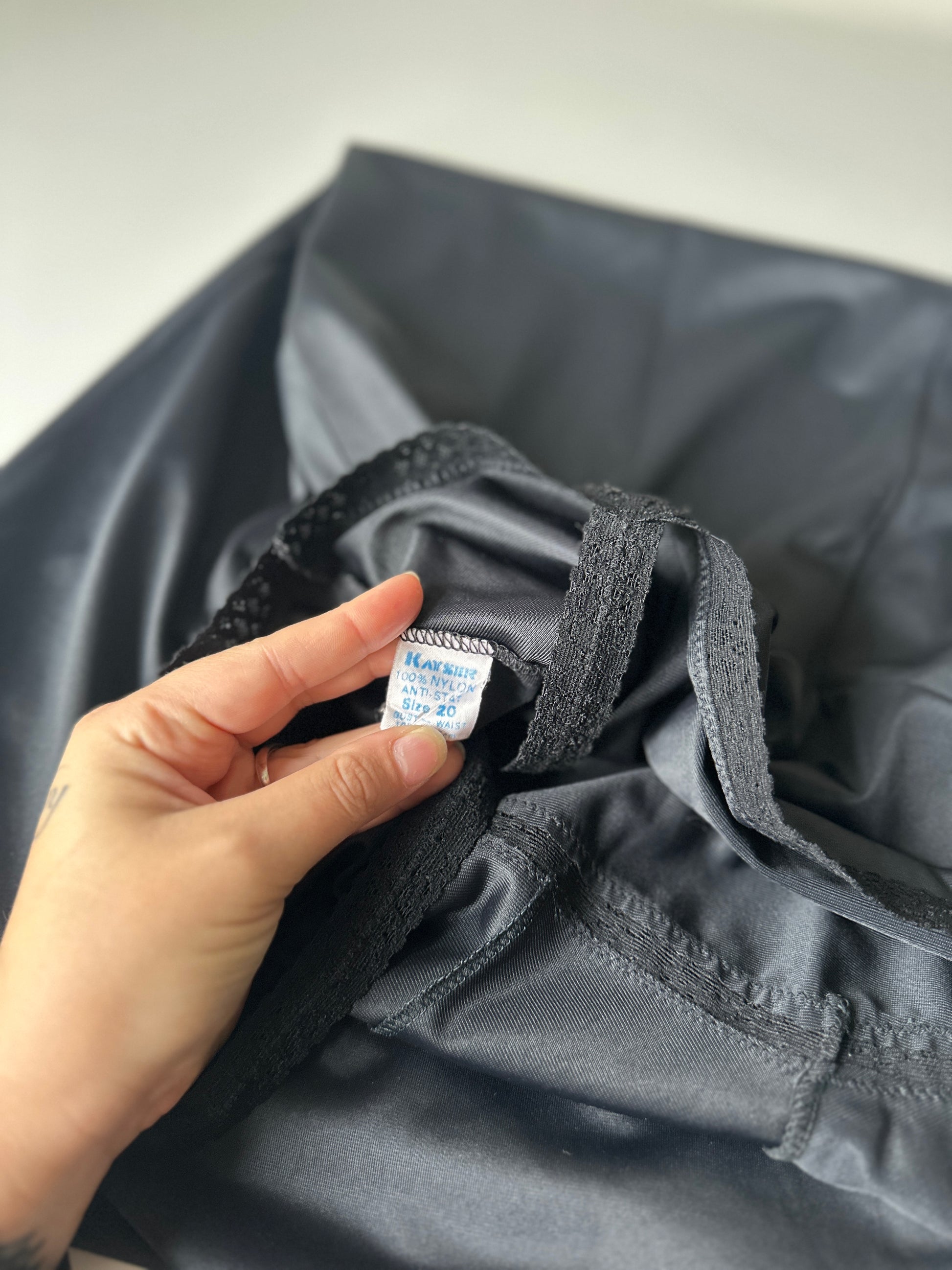 description. a matte black solid/sheer mid-length dress lip with lace straps and trims, a fitted bust and longline skirt. the material has some stretch to it but there aren't any adjustable straps