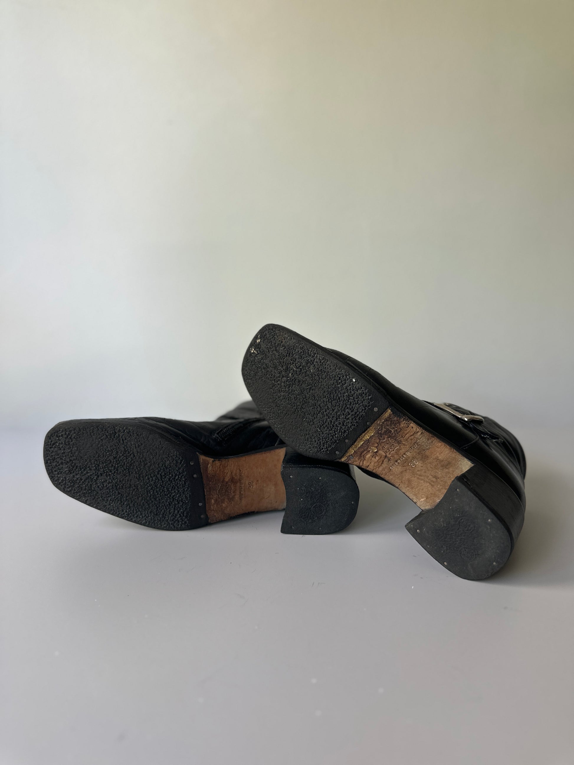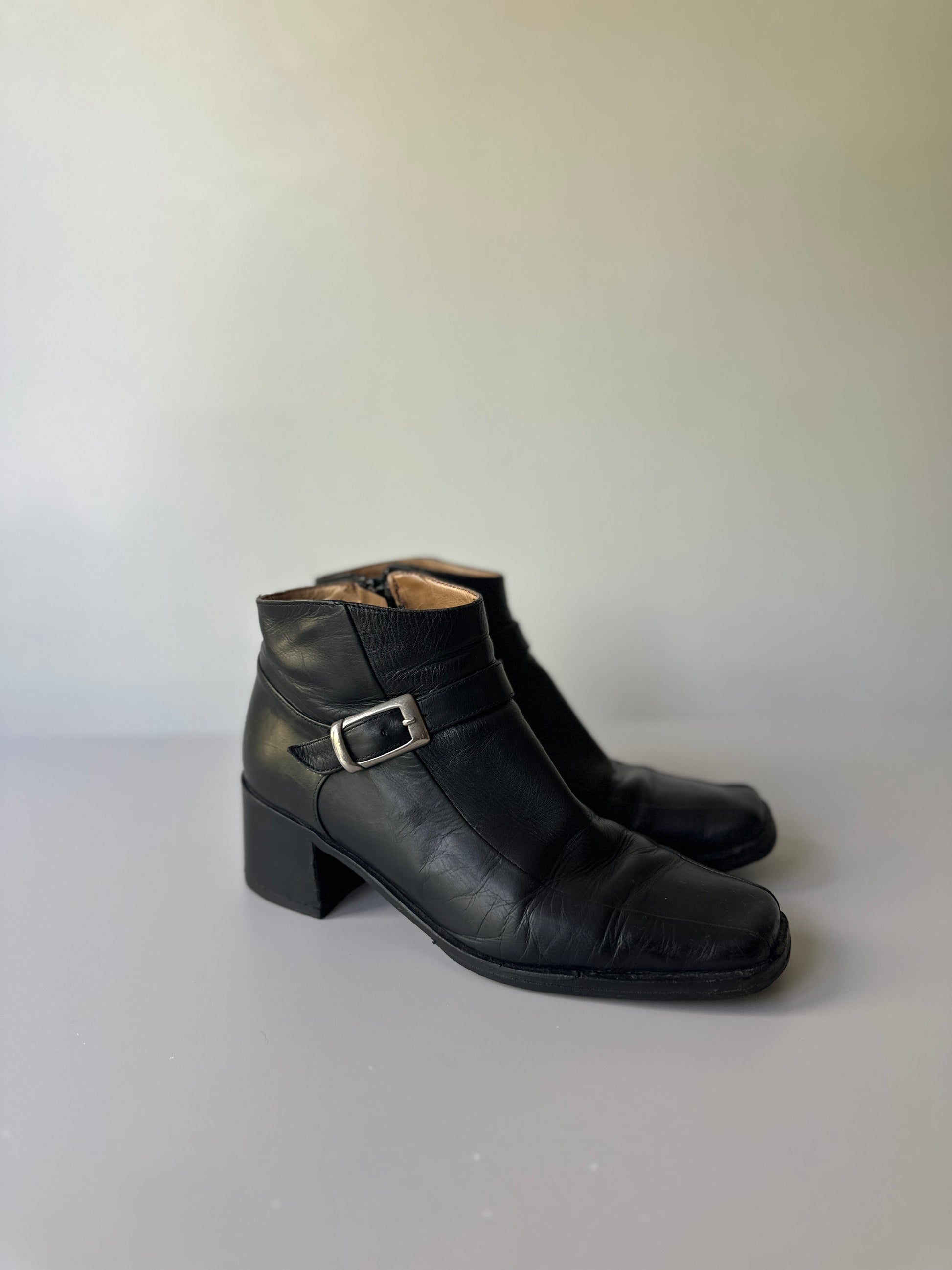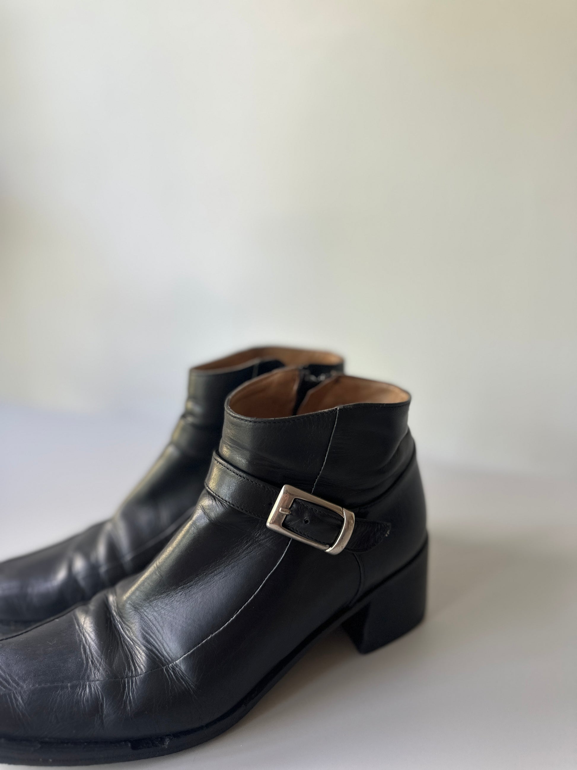 description. a fantastic pair of vintage black leather ankle boots. the front strap detail and silver buckle hardware, with the square toe and panel stitching. the lining is a tan coloured leather, and there is also a zipper on the inner part of the boot.