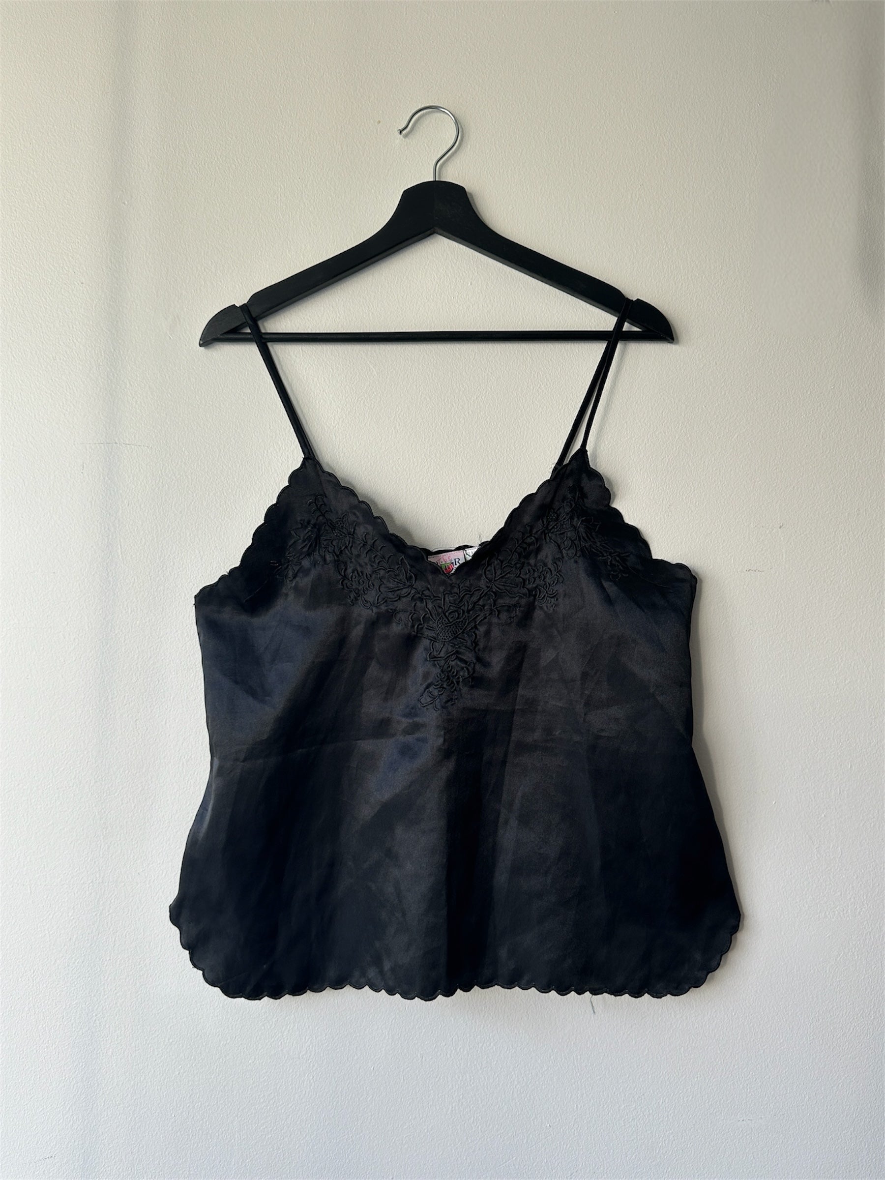 description. a lovely sating night blouse that you can wear either to bed, or on a night out- depending on the outfit. this is a solid black colour and has some wonder4ing stitched embroidery on the neckline, with a scalloped hem both top and bottom. the adjustable straps are perfect for different body shapes and to be honest, this suits about any one