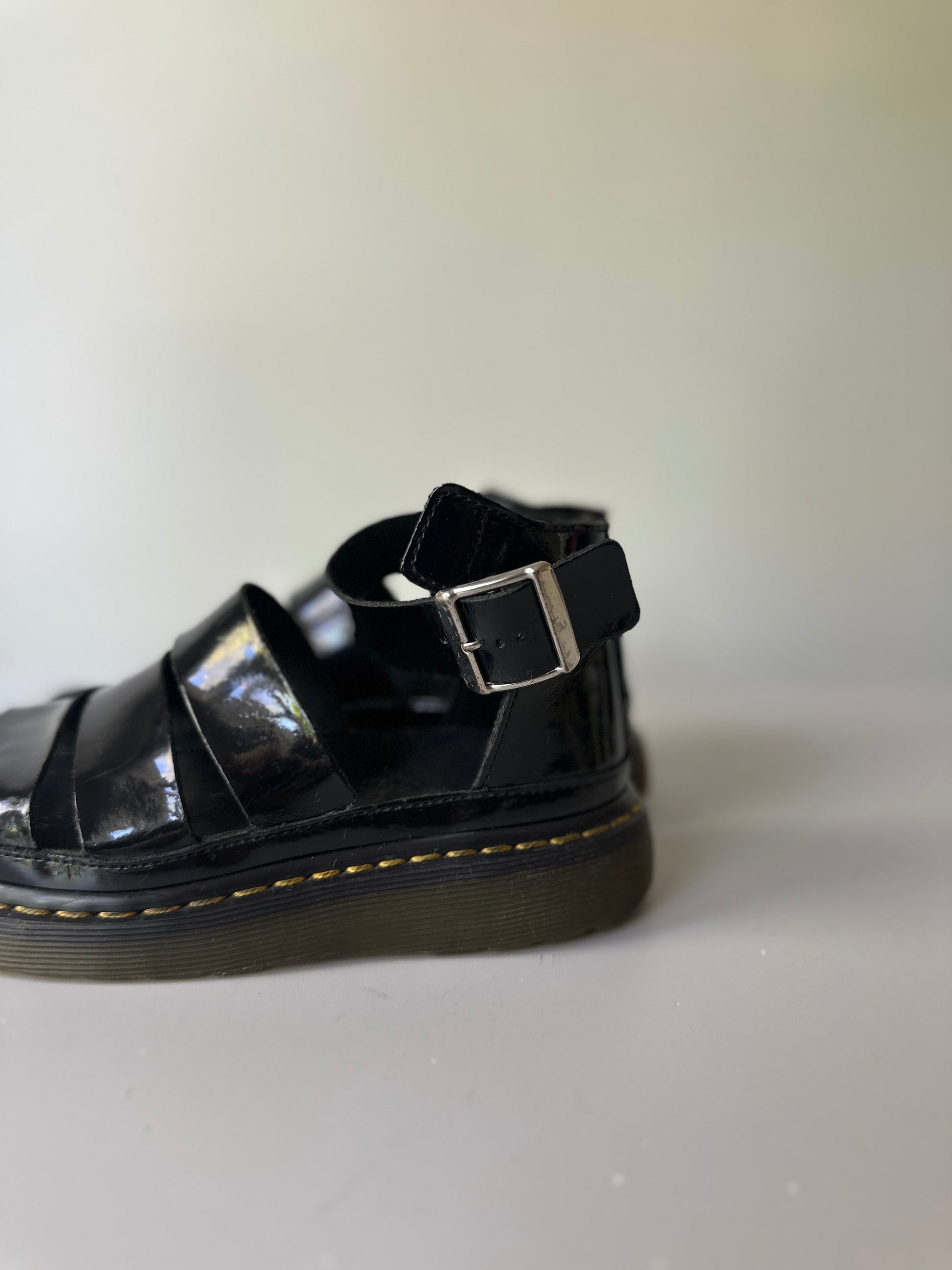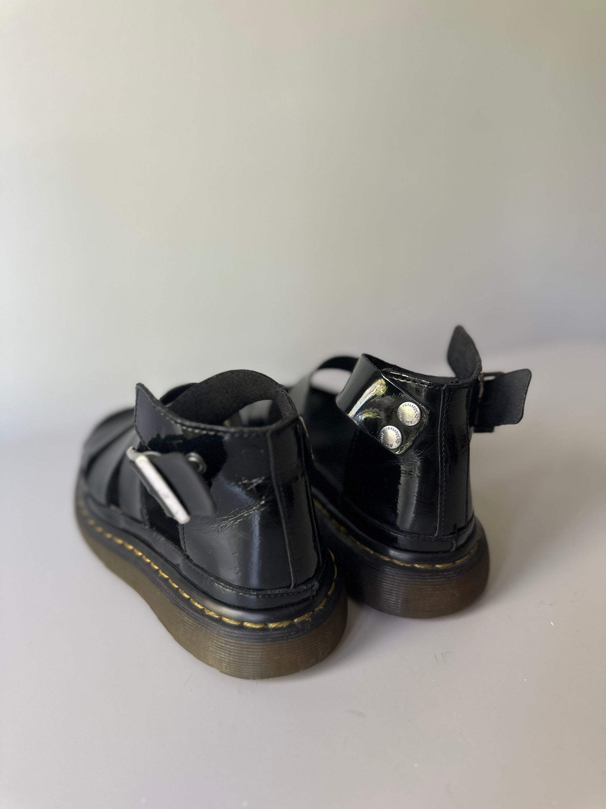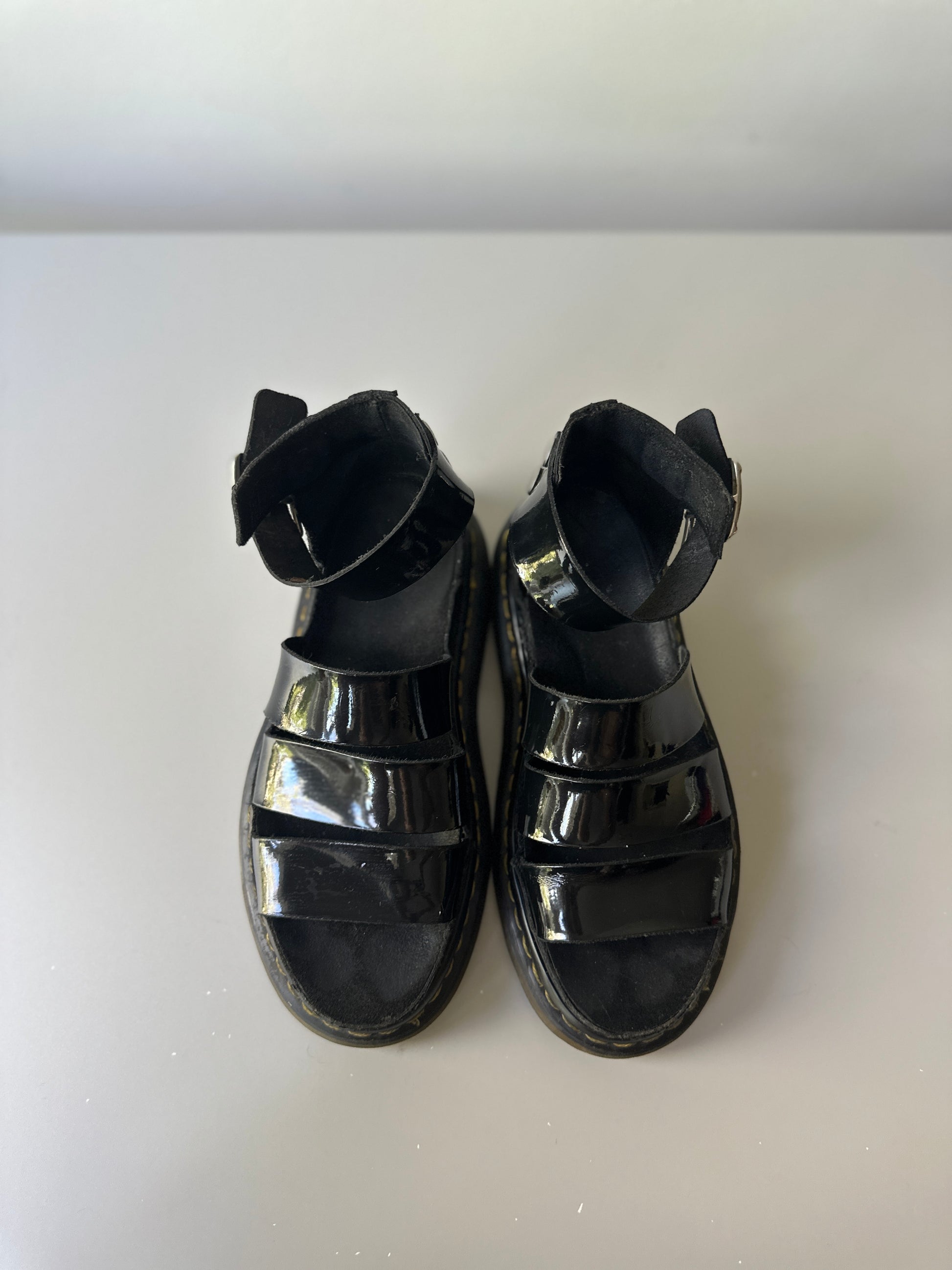 description. just a pre-loved pair of Doc sandals, hard to find online. the shoe style is Clarissa II, patent leather with a silver buckle hardware.