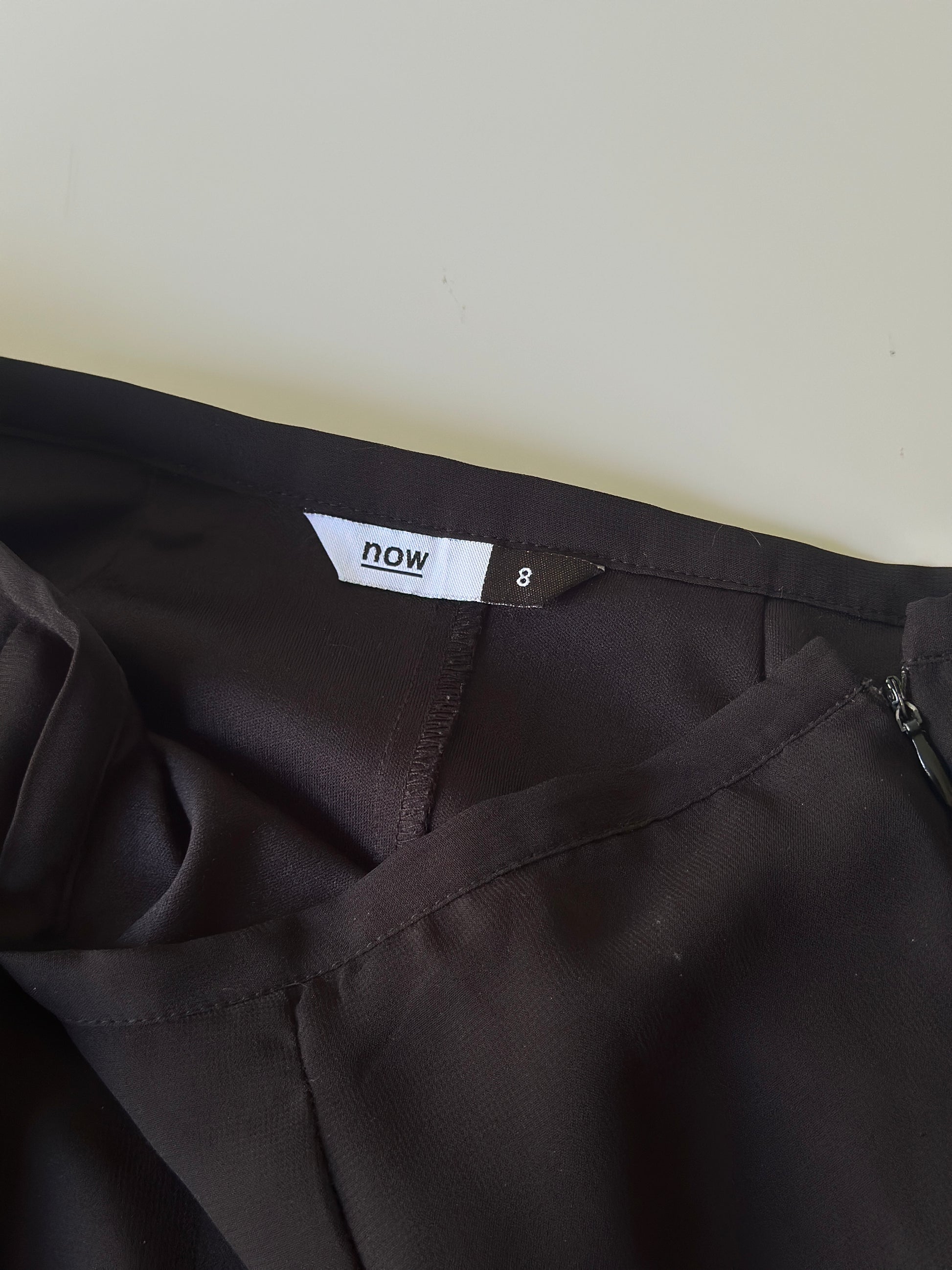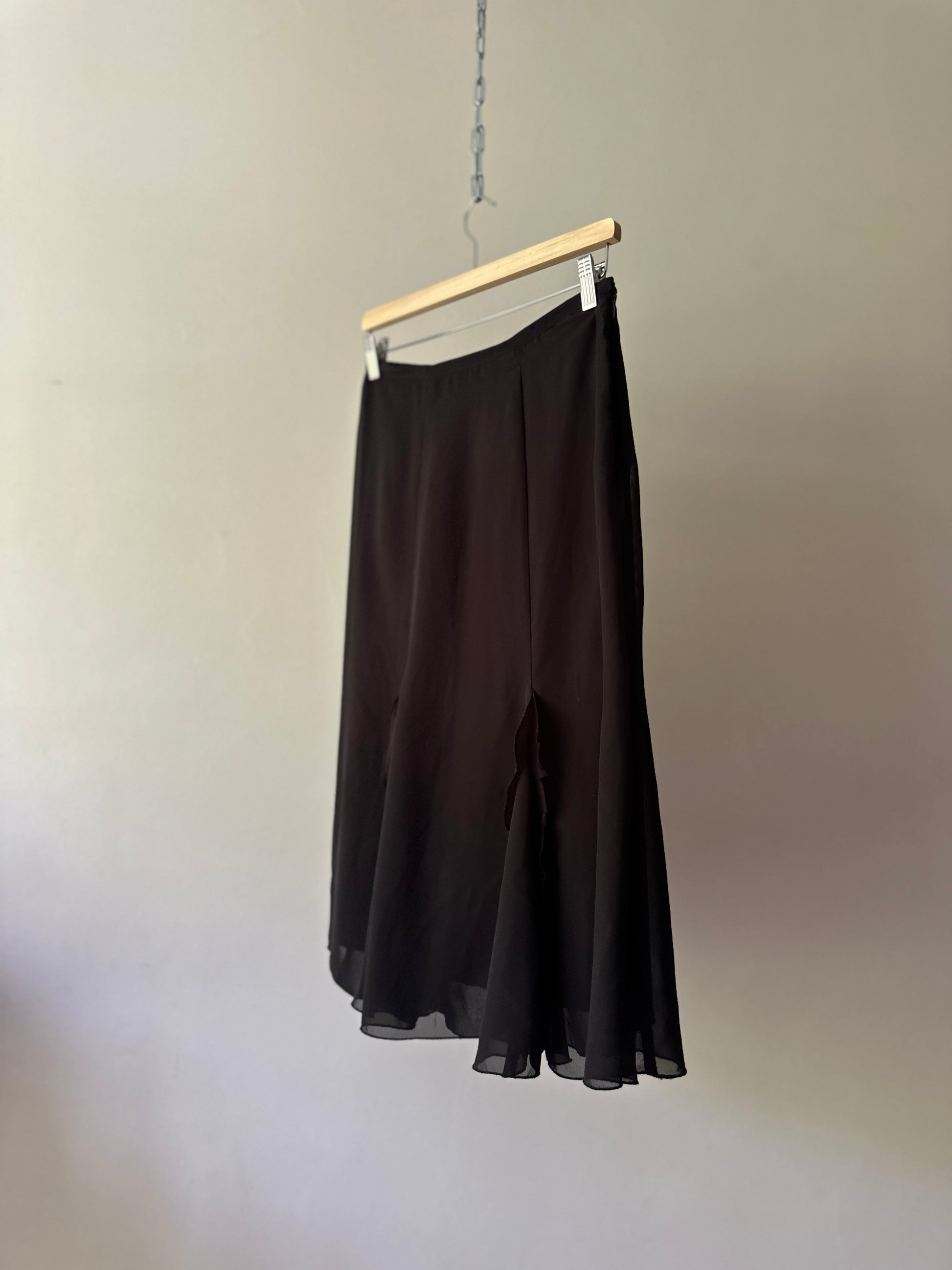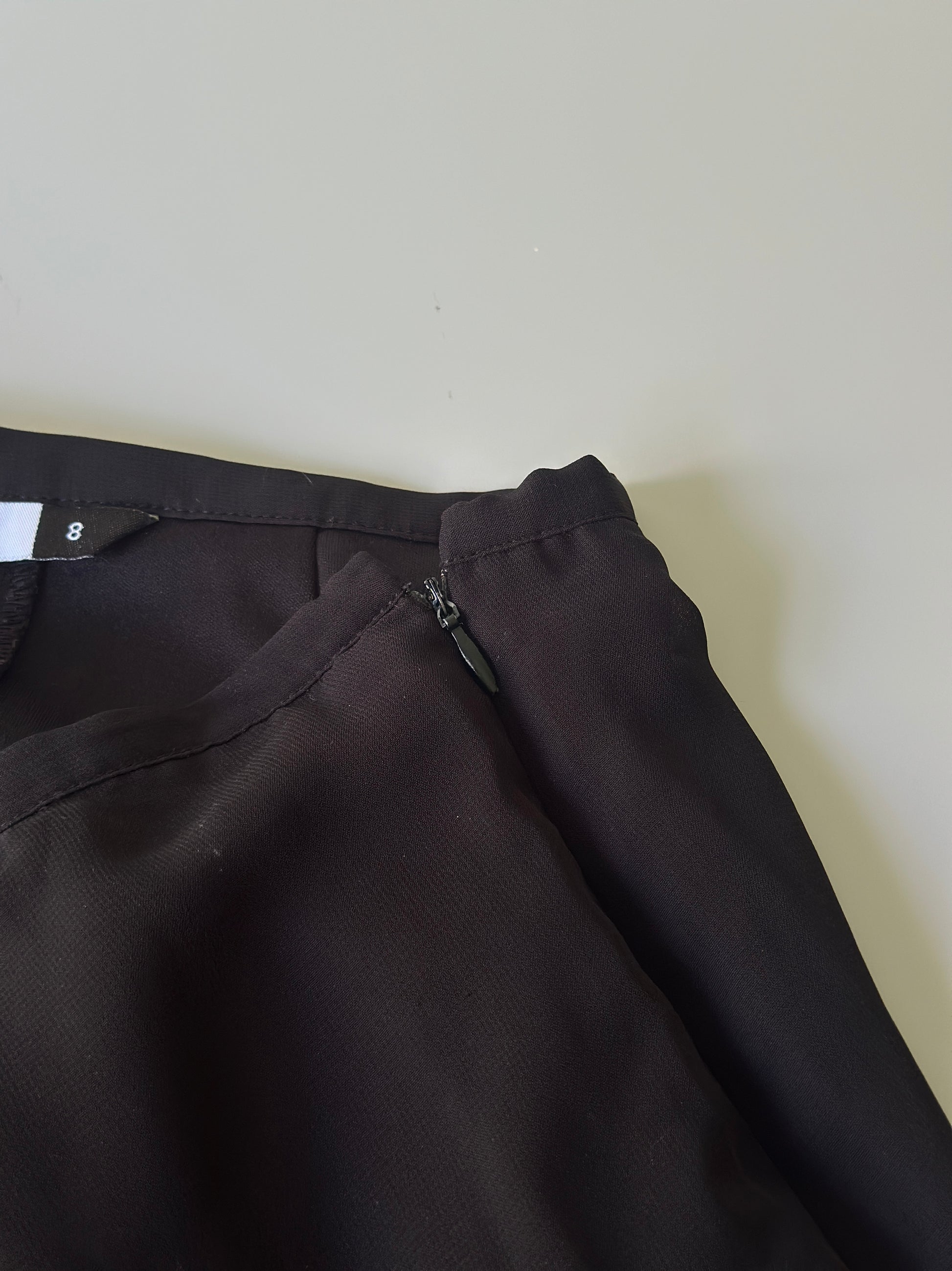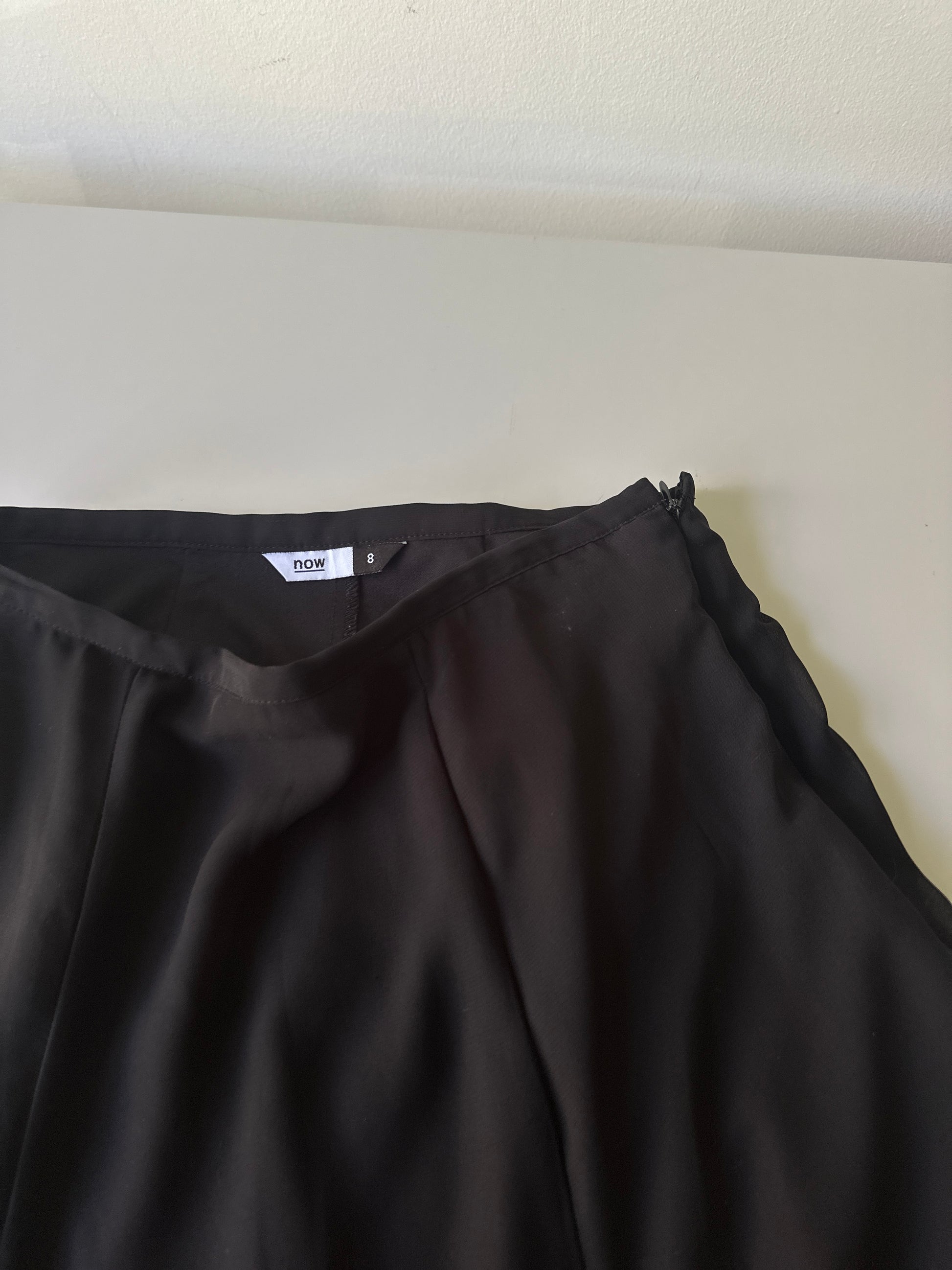 description. a mid-length black skirt with sheer outer lining and four pleats of ruffles around the front and back, with a very thin waist band, can be worn high or low waisted depending on your measurements