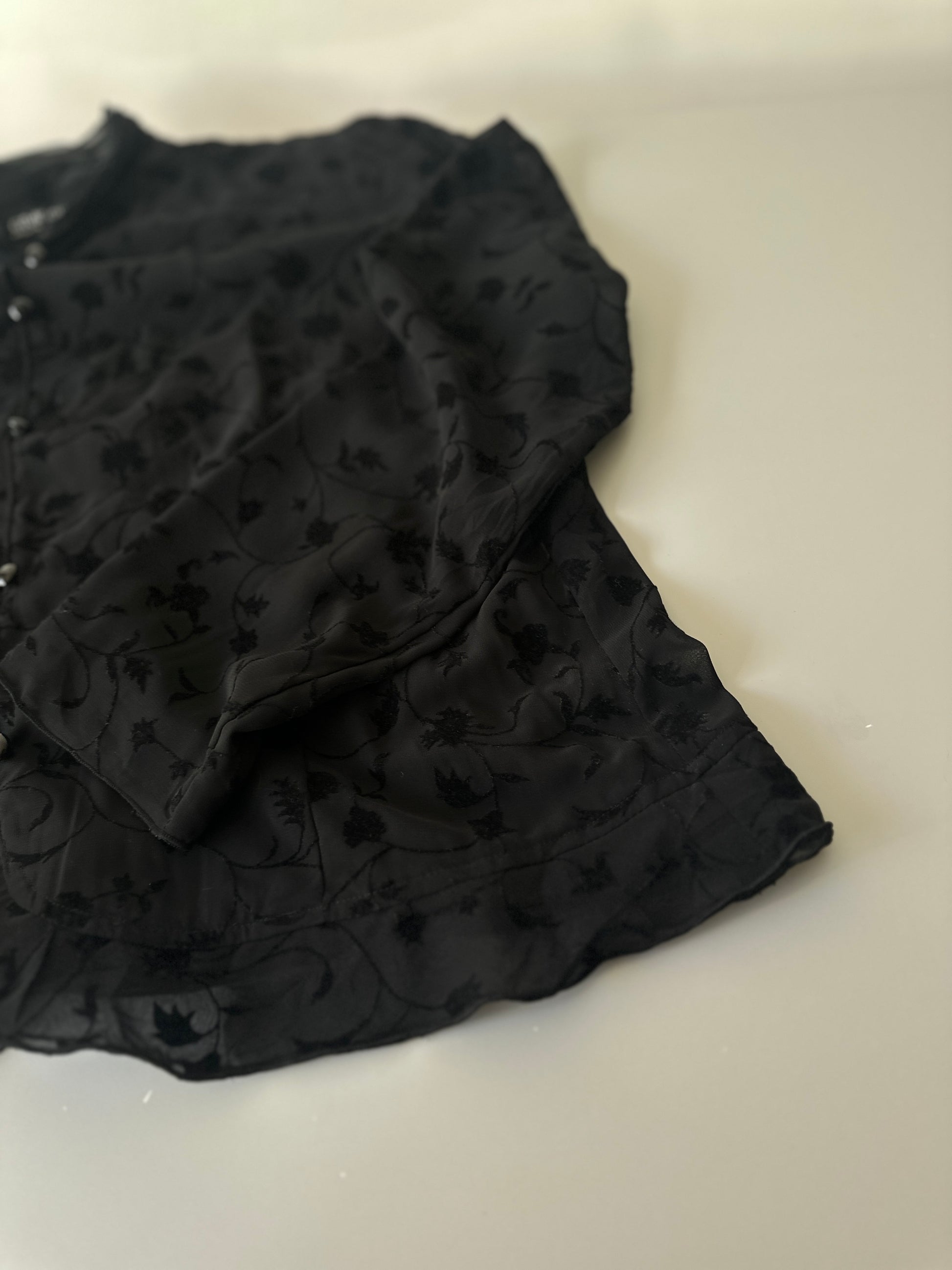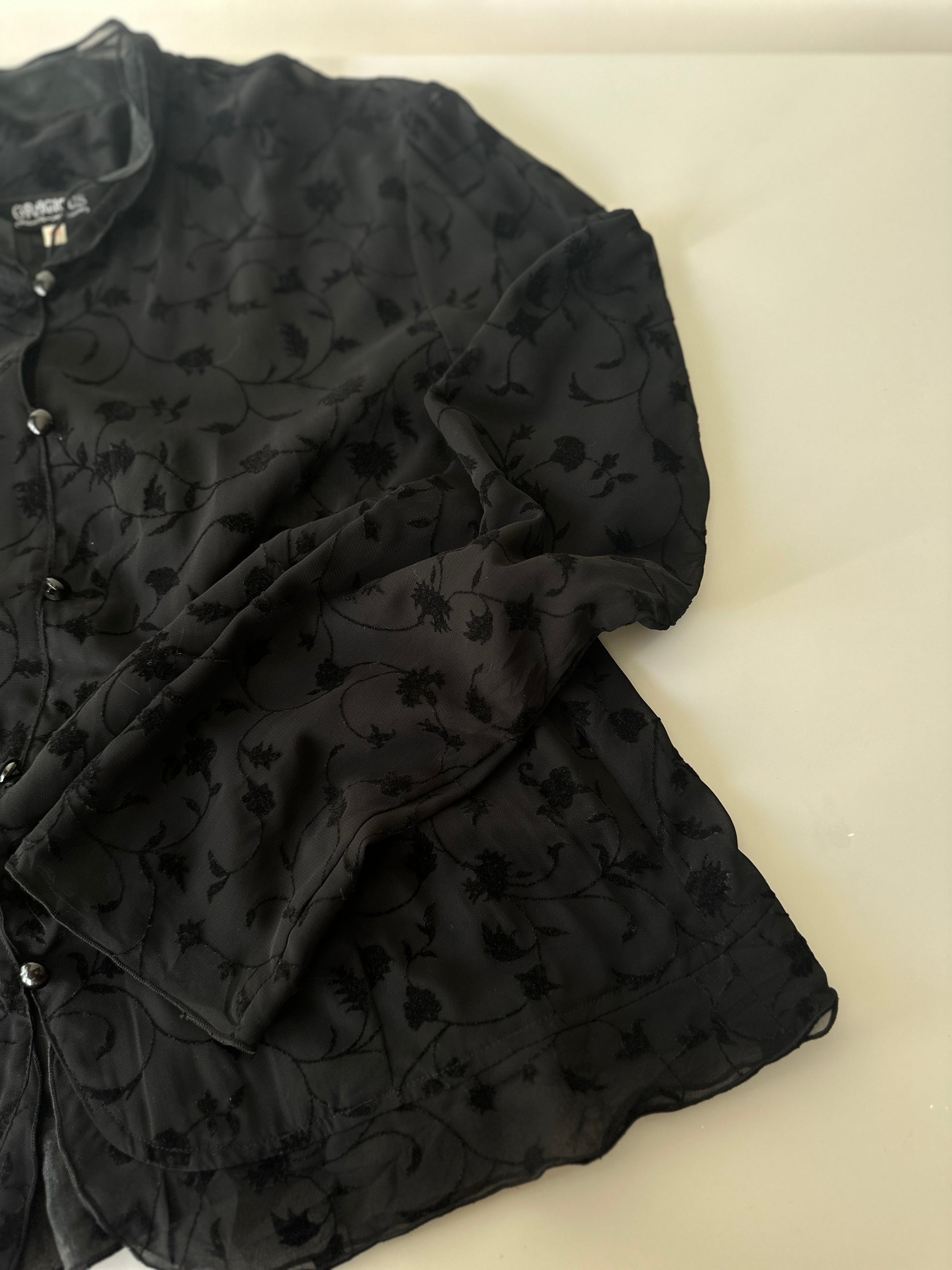 description. a beautiful sheer black button up with velvet pattern and detailing, the collar is a double collar and looks super cute. all the details on this blouse are so cute and special- the buttons don't all the way up give it a certain vibe, then unbuttoning just the top on allows for a larger collar to appear giving it another look.