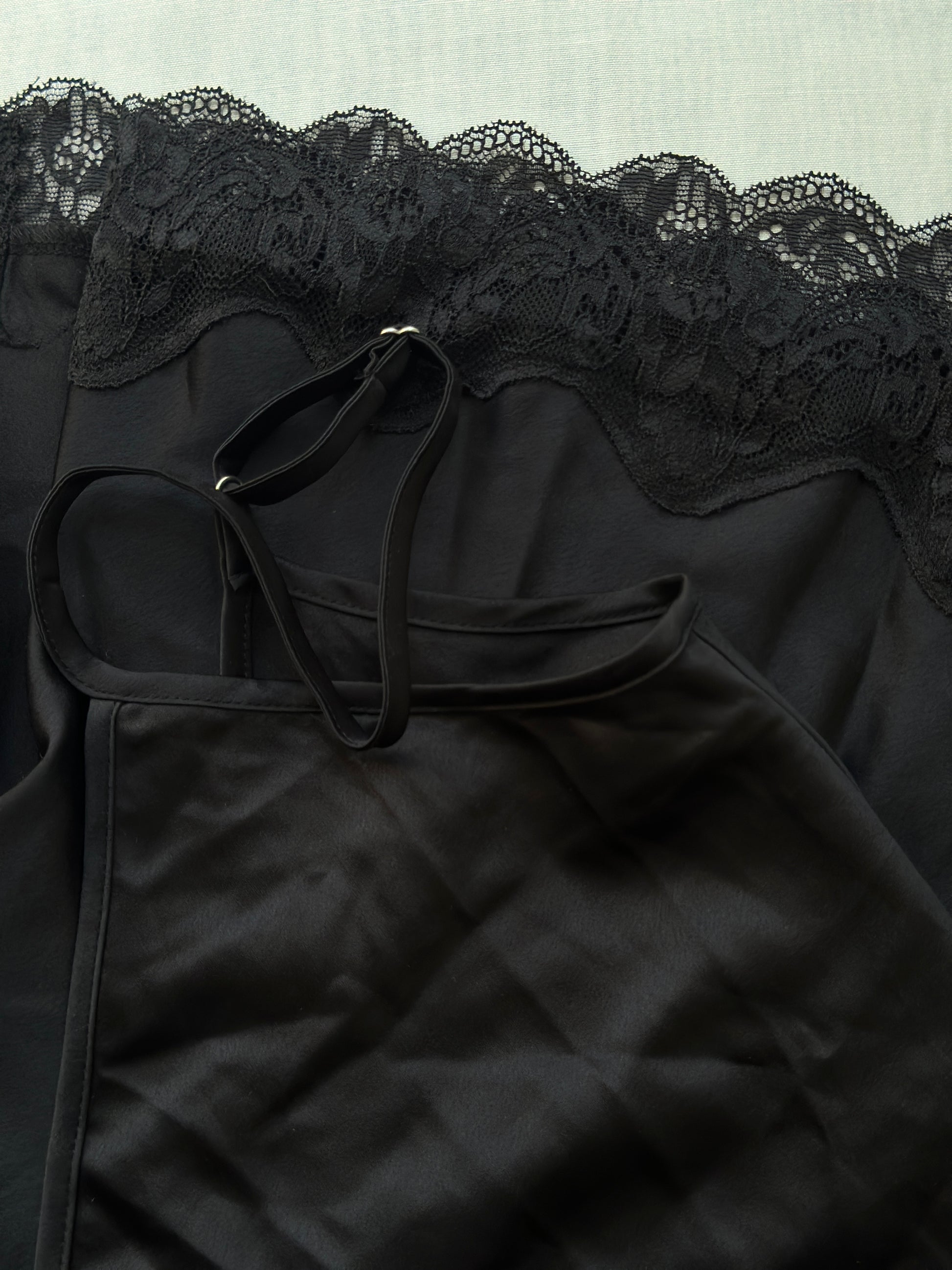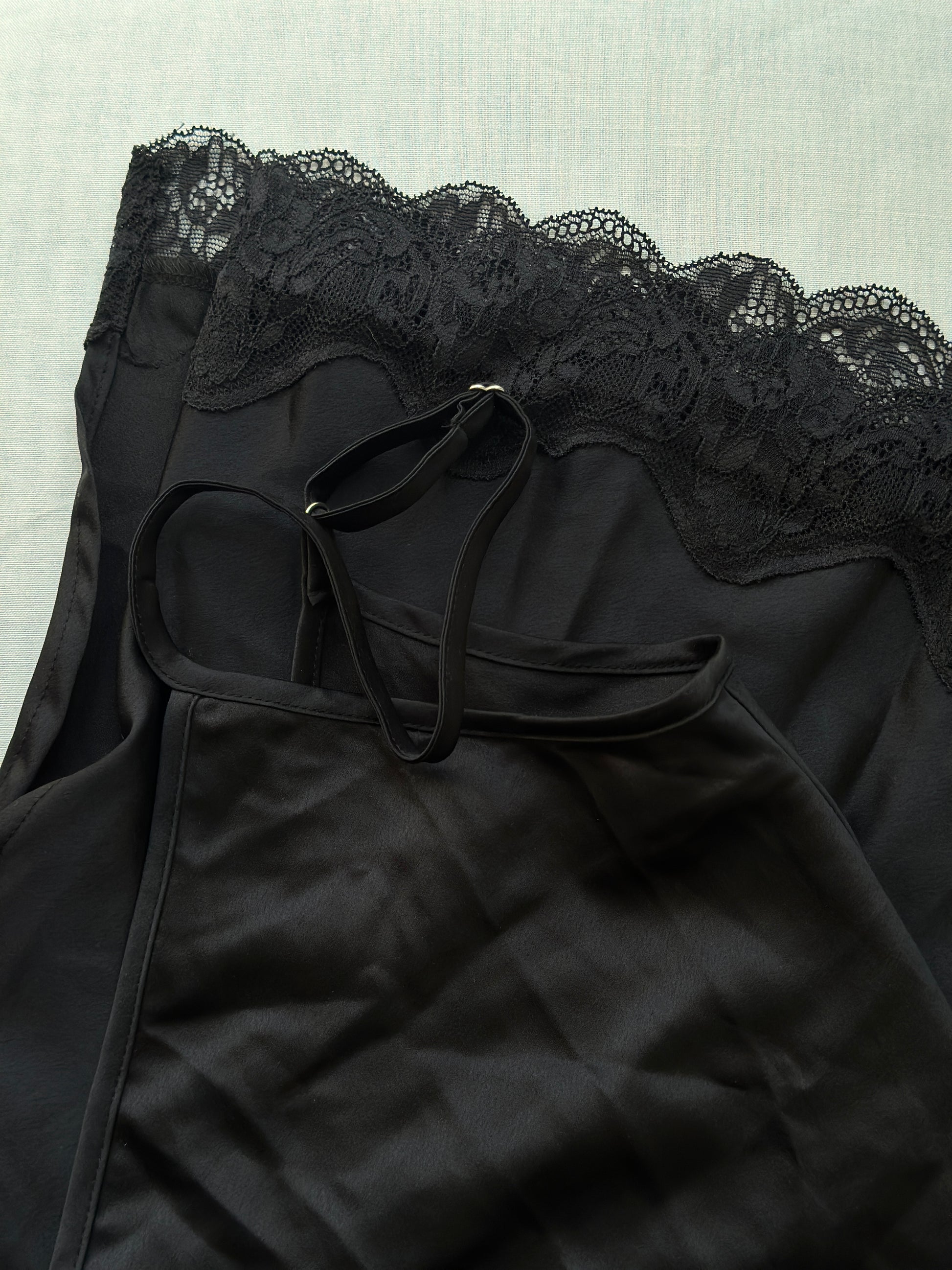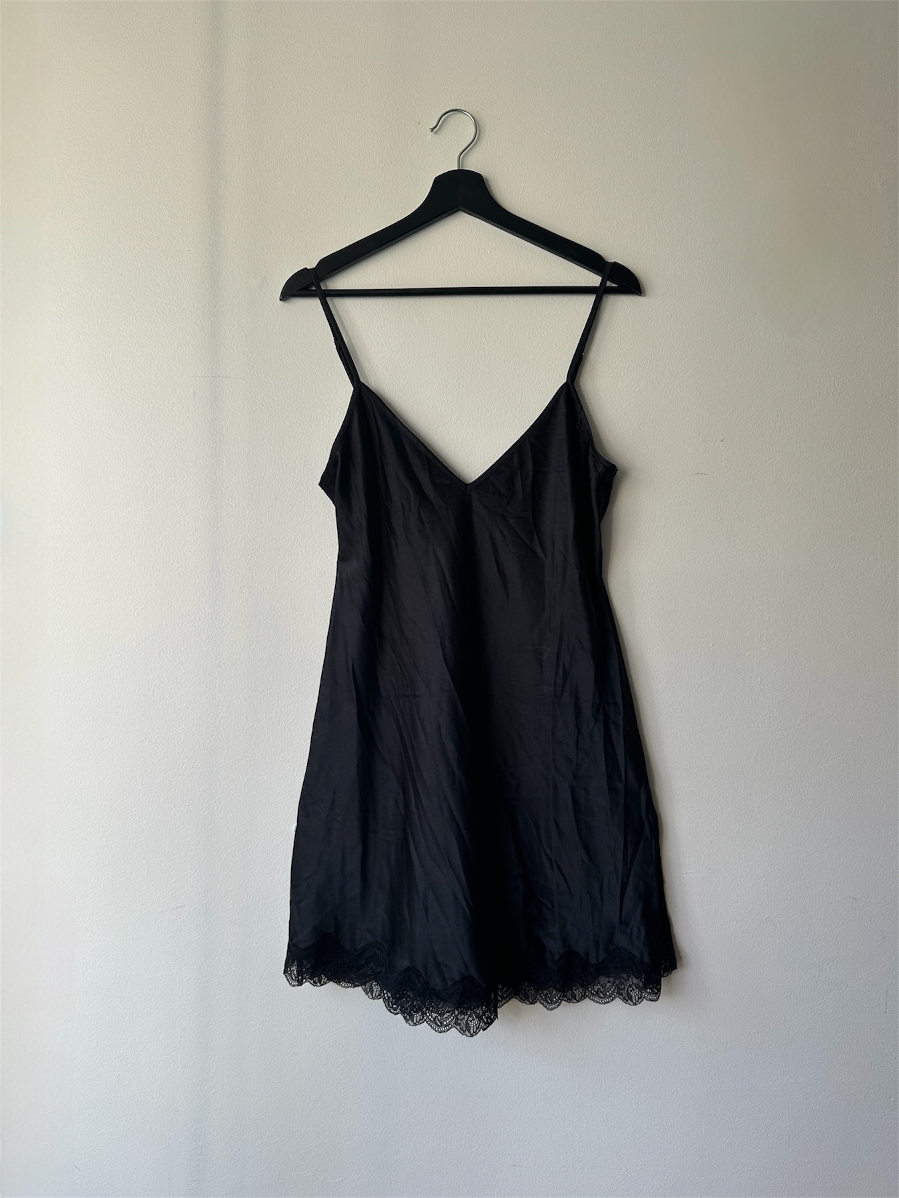 description. a beautiful short sating night gown, with lace details on the bottom hem, a small slit and bias cut to fit perfectly on the body