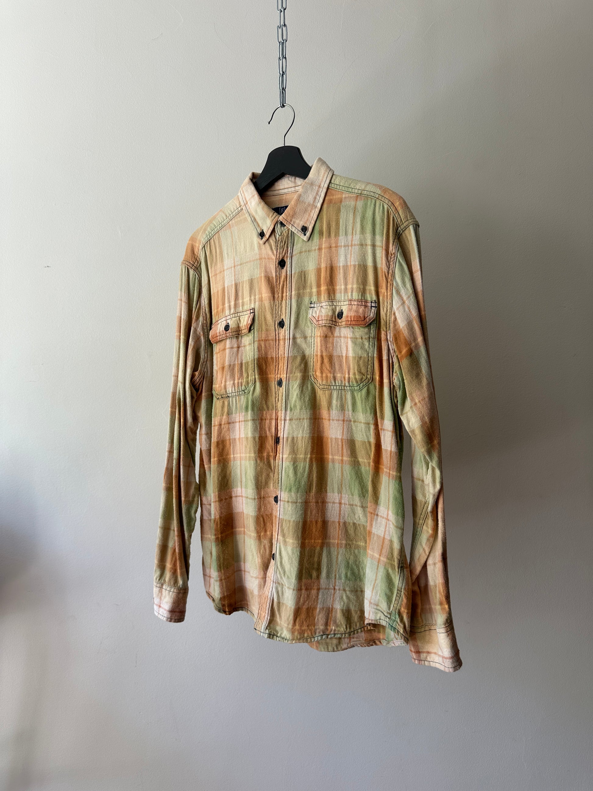 description. I bleached this flannel myself, so there are some areas that didn't take. but if you're looking for that vintage, worn, faded look it's a perfect addition to the button up closet