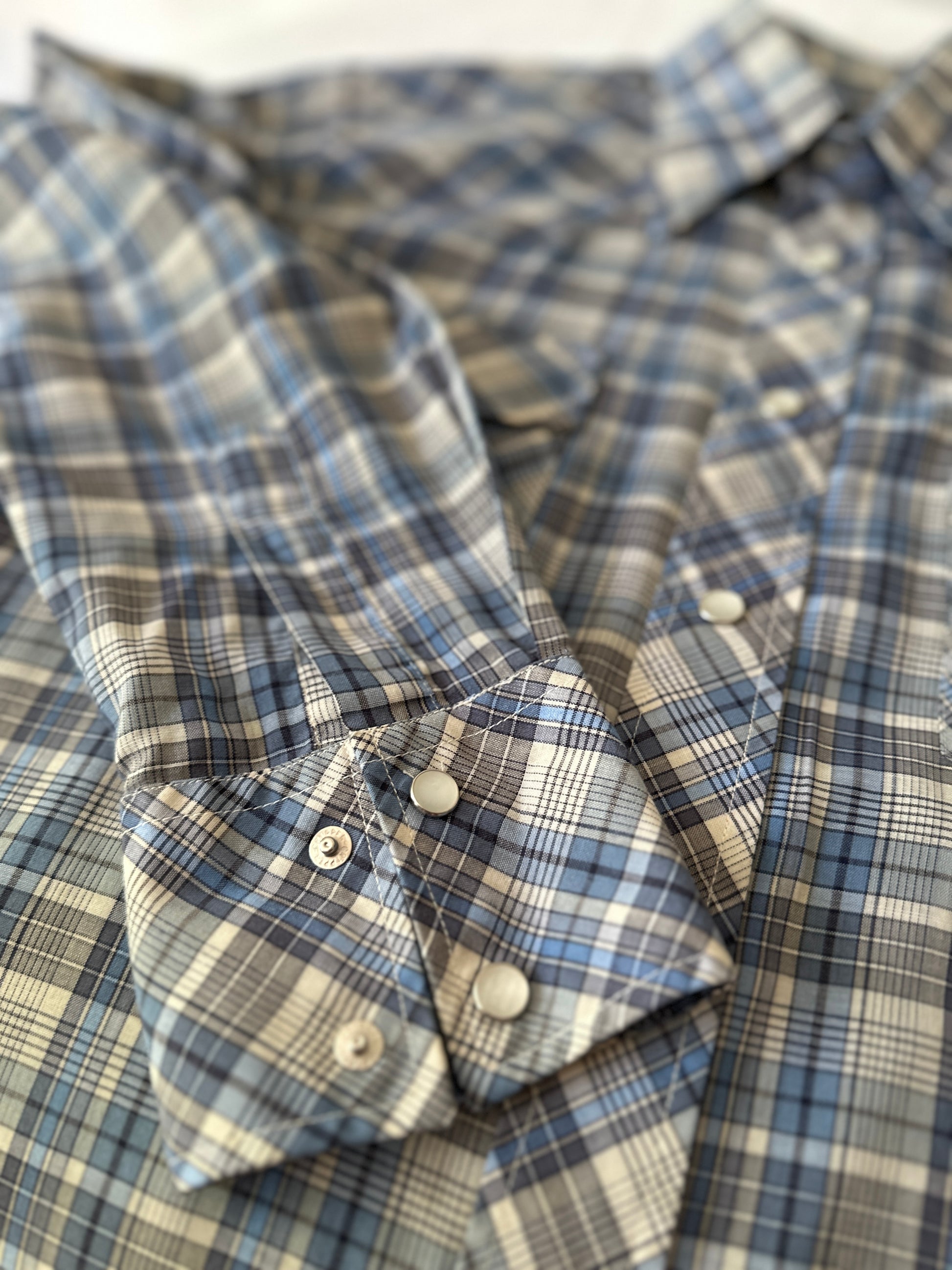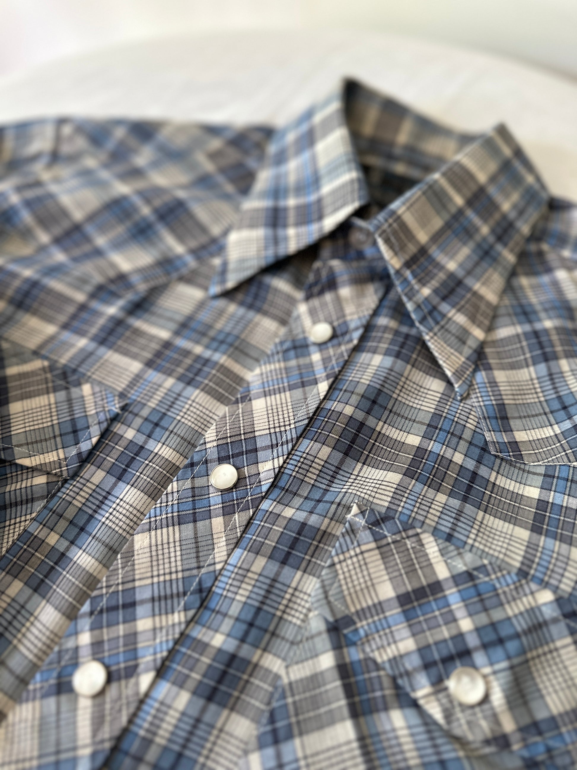 description. a very true cowboy style button up with the iconic y2k penalised clip buttons all the way up, as well as on the front pockets. we also have the usual cowboy shape and stitching of the diamond vee shoulder details