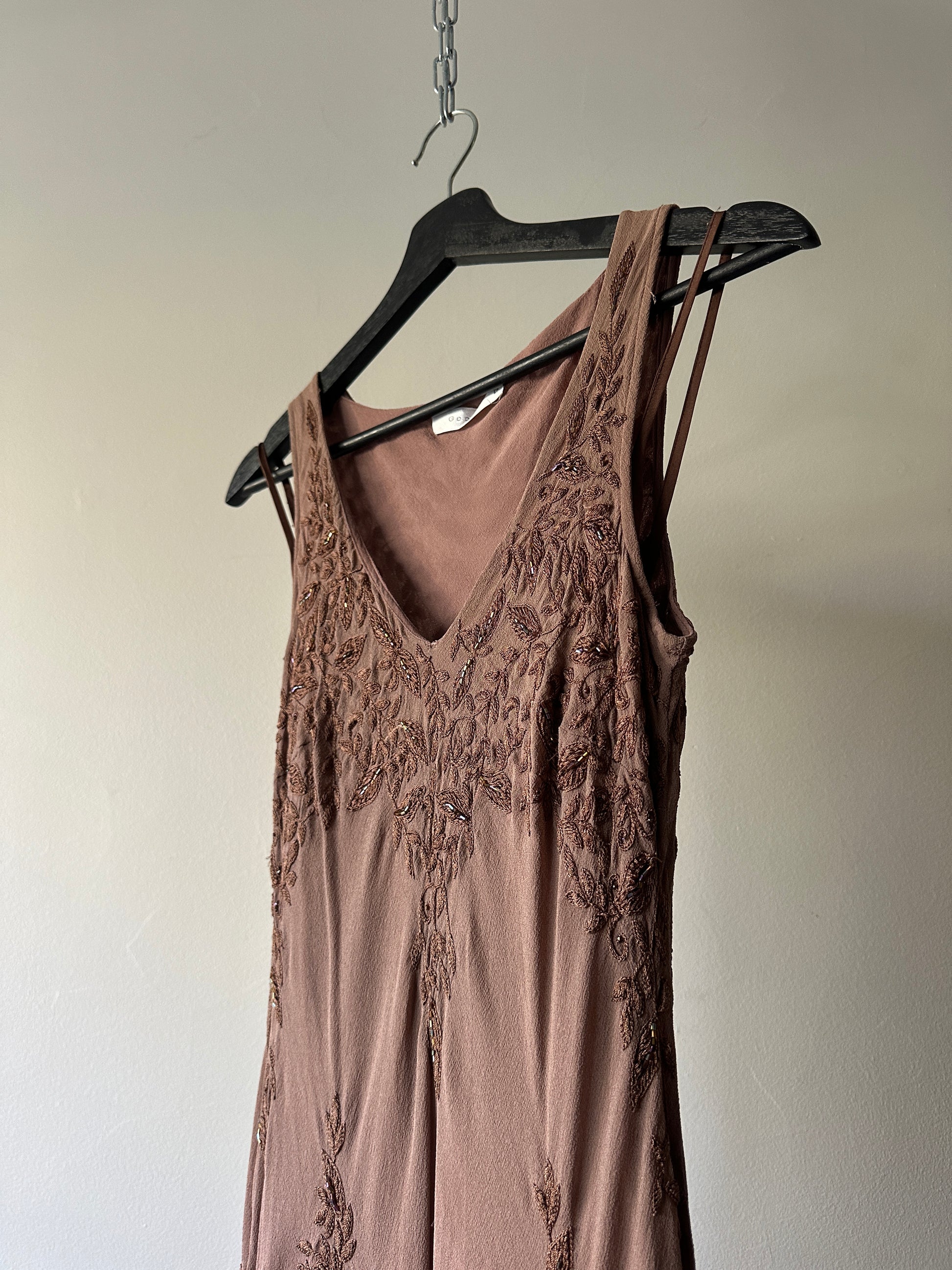 description. the perfect fairy dress, with an under slip. this is the cutest dress, such a dreamy brown colour-way and opaque beads all over the embroidered areas of the dress, not to mention the multiple slits at the front and back