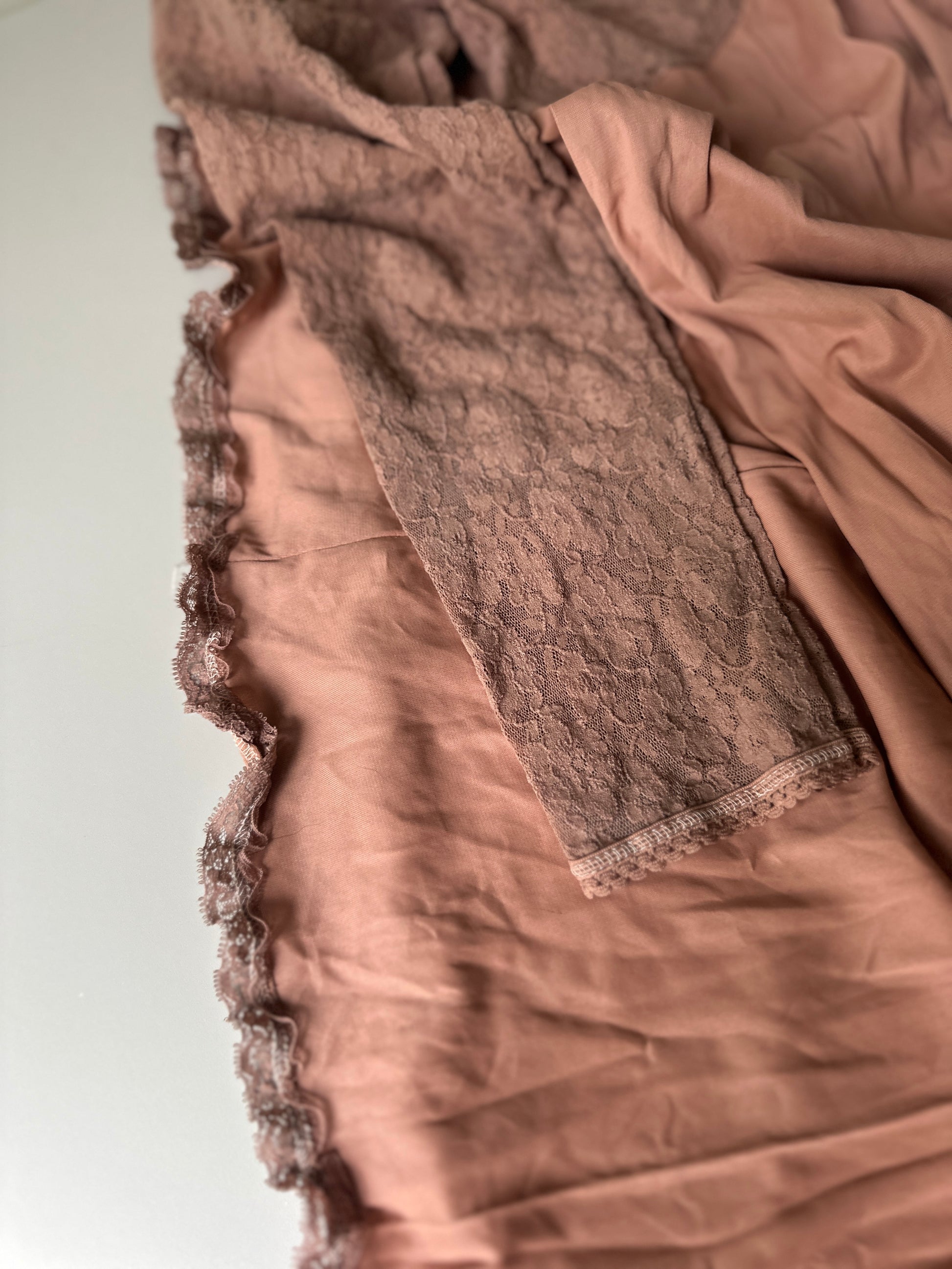 description. originally a cream/white coloured long sleeve slip with lace top and solid/sheer skirt line, dyed with a brown clothing dye. Made in Australia