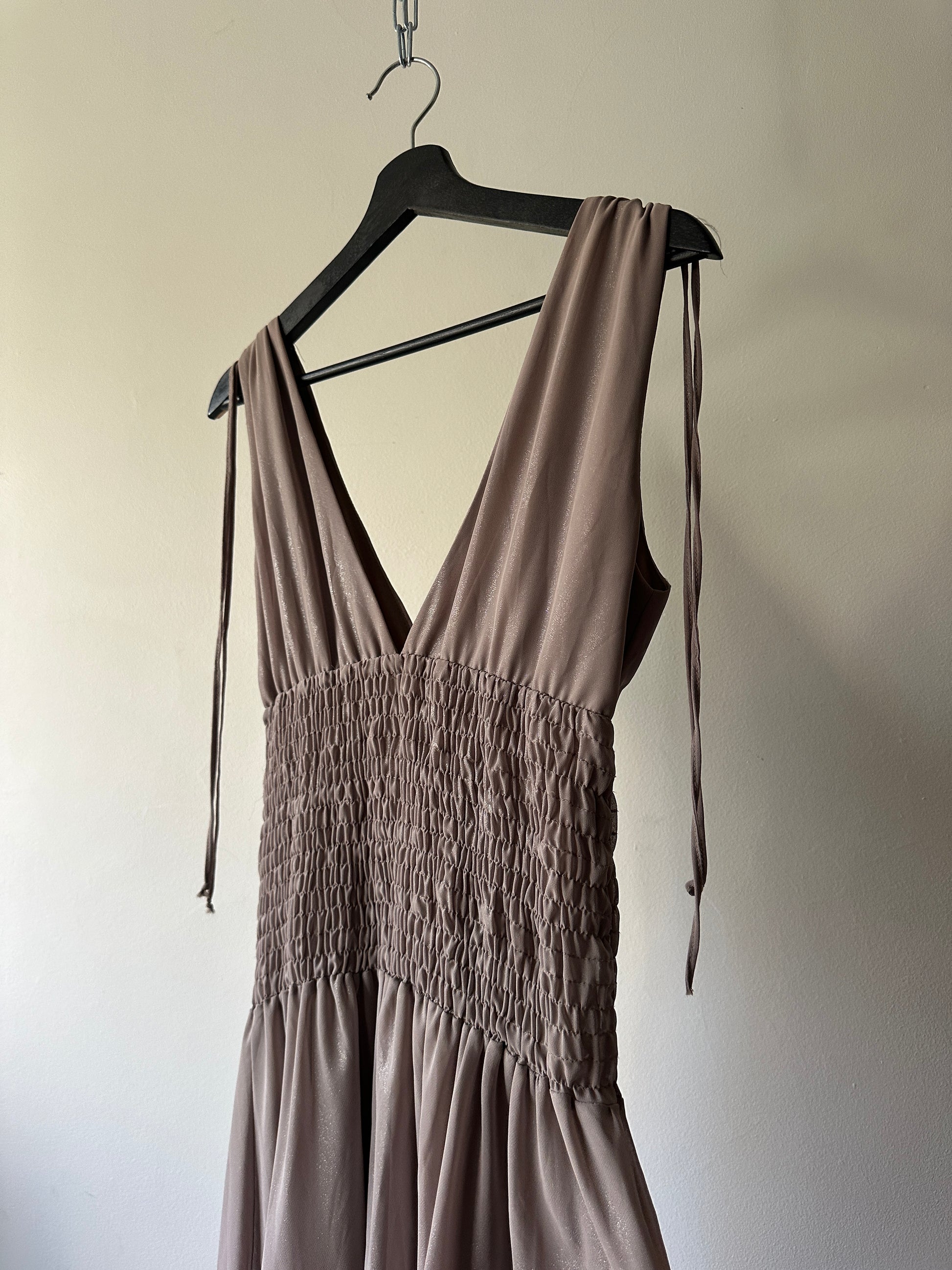 description. a great y2k party dress. the colour is stunning, brown with a slight shimmer to it, and the roached elastic waist, flowing out to a full babygirl skirt. not to mention the little ties on each shoulder with a super low v front and back