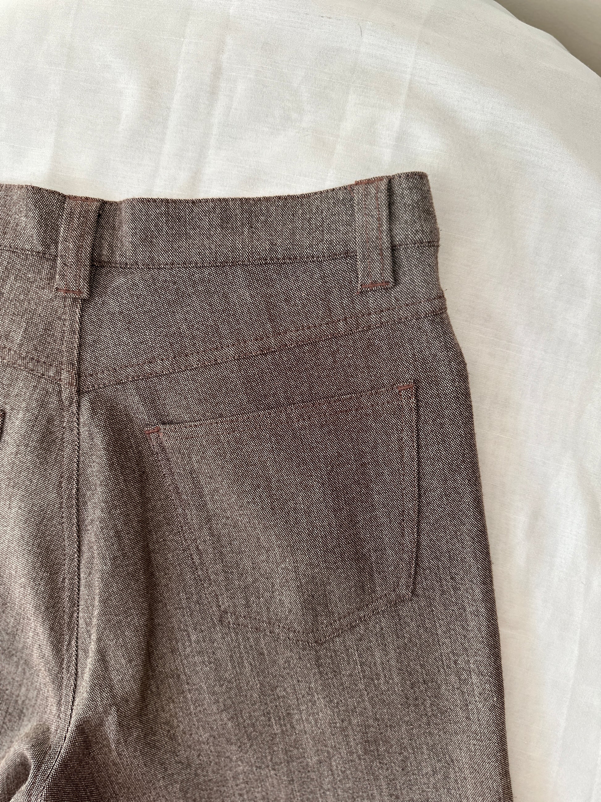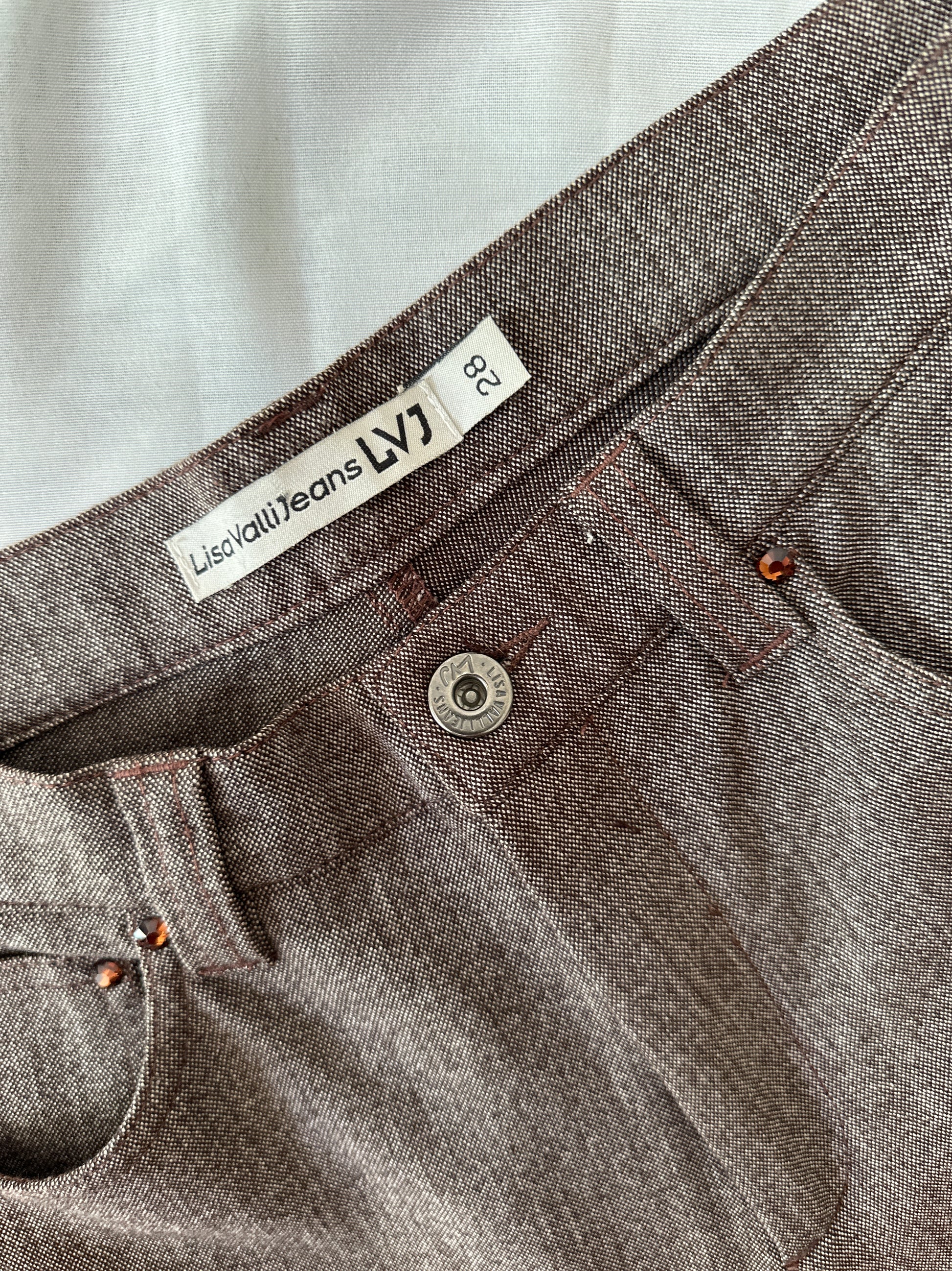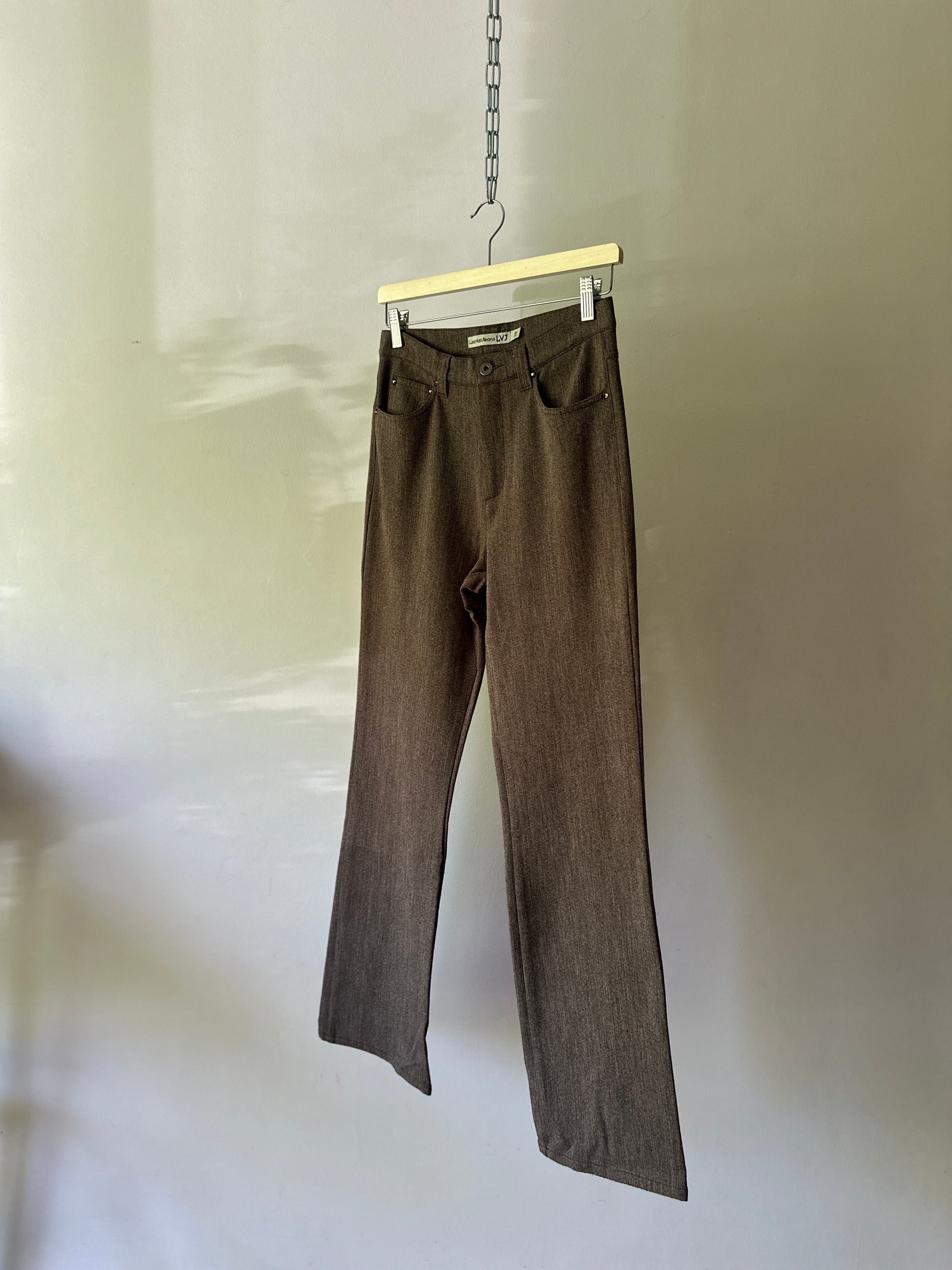 description. a fantastic pair of soft brown trousers, they have little stretch and maximum comfort. high waisted and straight legged, the best part about these pants are the stunning little brown rhinestone details on the front pockets