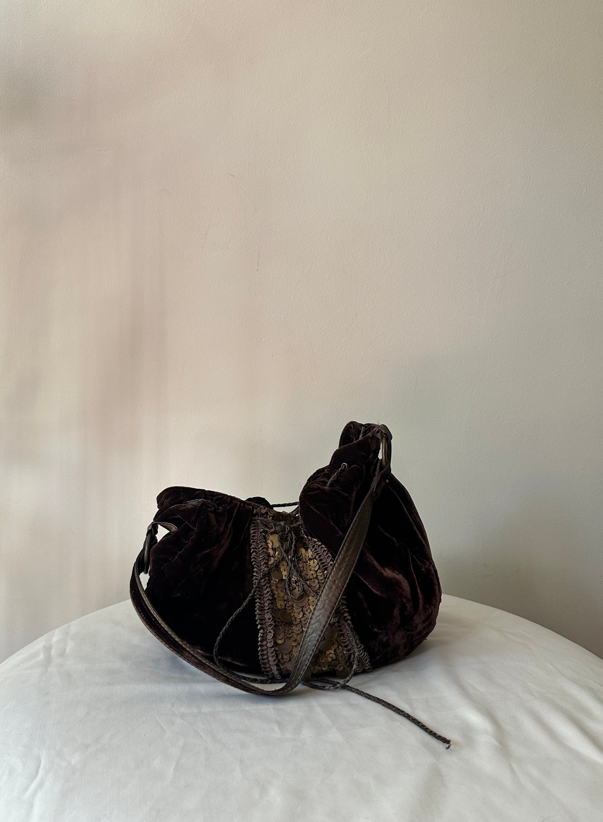 description. this is one from the personal collection but needs to find it's loving home because this handbag is absolutely beautiful. the brown velvet and brass details make it super special, yes it can be perceived as 'boho' but it can be versatile for any personal style and it holds so much, while also look goddam fantastic on your arm