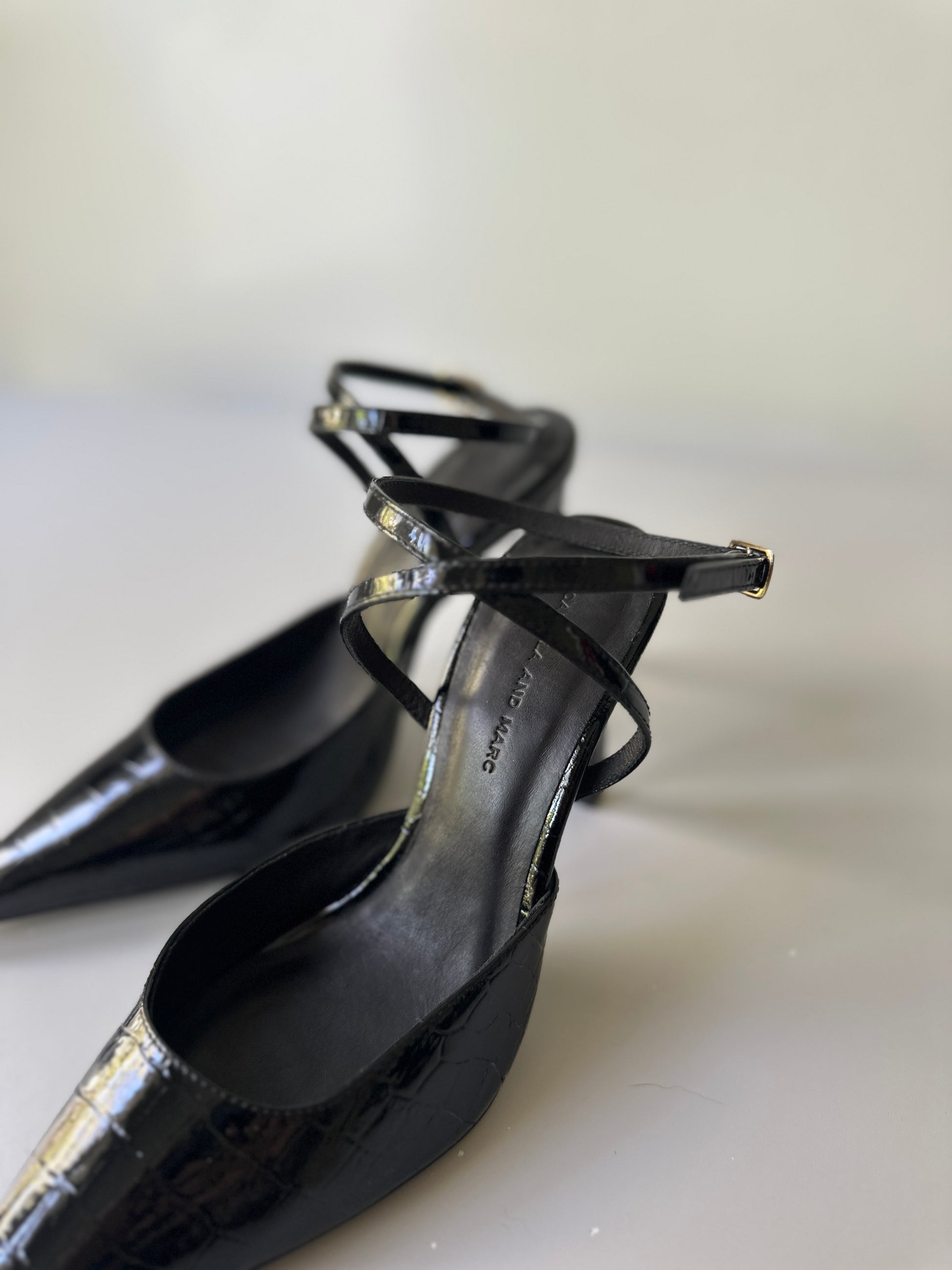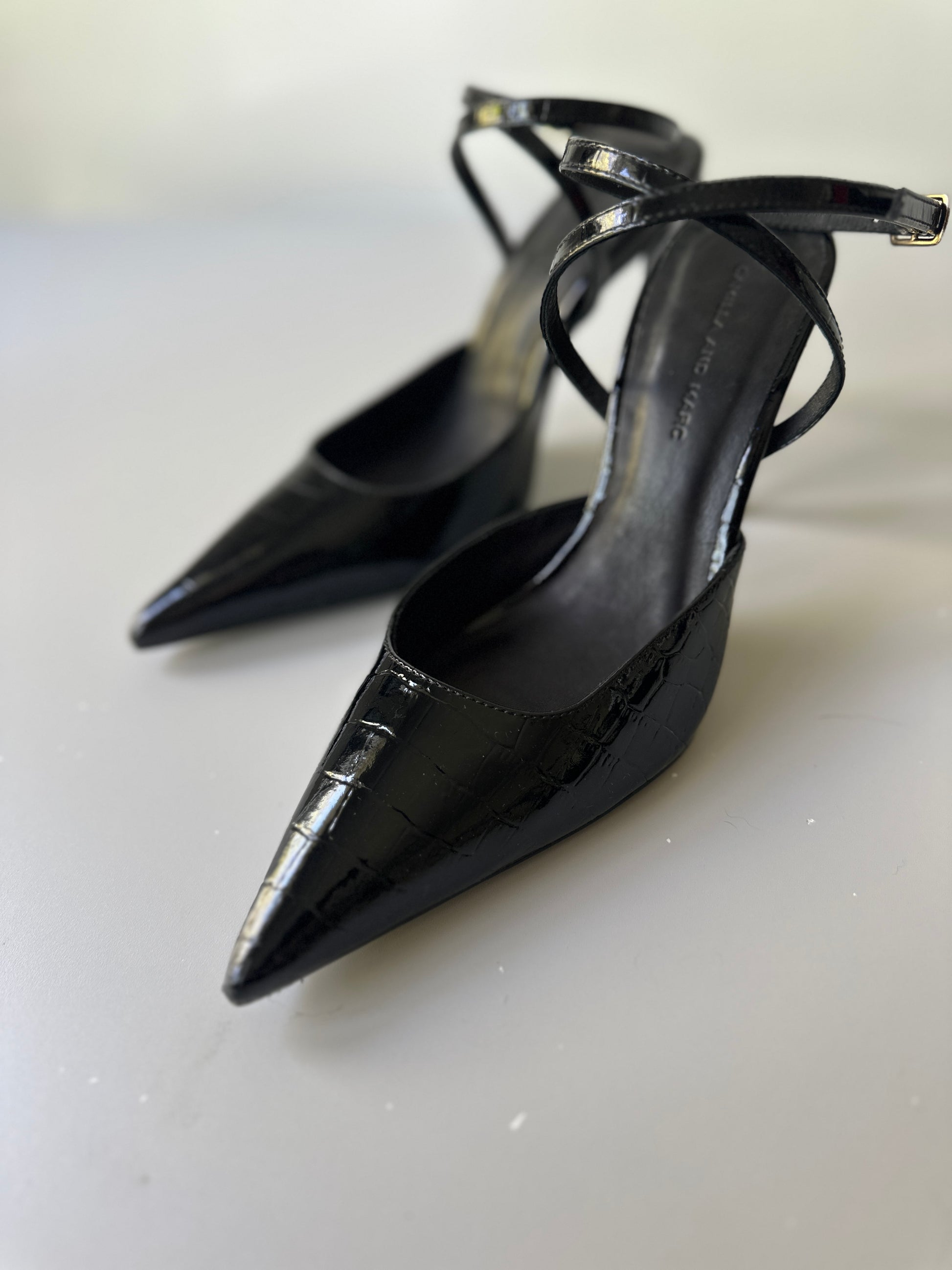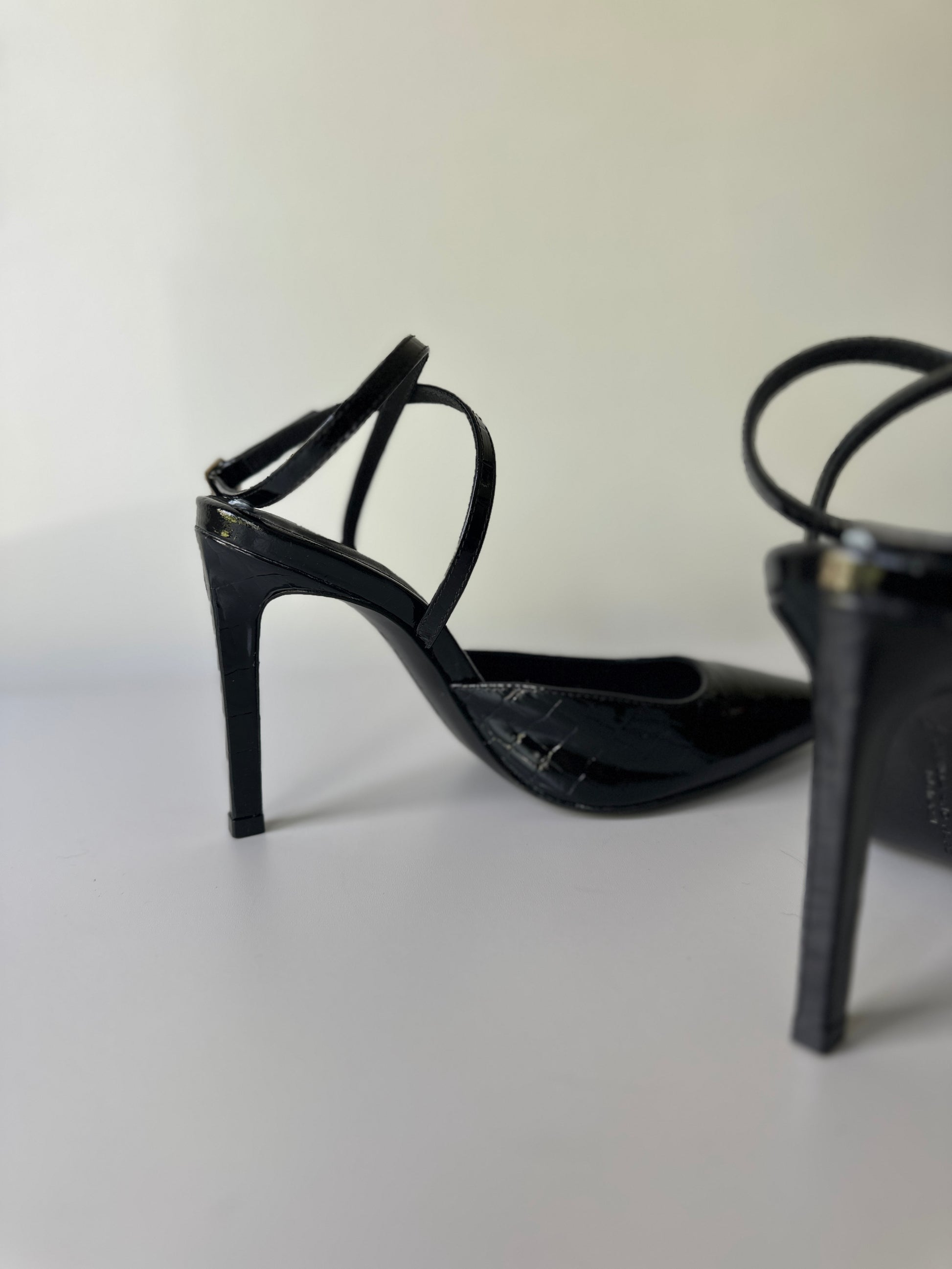 description. a fantastic pair of stiletto heels, black patent shine with a crocodile-like pattern. the straps cross over the arch and buckle on the outer side of the ankle.