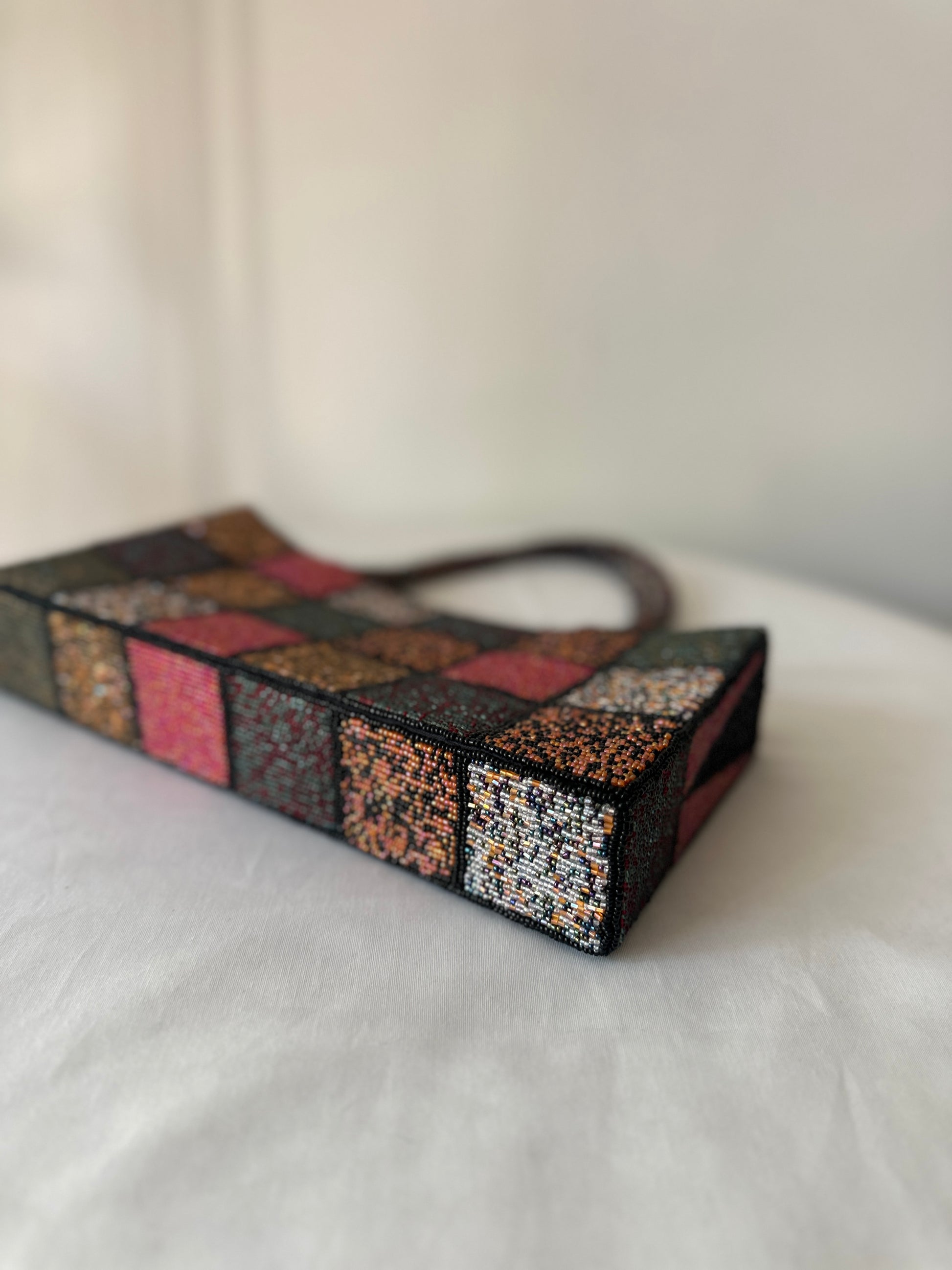 description. this is a definite statement piece for your closet. it has no brand or any details, but the quality is unmatched. it is so solid and so well made, you would be a fool not to want this as a part of your unique handbag collection- also the strap is completely beaded, such beautiful craftsmanship