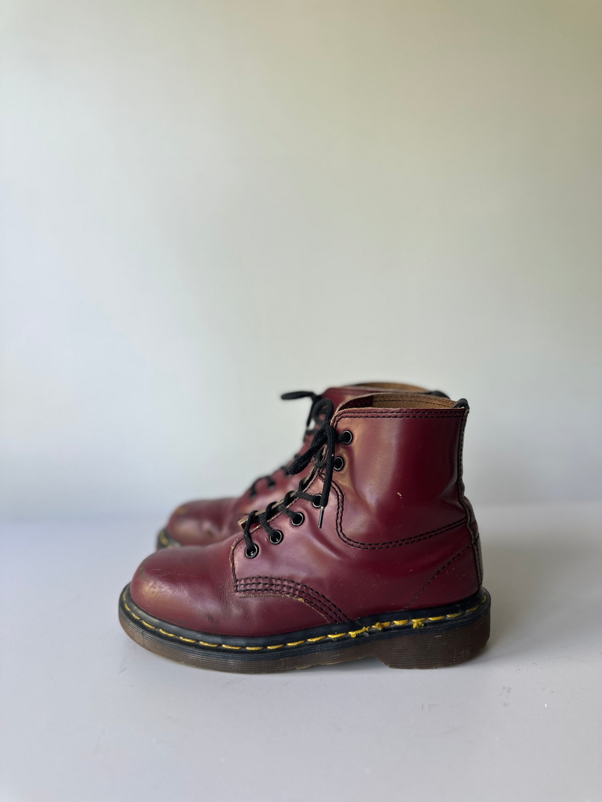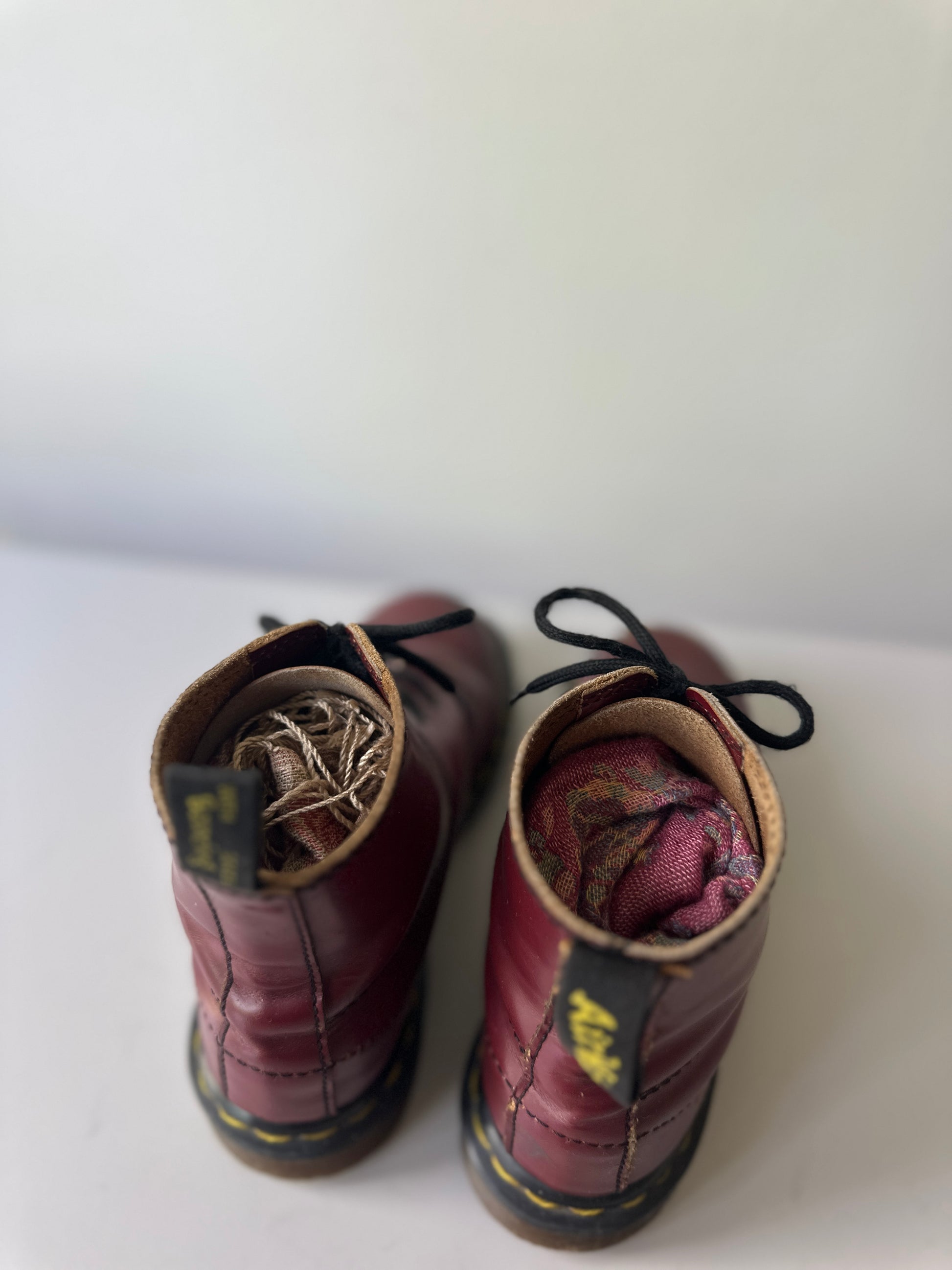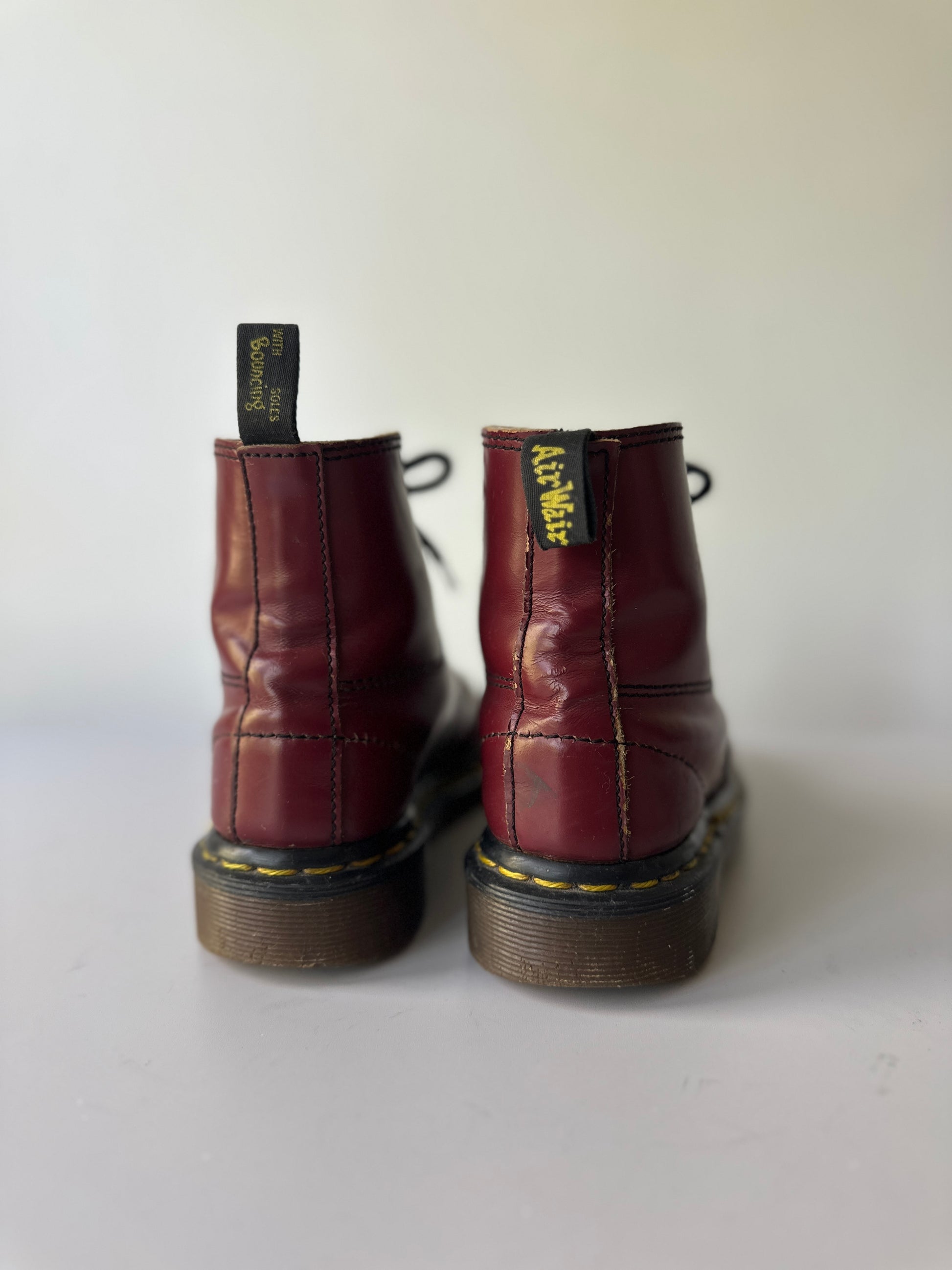 description. cherry red 1460 Dr. Martens!!!! these are so cool, we love these. they have visible signs of wear, only giving to the vintage aesthetic they originate from. the boot ending doesn't have the classic piped seal, this style definitely comes from 80s-90s. original black laces