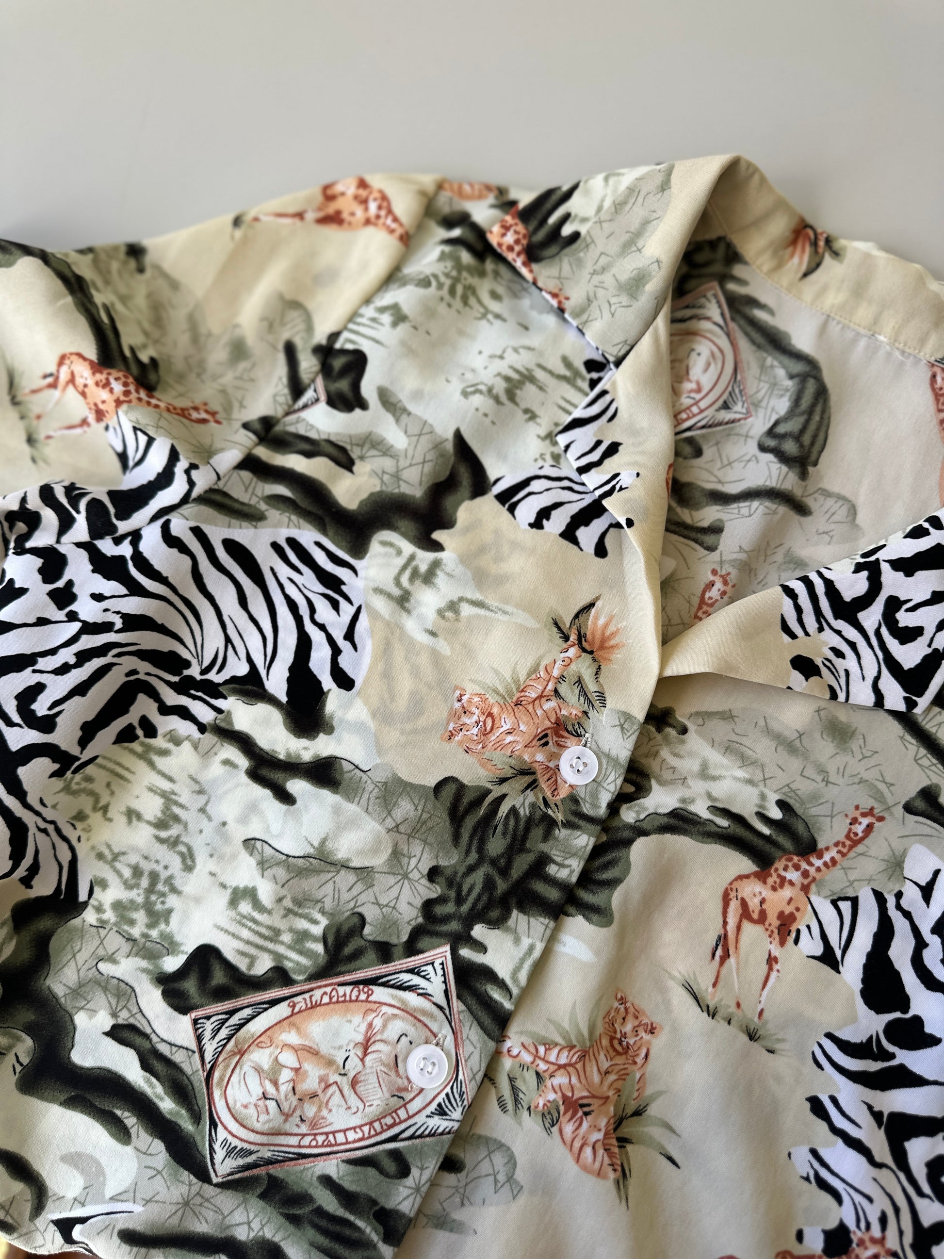 description. brought from a vintage reseller, this piece is definitely a great addition to the party shirt closet. the safari print, giraffes, tigers and zebra print on a beige background would definitely gain some compliments from strangers.
