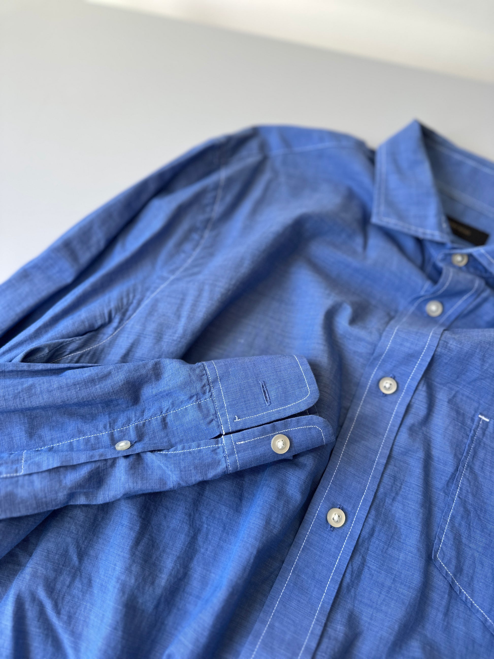 description. a super lighter cotton button up in a periwinkle colour way with white stitching