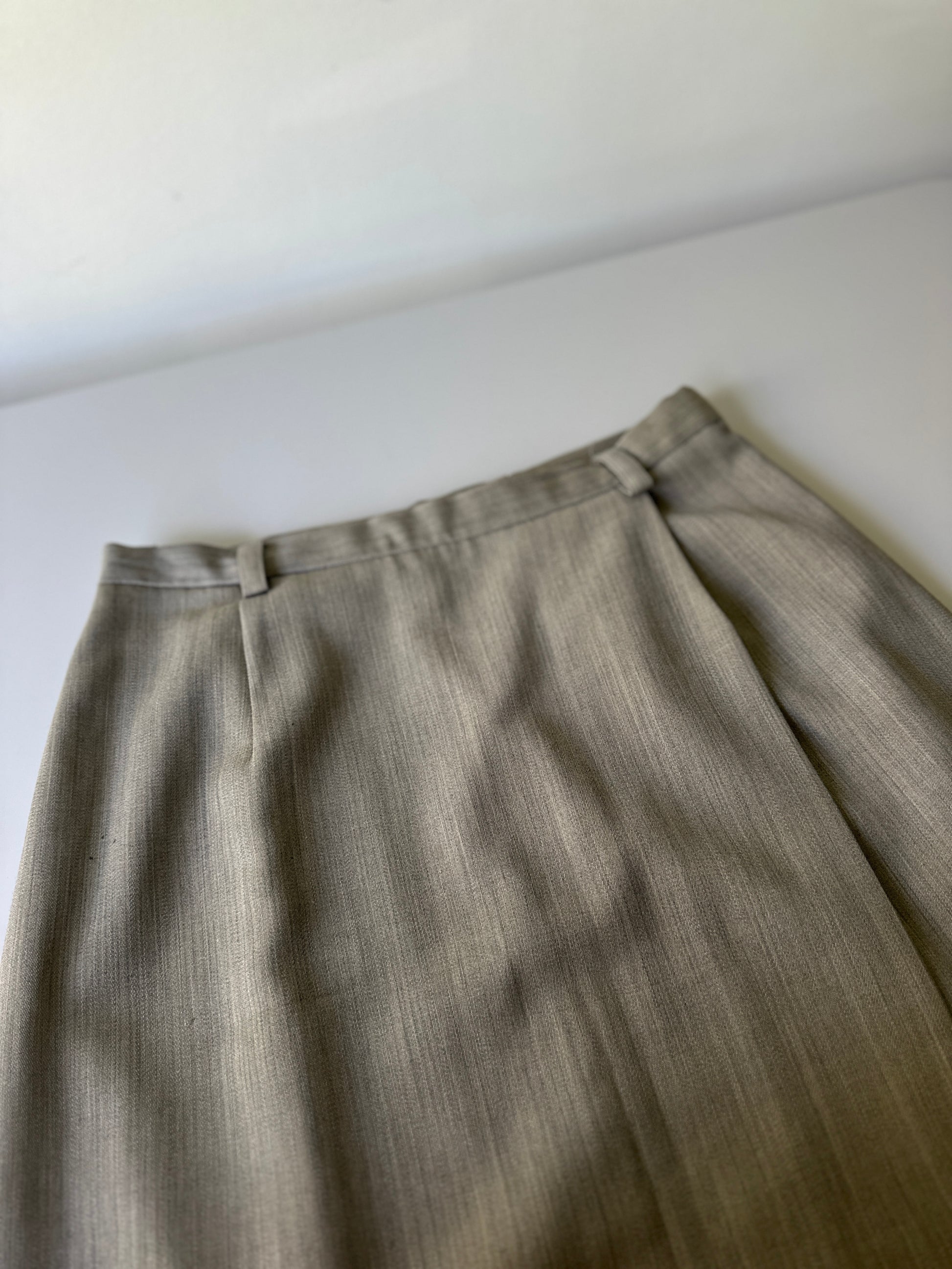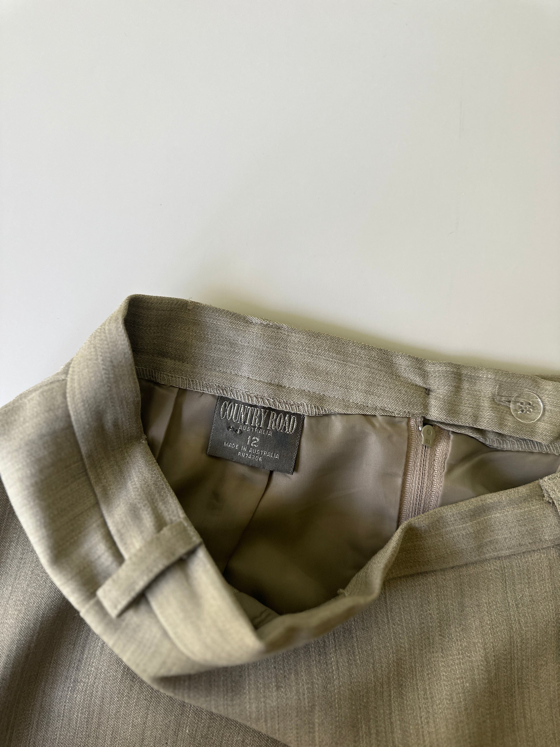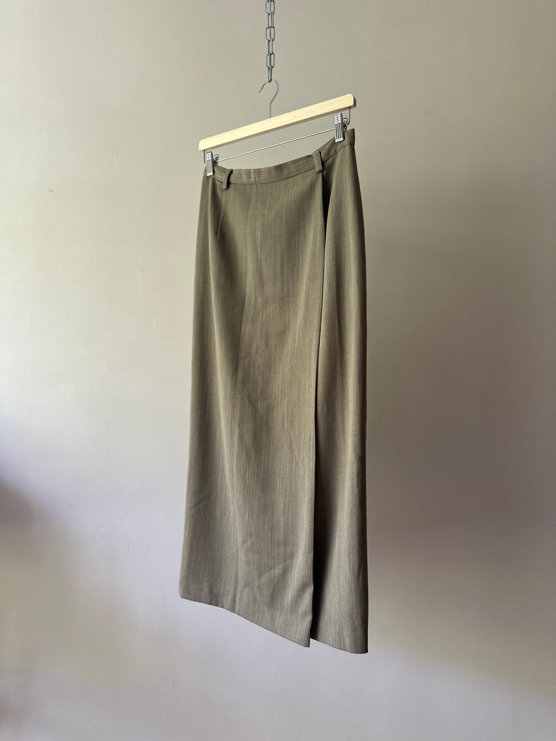 description. A fantastic vintage woollen Country Road longline straight skirt, high waisted with small belt loops. the colourway is like an olive beige marle, and it has a slit/flap up the entire front to allow easy movement while still having a tight looking fit