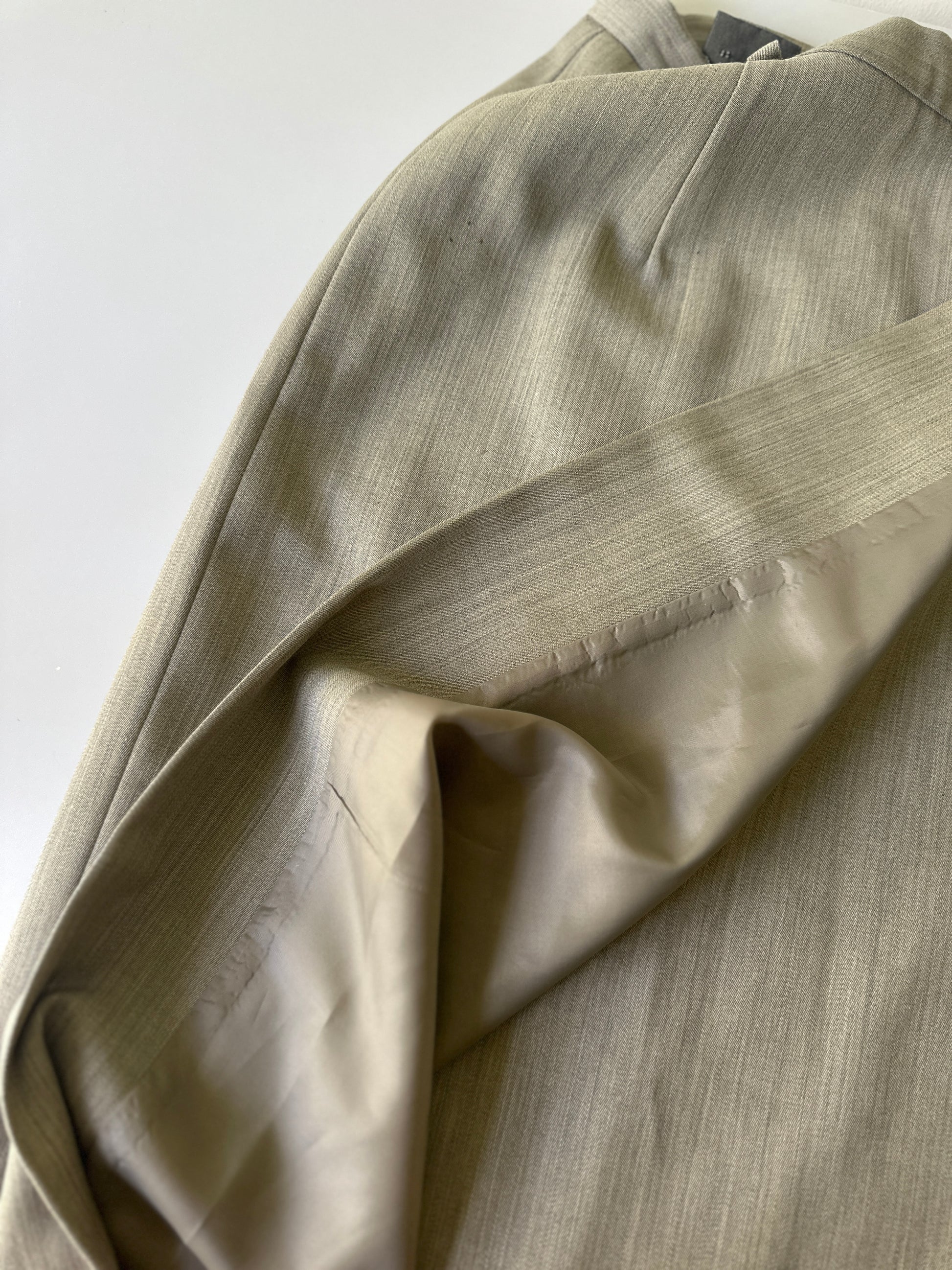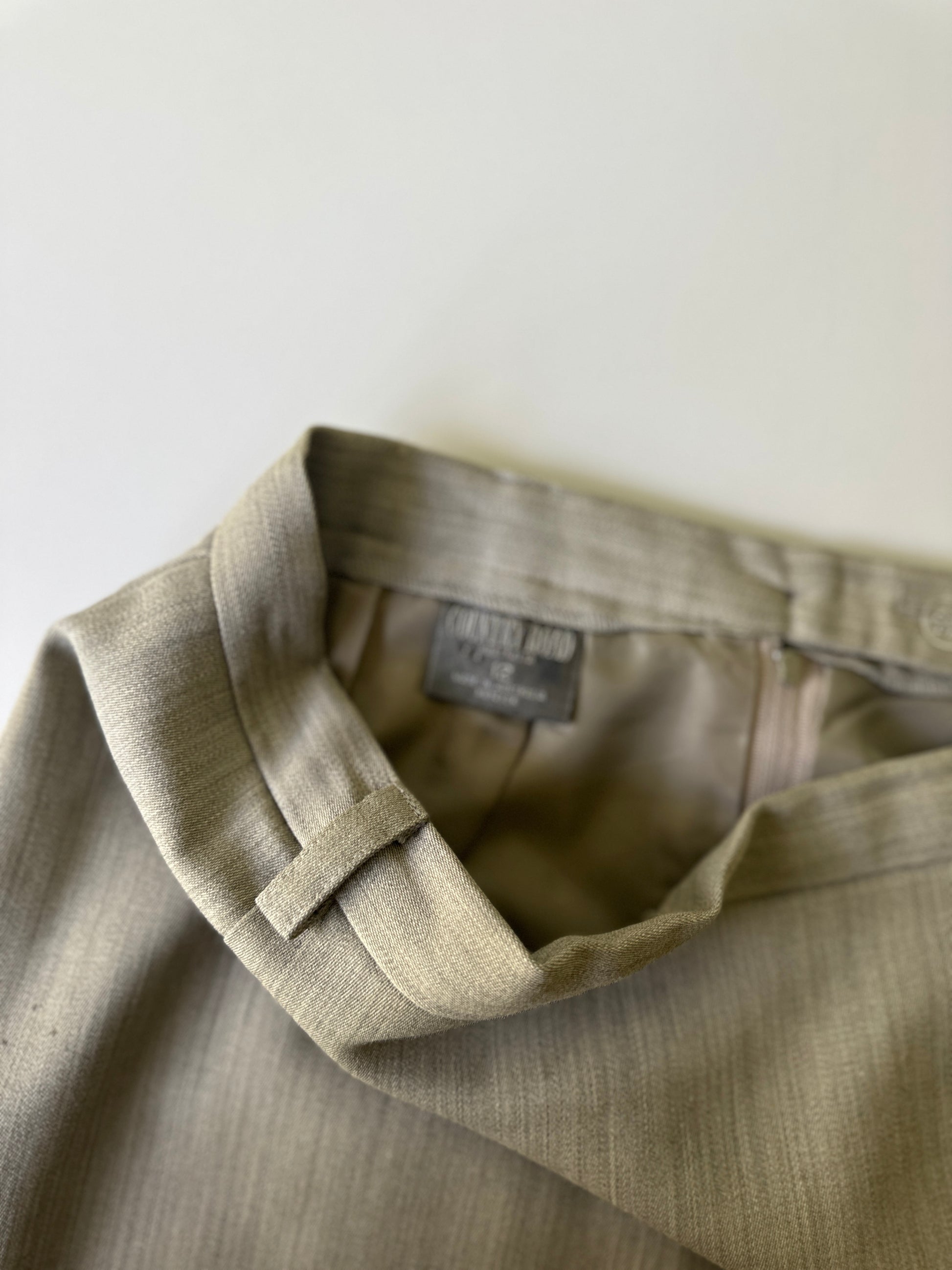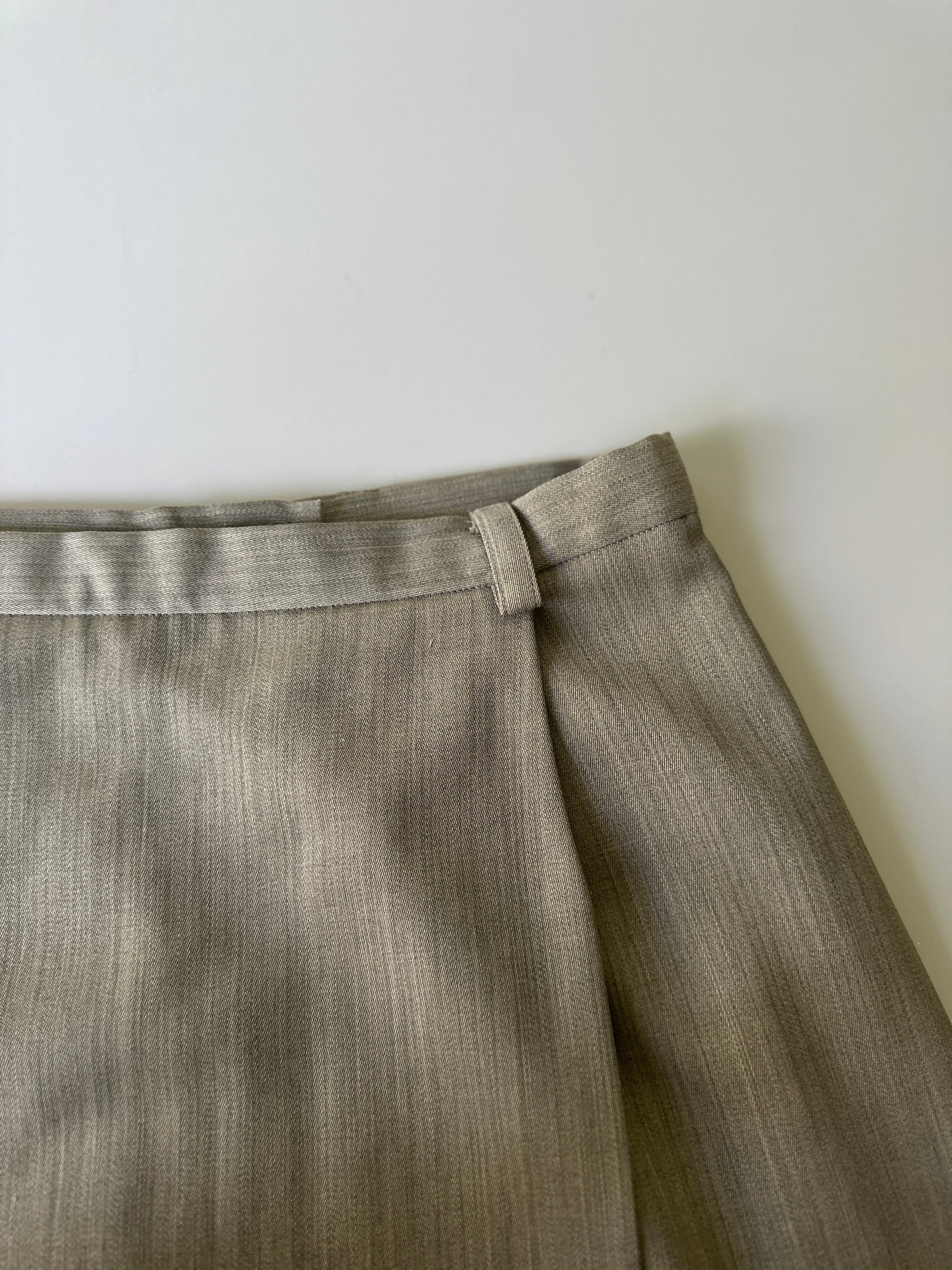 description. A fantastic vintage woollen Country Road longline straight skirt, high waisted with small belt loops. the colourway is like an olive beige marle, and it has a slit/flap up the entire front to allow easy movement while still having a tight looking fit