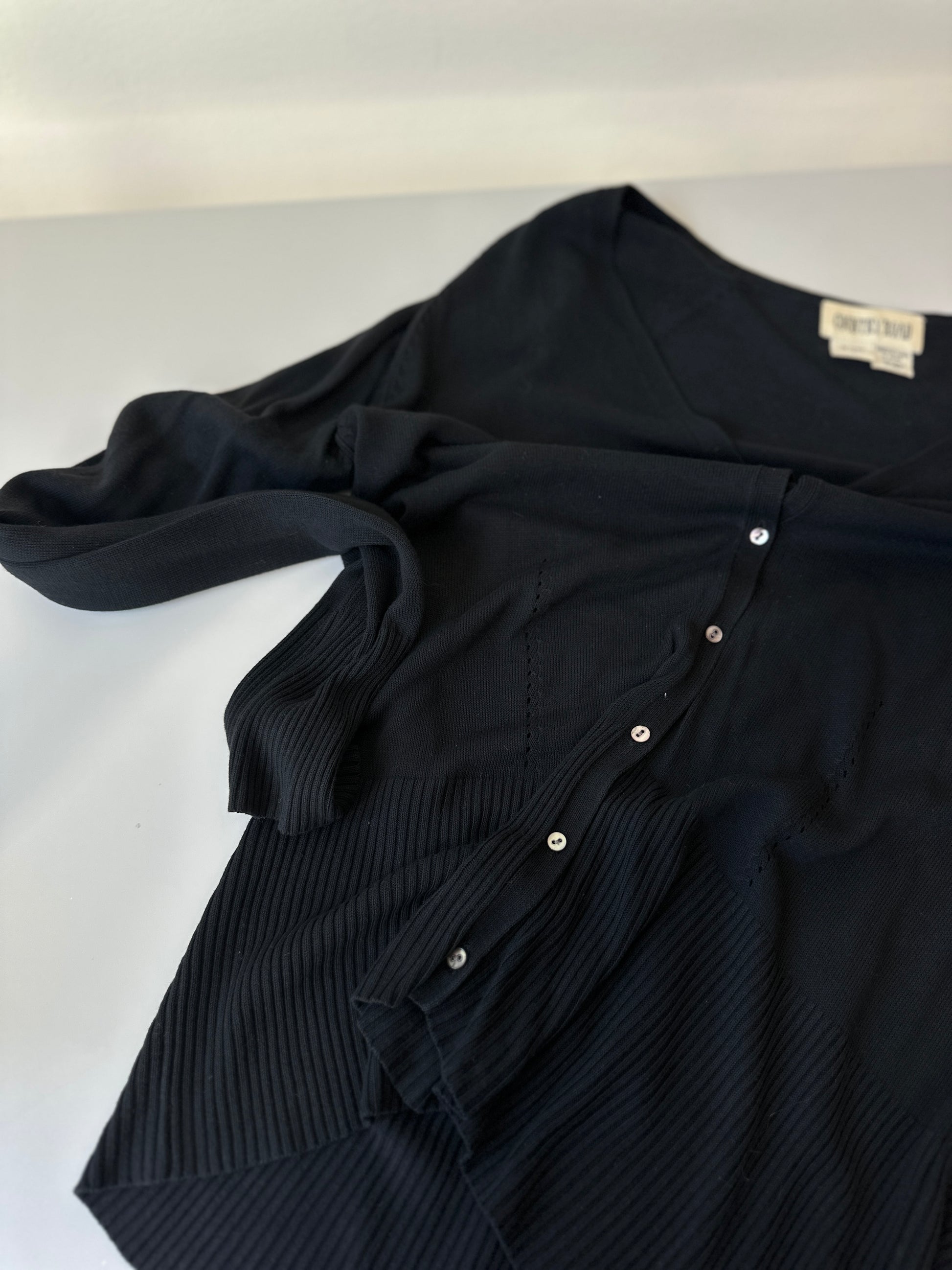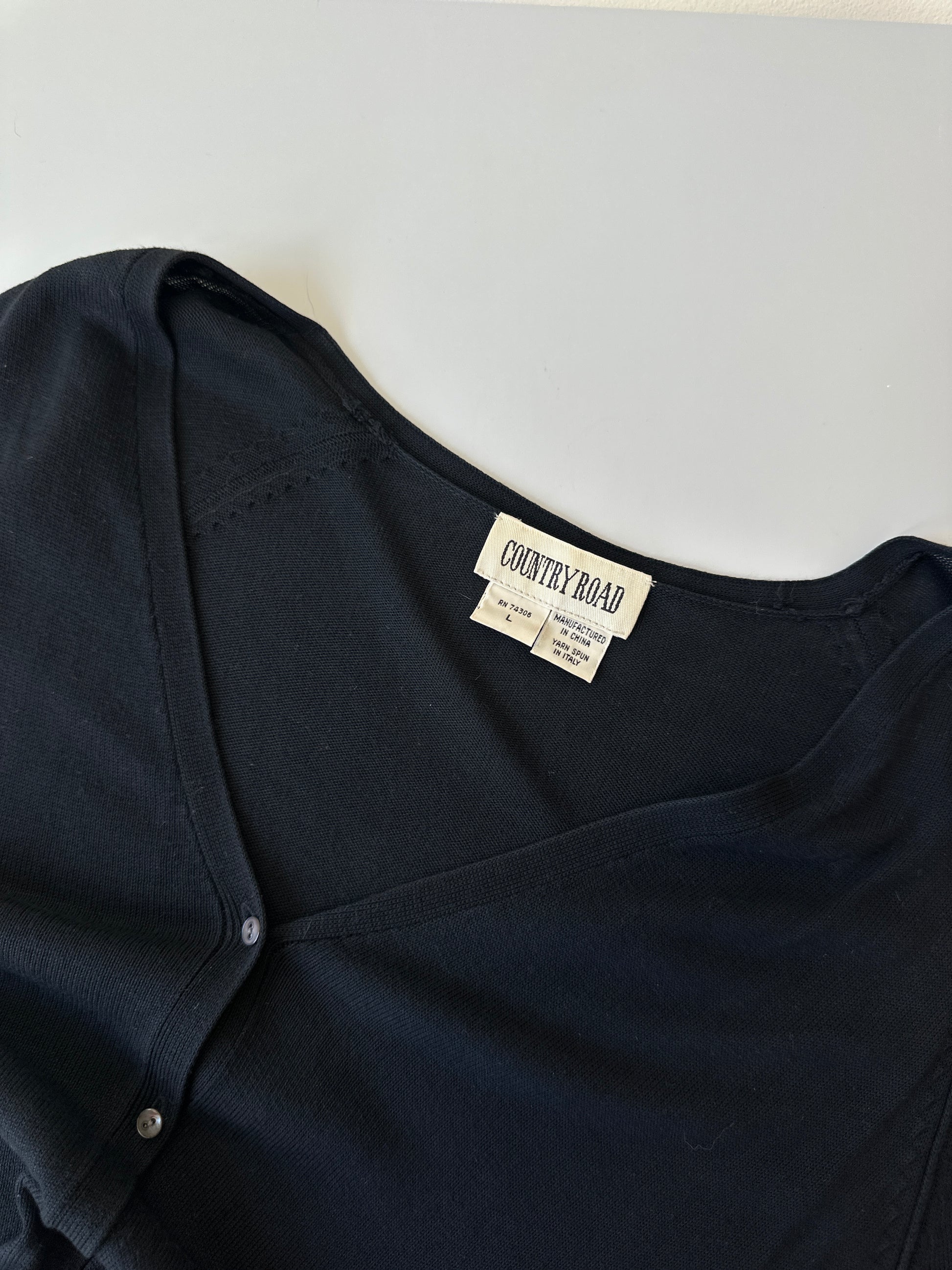 description. we LOVE vintage Country Road, this is a perfect black cardigan to add to the closet. with super small buttons and a longer sleeve to add dimension, take me home