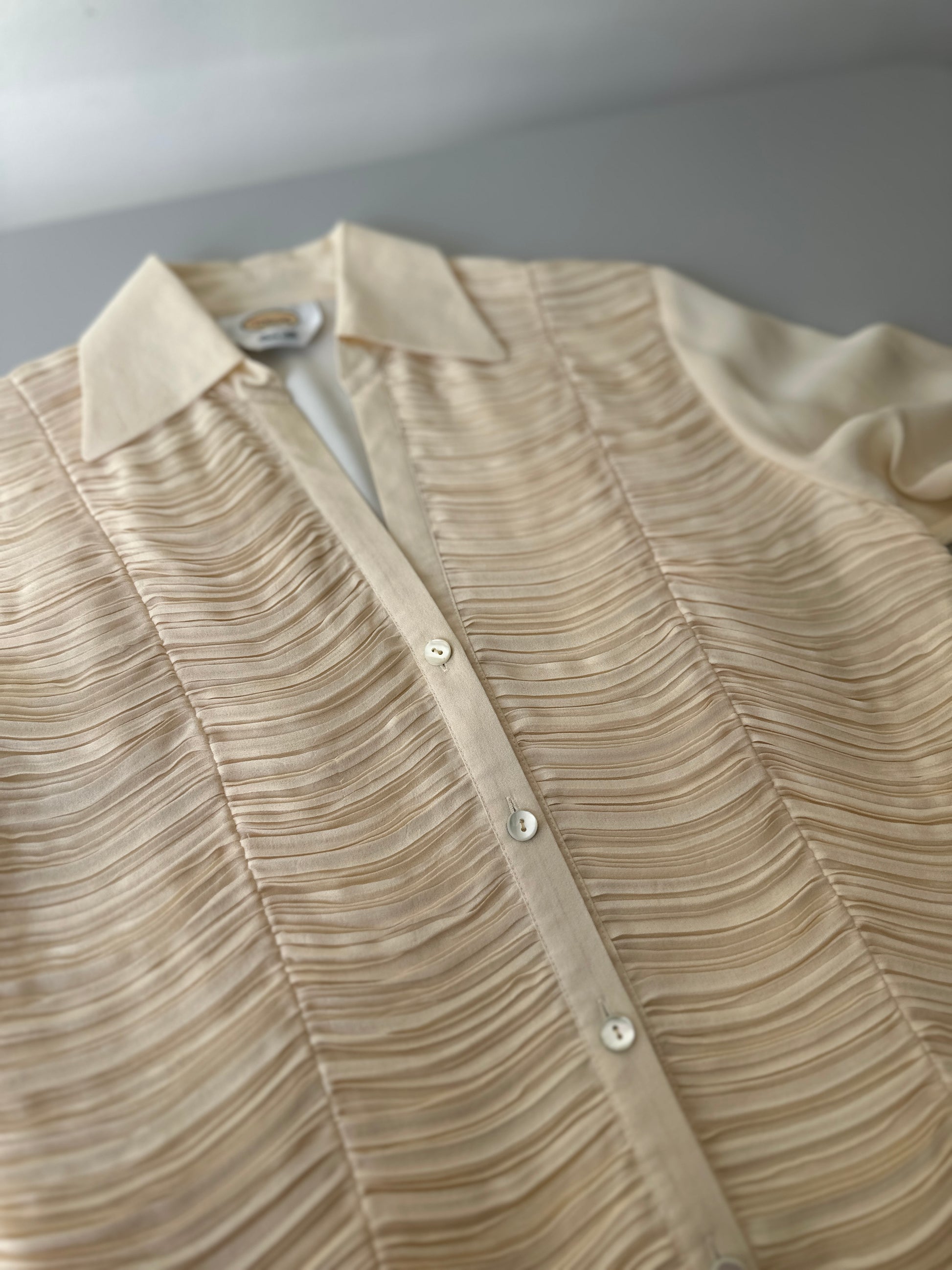 description. a BEAUTIFUL cream coloured silk blouse with an iconic design. the entire from of the shirt is ruffled/pleated, and with pearlised buttons, loose sheer sleeves and a low buttoned collar, this is the sweetest blouse that needs to find a forever home to be worn and loved