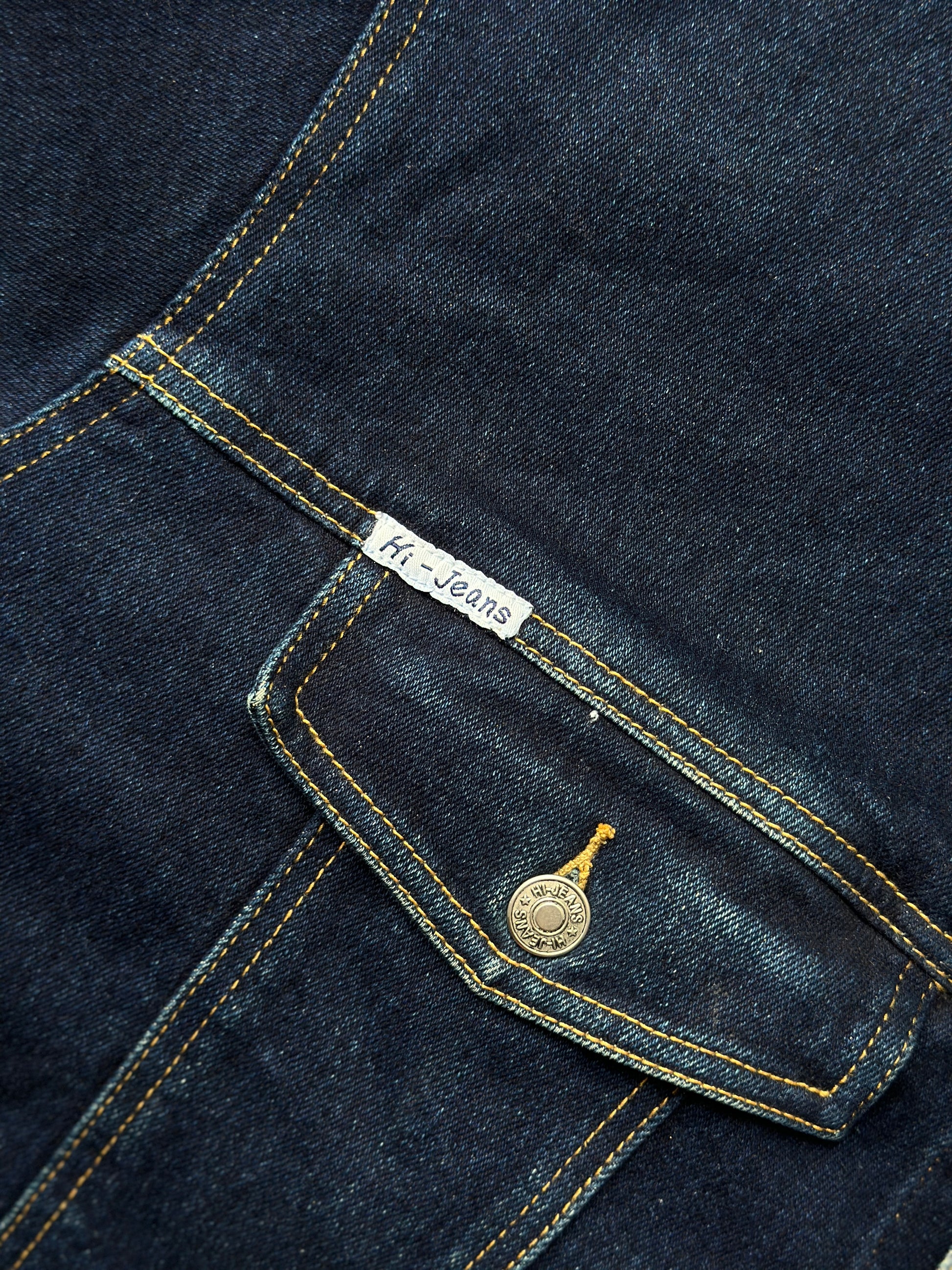description. a fantastic deep blue coloured denim jacket, the larger size and straight hem allow for a more cropped fit. yellow stitching and branded buttons are a fantastic addition and showcase the vintage aesthetic of the jacket