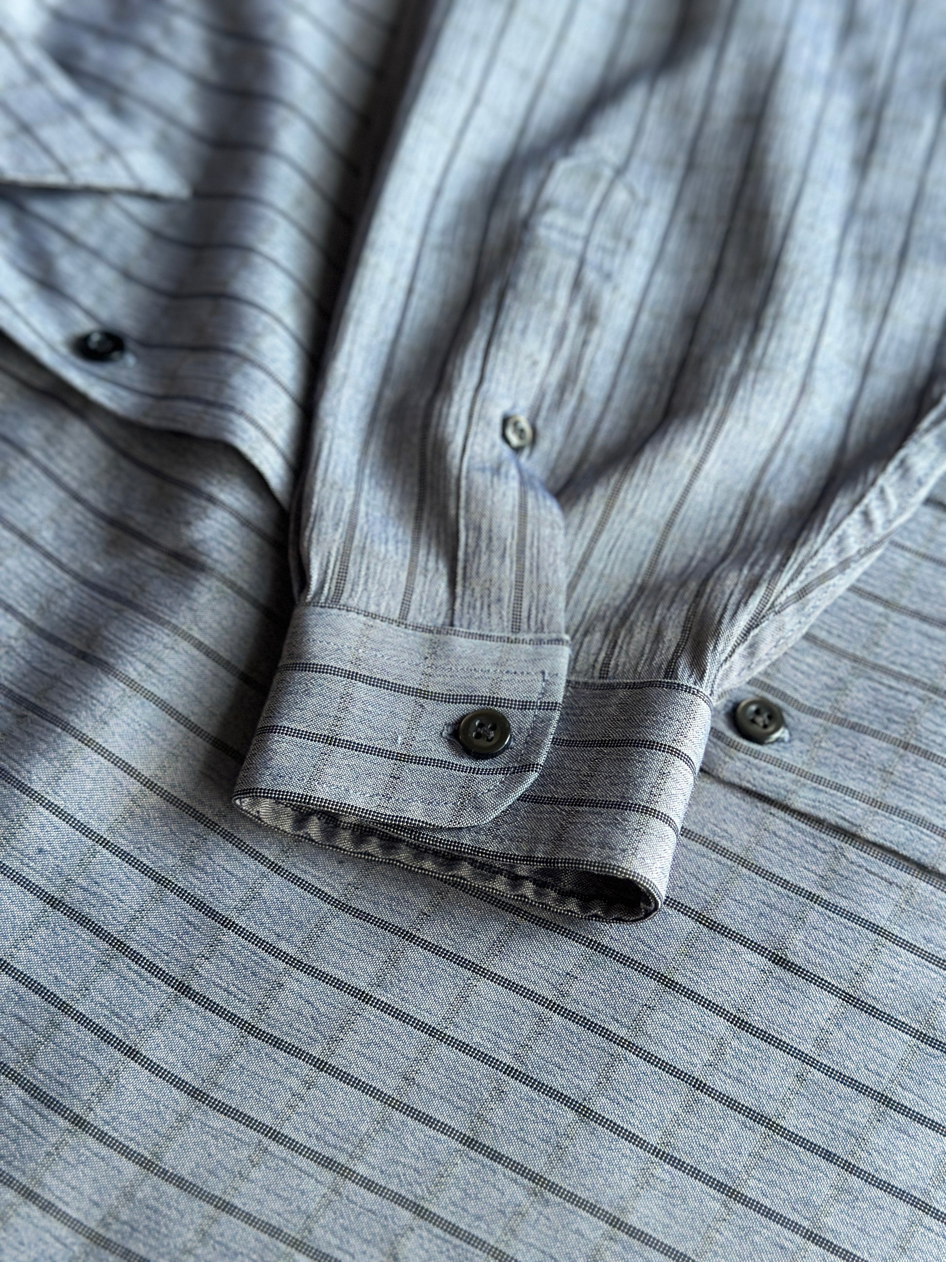 description. designed in Australia, du Maurier button up dress shirt, the colour is light grey with a blue undertone. the pattern represents a windowpane cross stitch, with a deeper blue vertical accent.