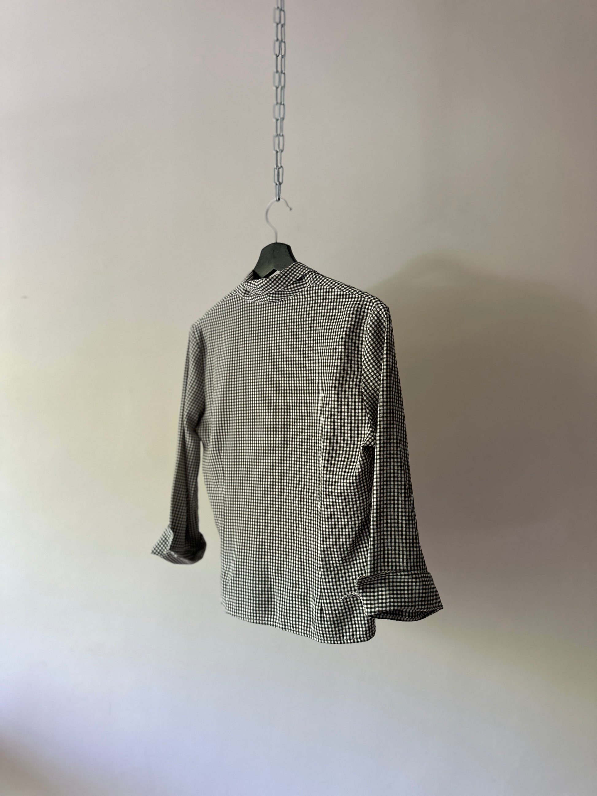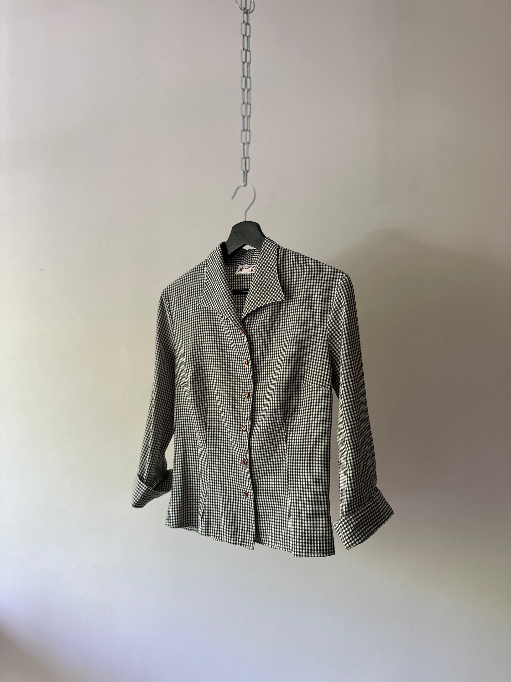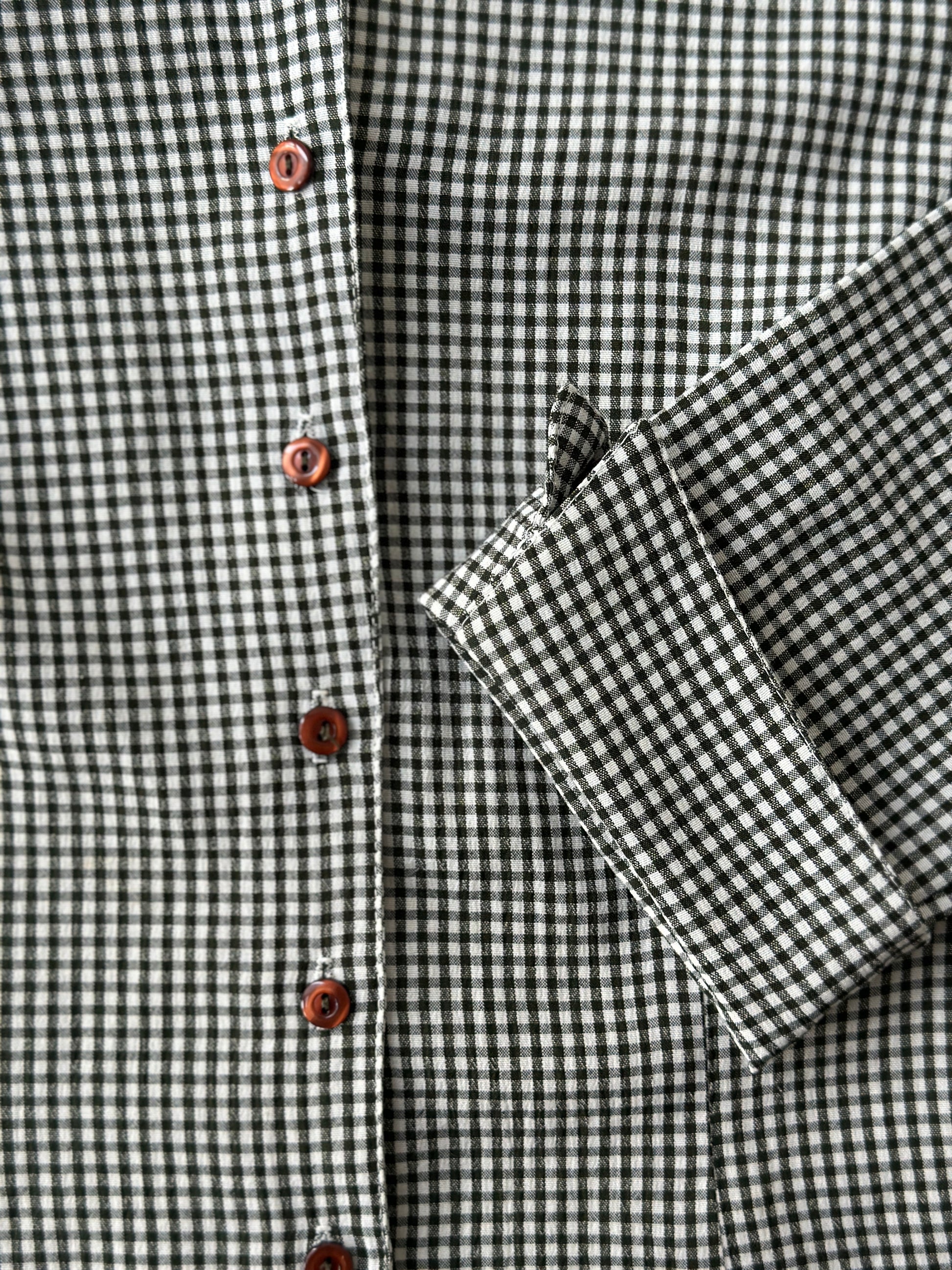 description. well-fitted gingham stitched collard shit, the patter is a deep green and white combination with brown buttons and fold over sleeves