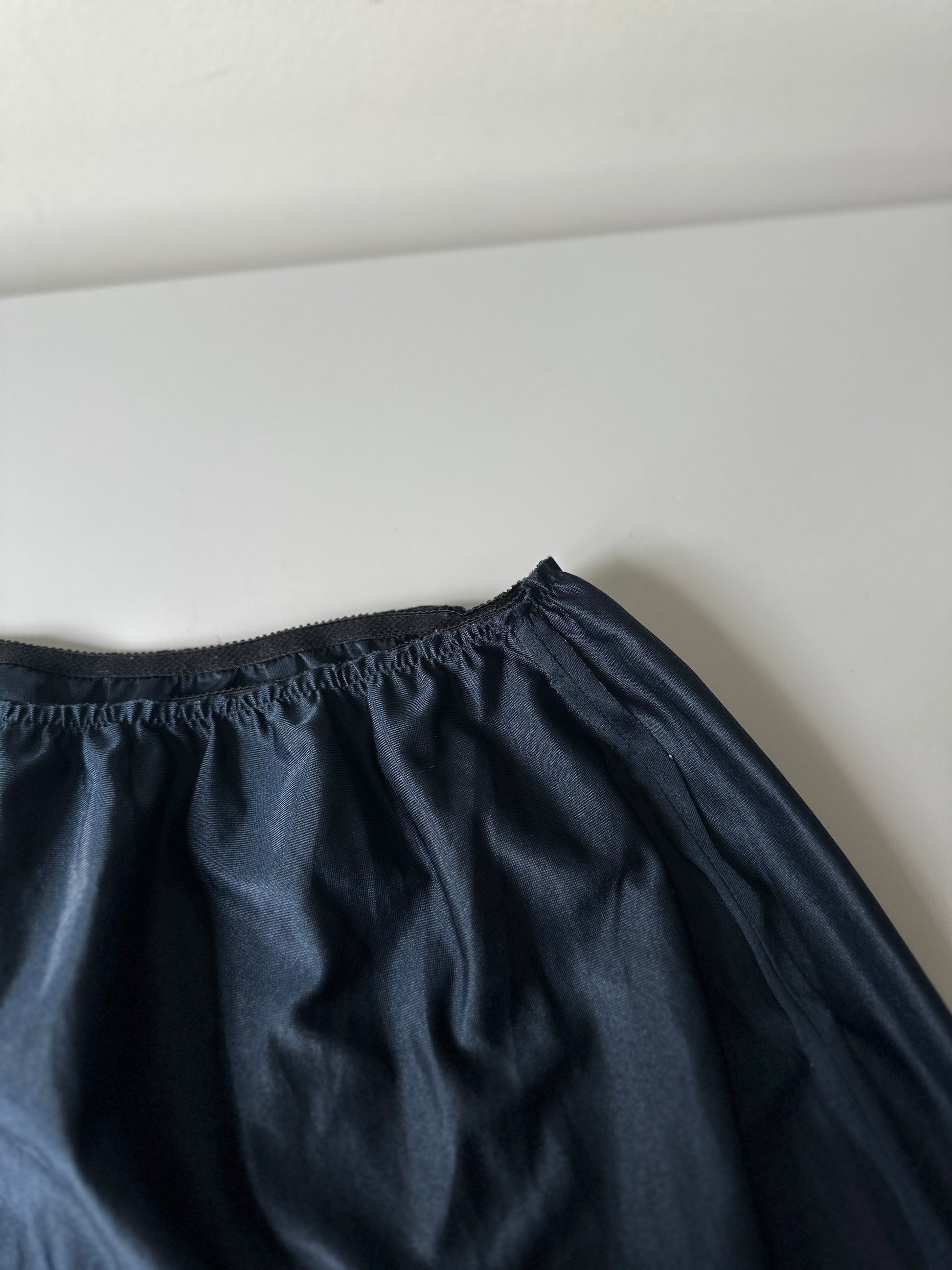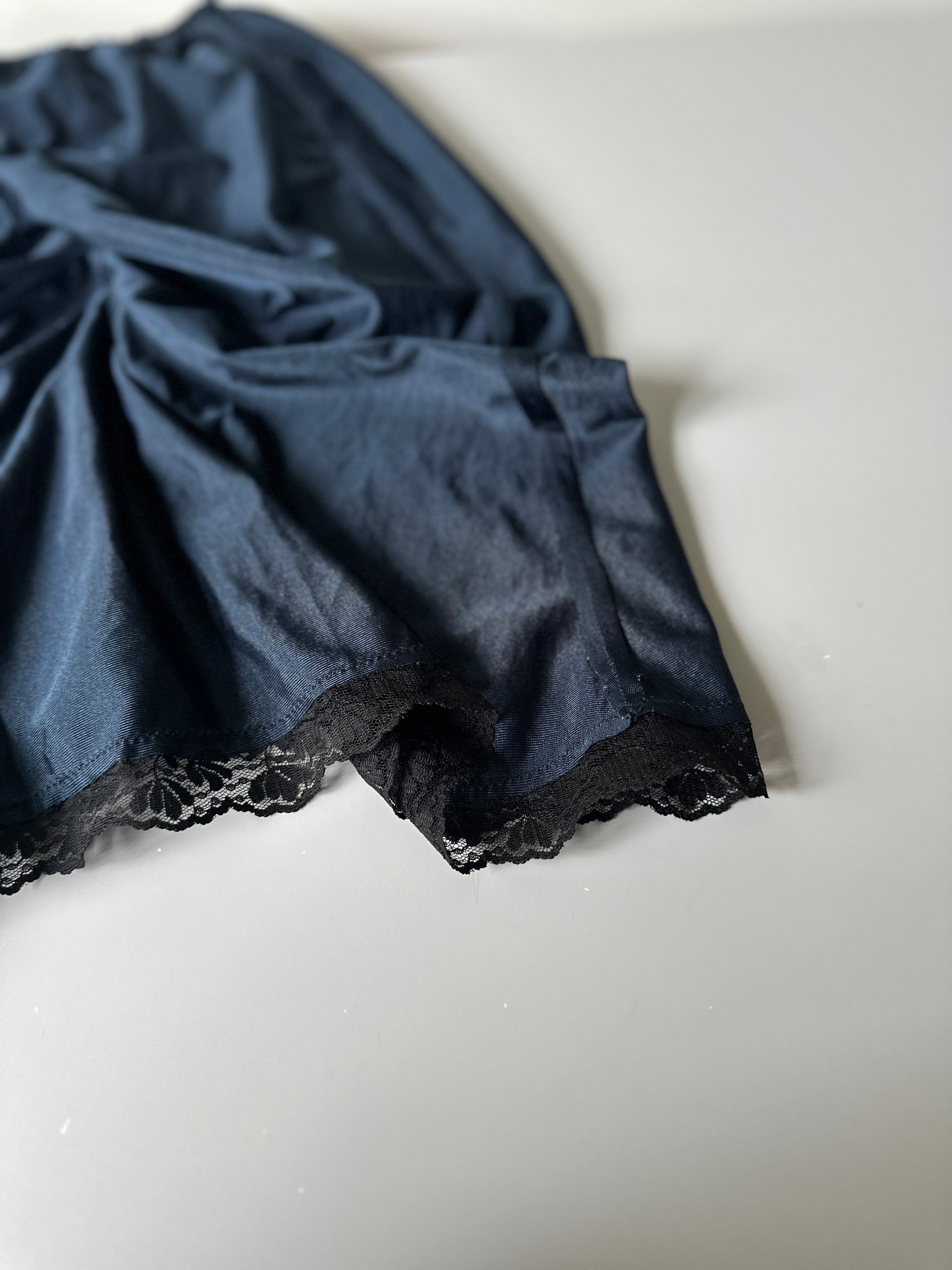 description. a deep navy blue under garment slip skirt with black lace trimming, this has been hand made so the edges aren't sewn completely
