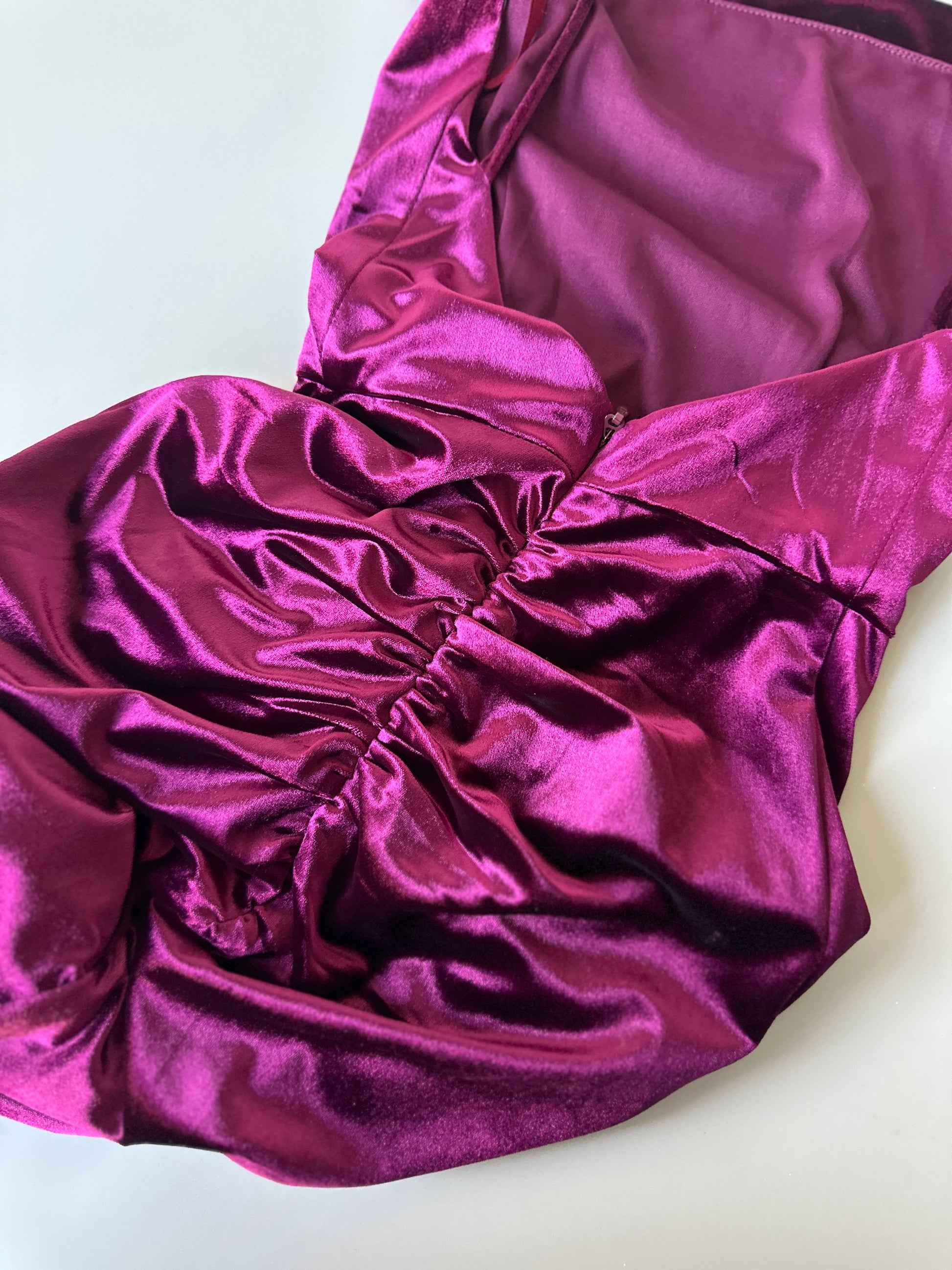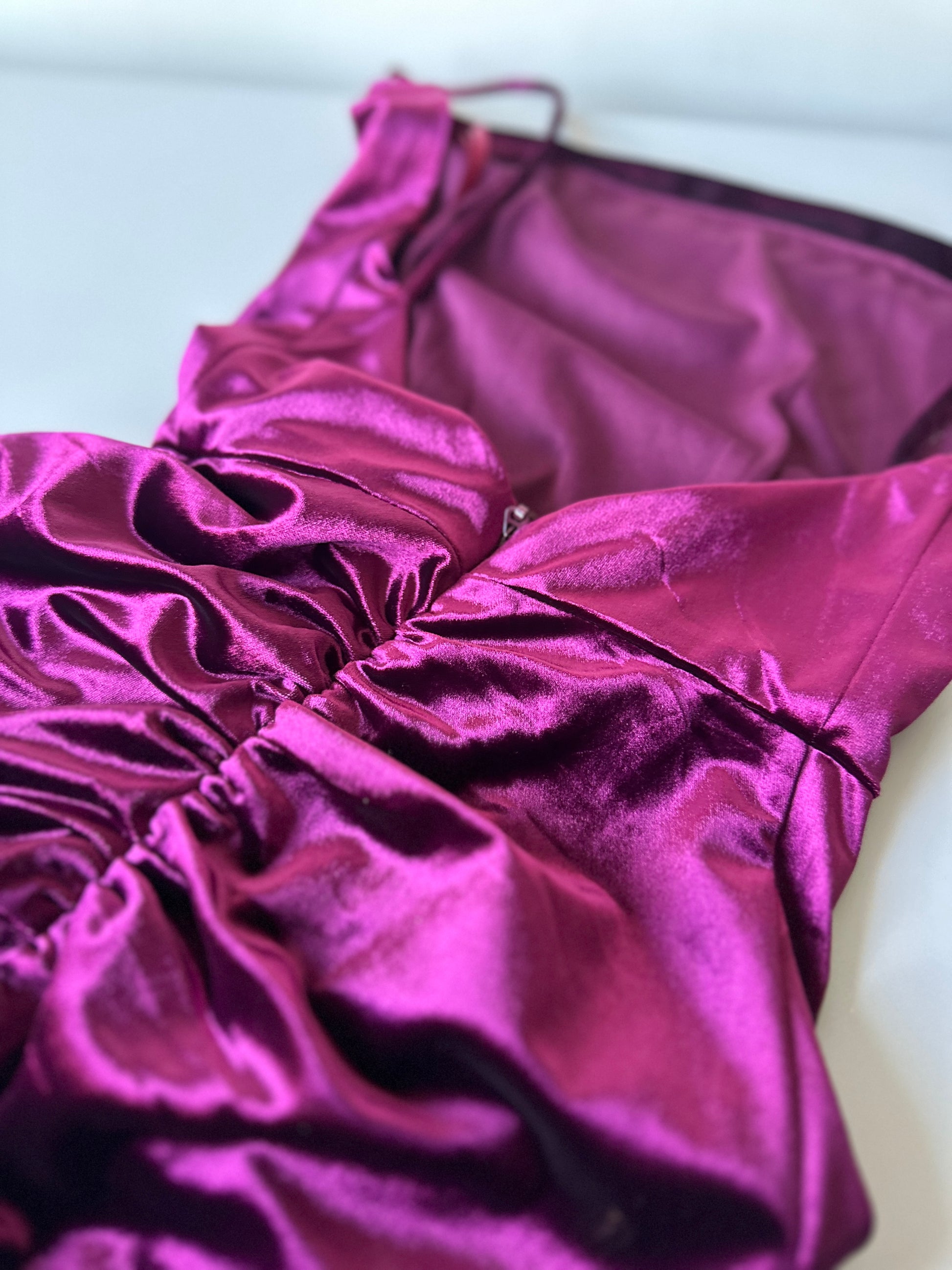 description. another fantastic formal dress. the colour itself is the showstopper, a deep yet vibrant pink/maroon. the cowl neck and scrunched backside with a low back, and high slit at the front.. this is meant for someones special day
