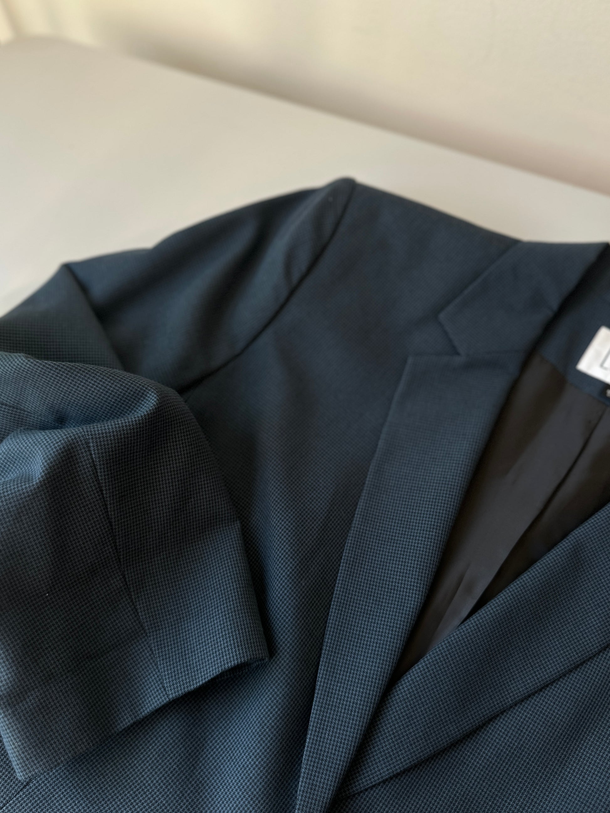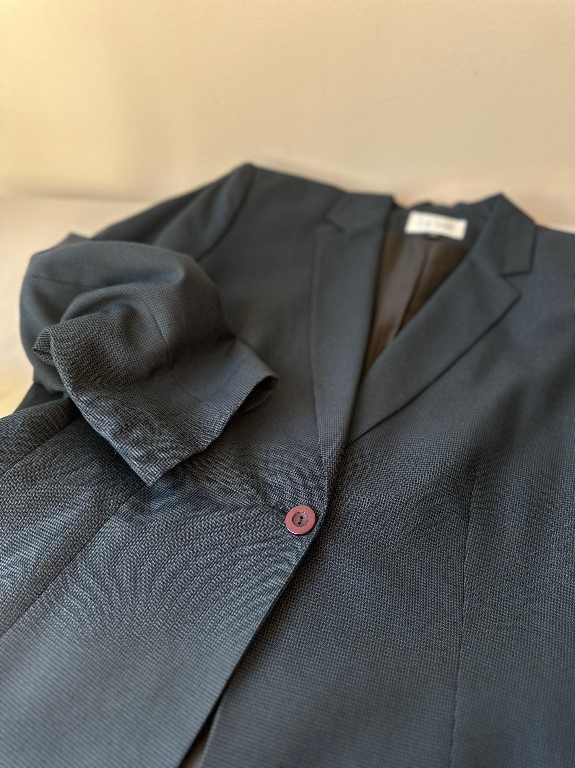 description. the coolest brand name for the coolest blazer. a teeny tiny herringbone print, black and turquoise colouring. a single button front, and no pockets is perfect for anyone with an office siren aesthetic