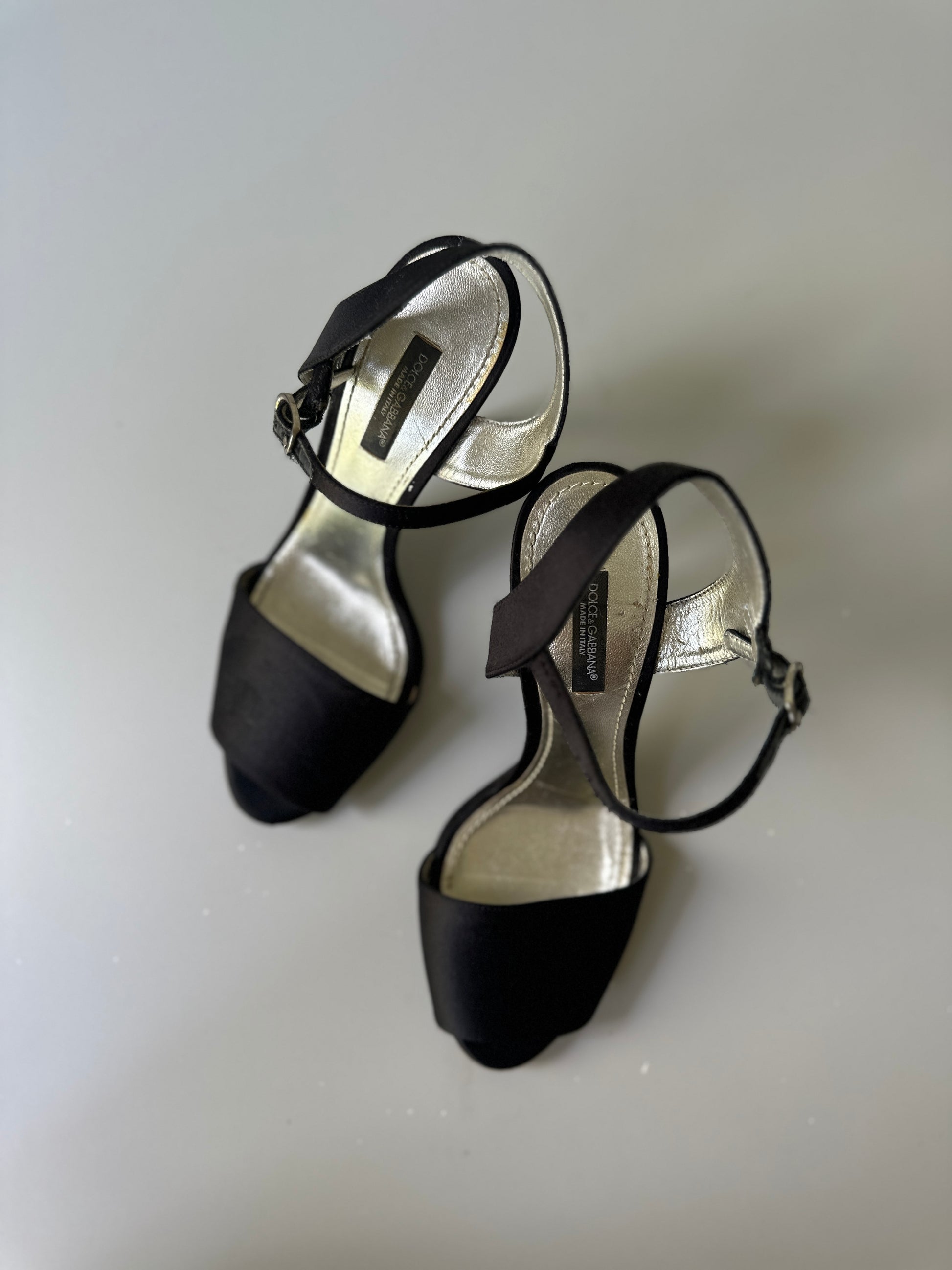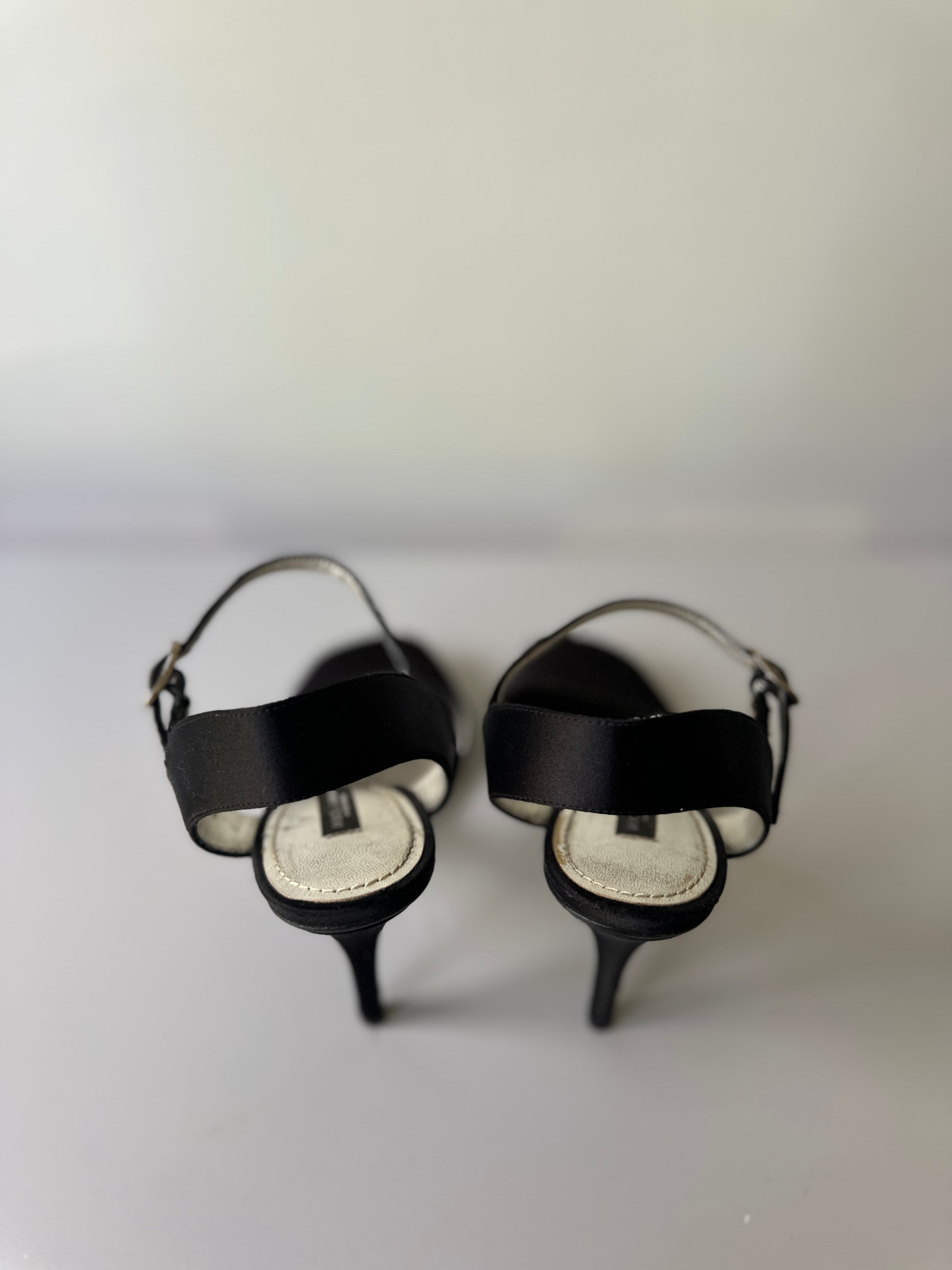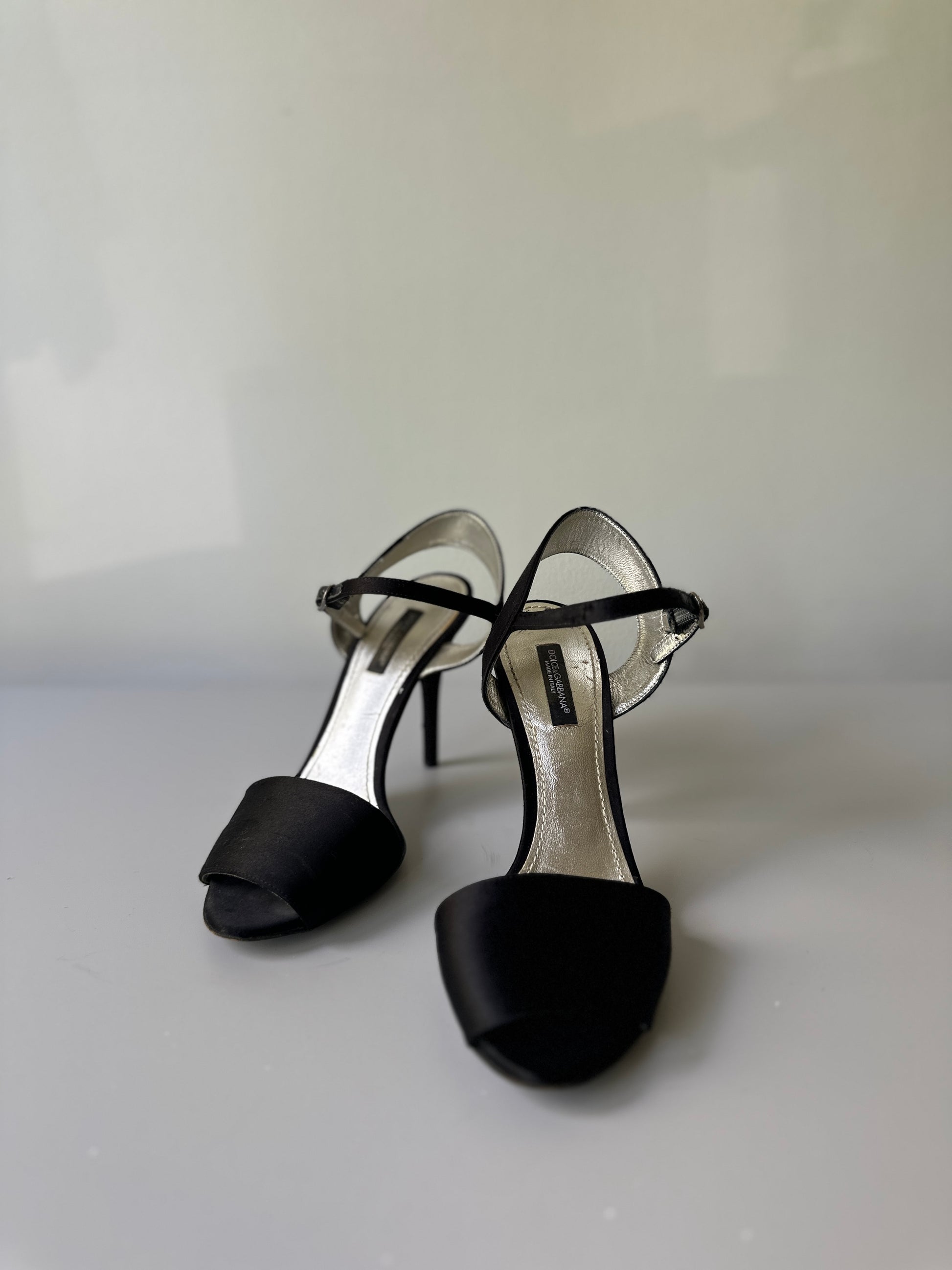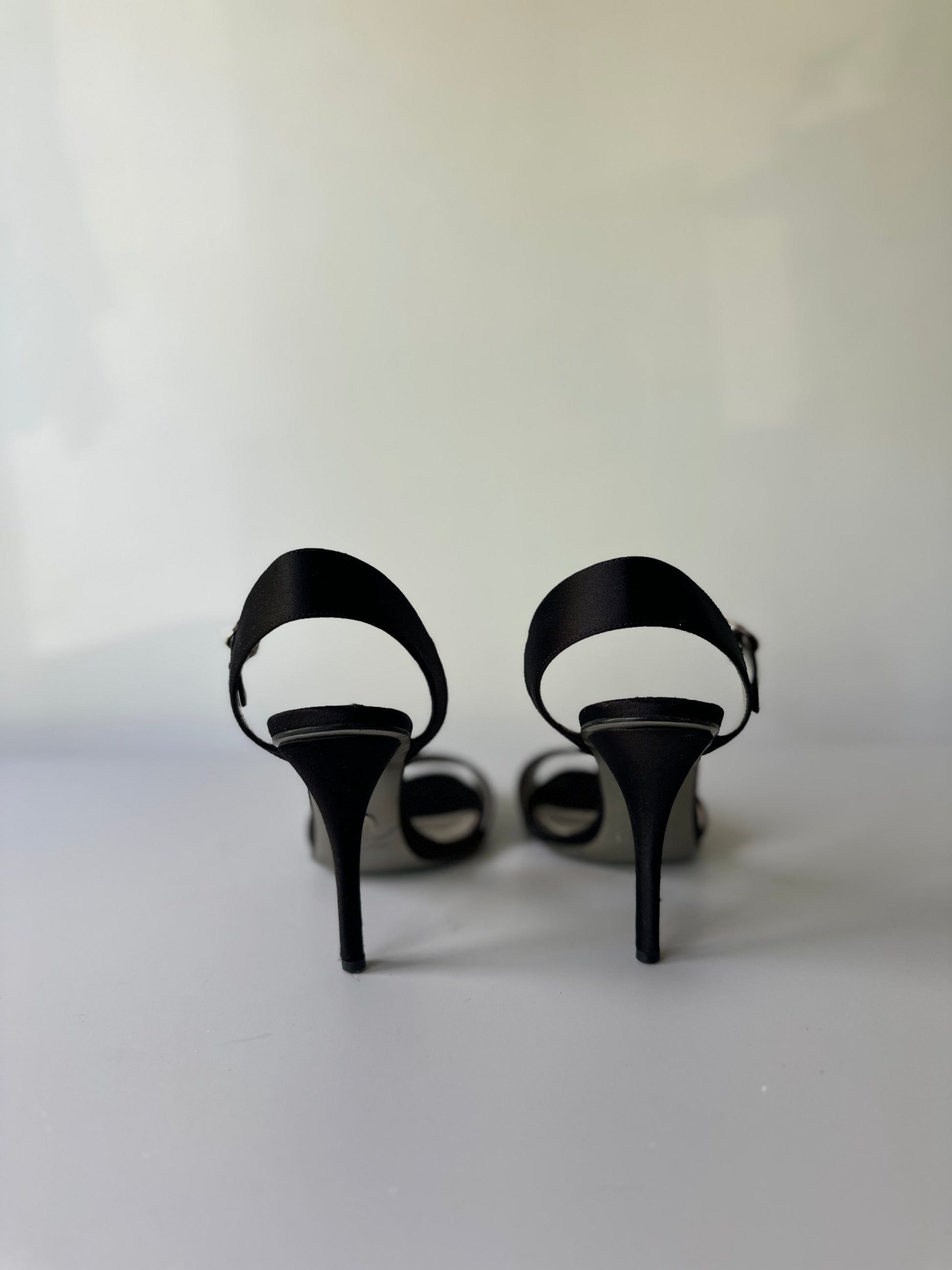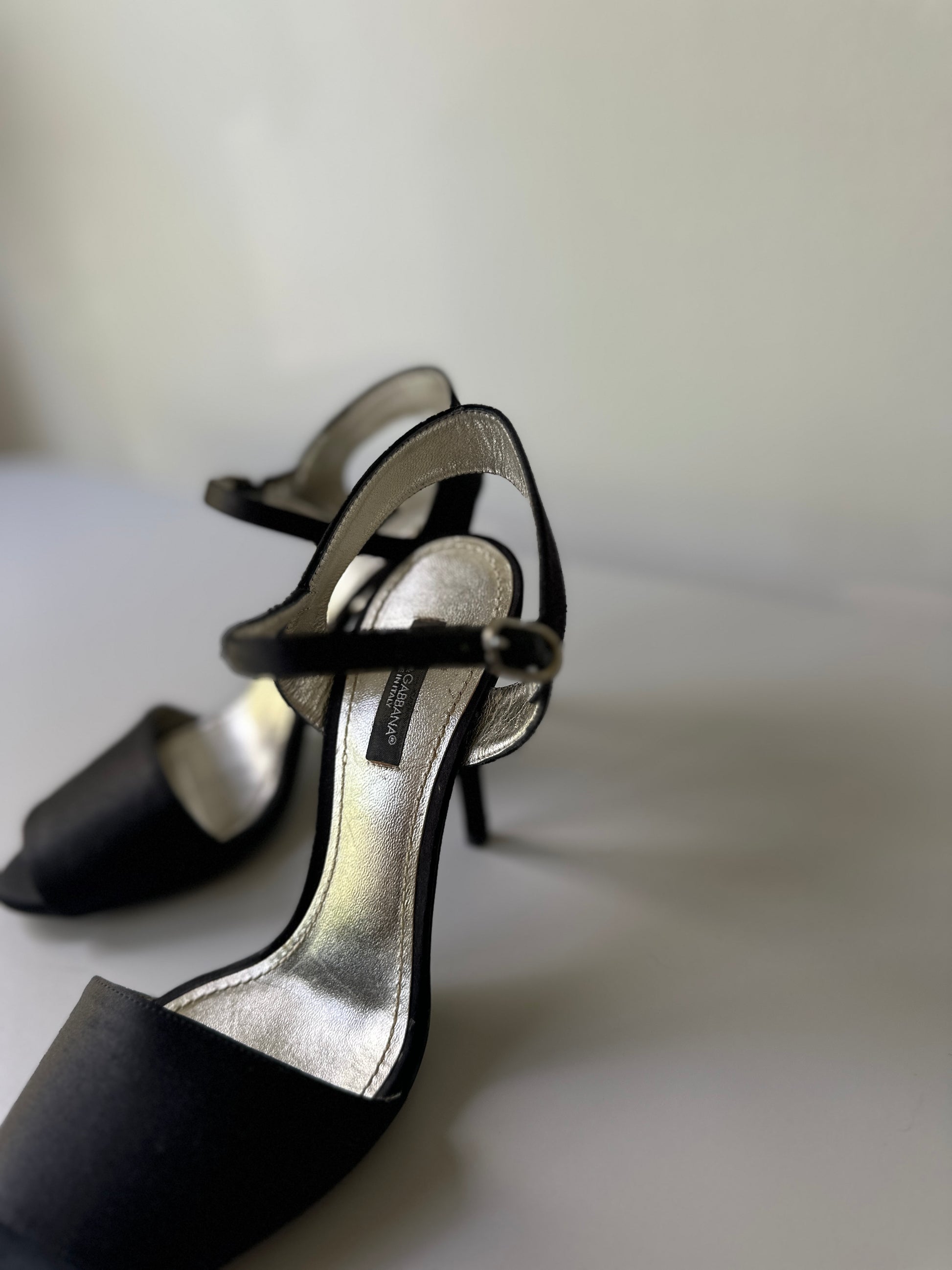 description. a beautiful stiletto heel, black satin with a large band at the front, showing the toes and an ankle strap. the silver leather lining is also a unique addition to the shoe