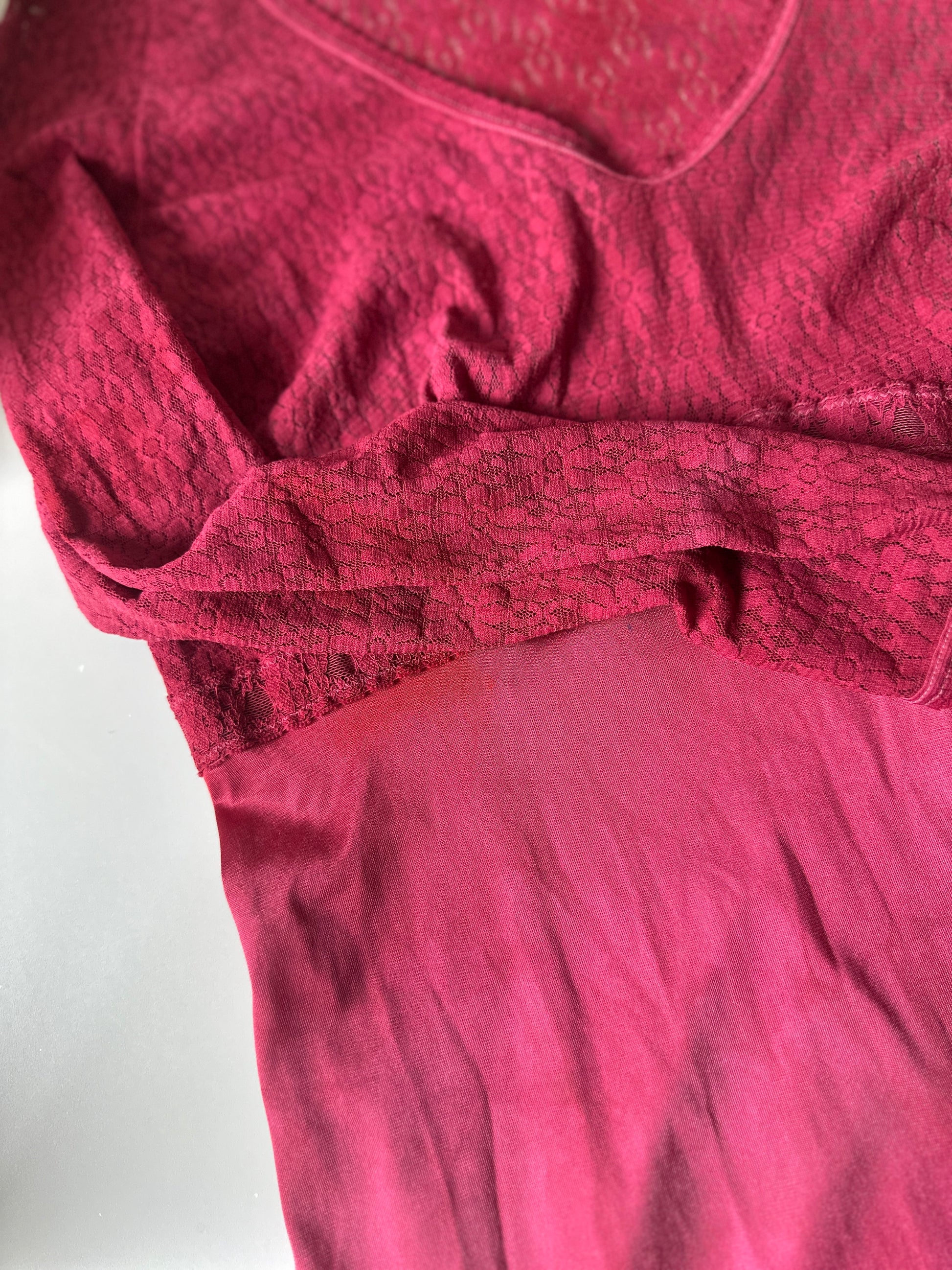 description. self dyed a maroon tint by yours truely. full lace stretchy upper top half of the dress with the cutest flower pattern, comes mid-length down with a lace trimming