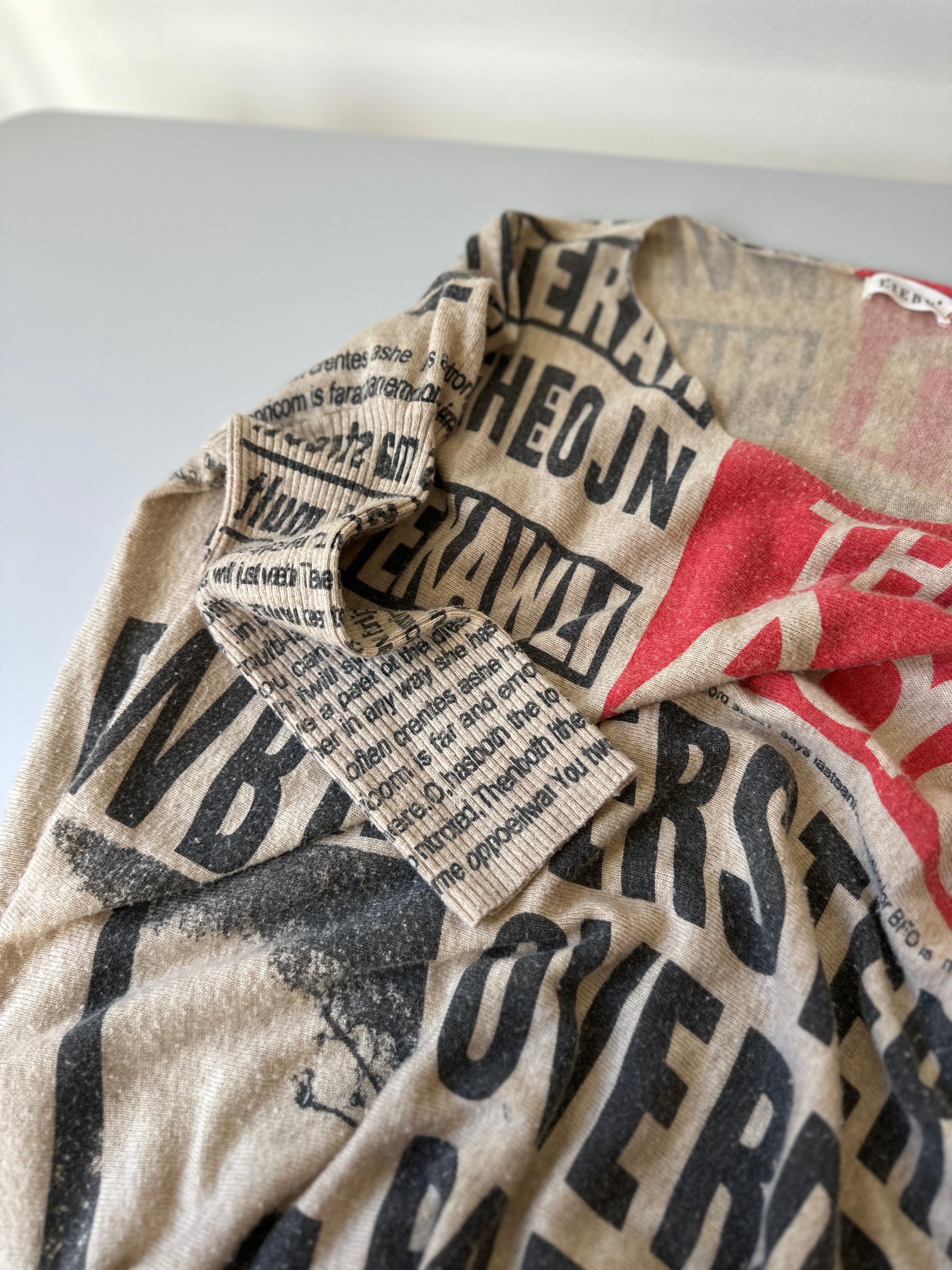 description. a groovy European magazine style print, the black and red on beige background is a really good mix. good for anyone with an alternative aesthetic. the material is so so so soft, the shape is oversized but with tight sleeves