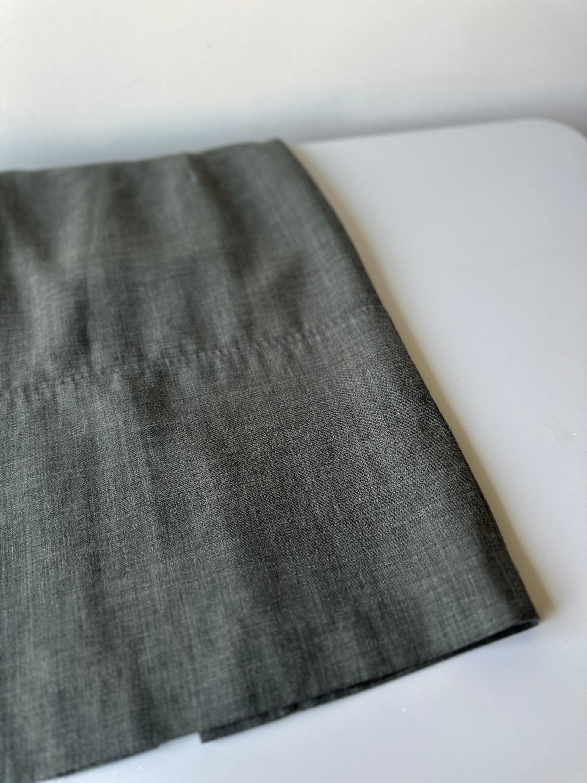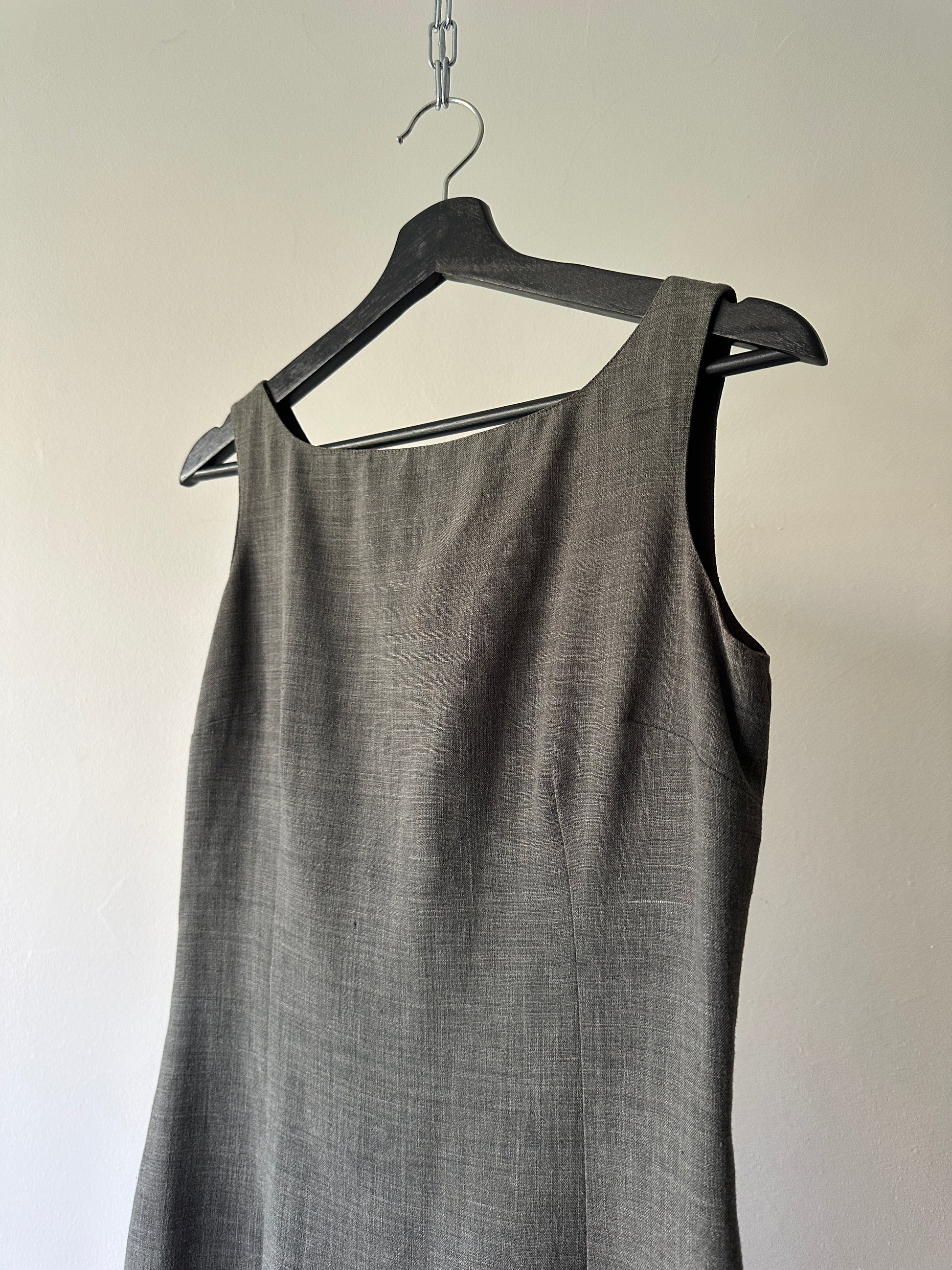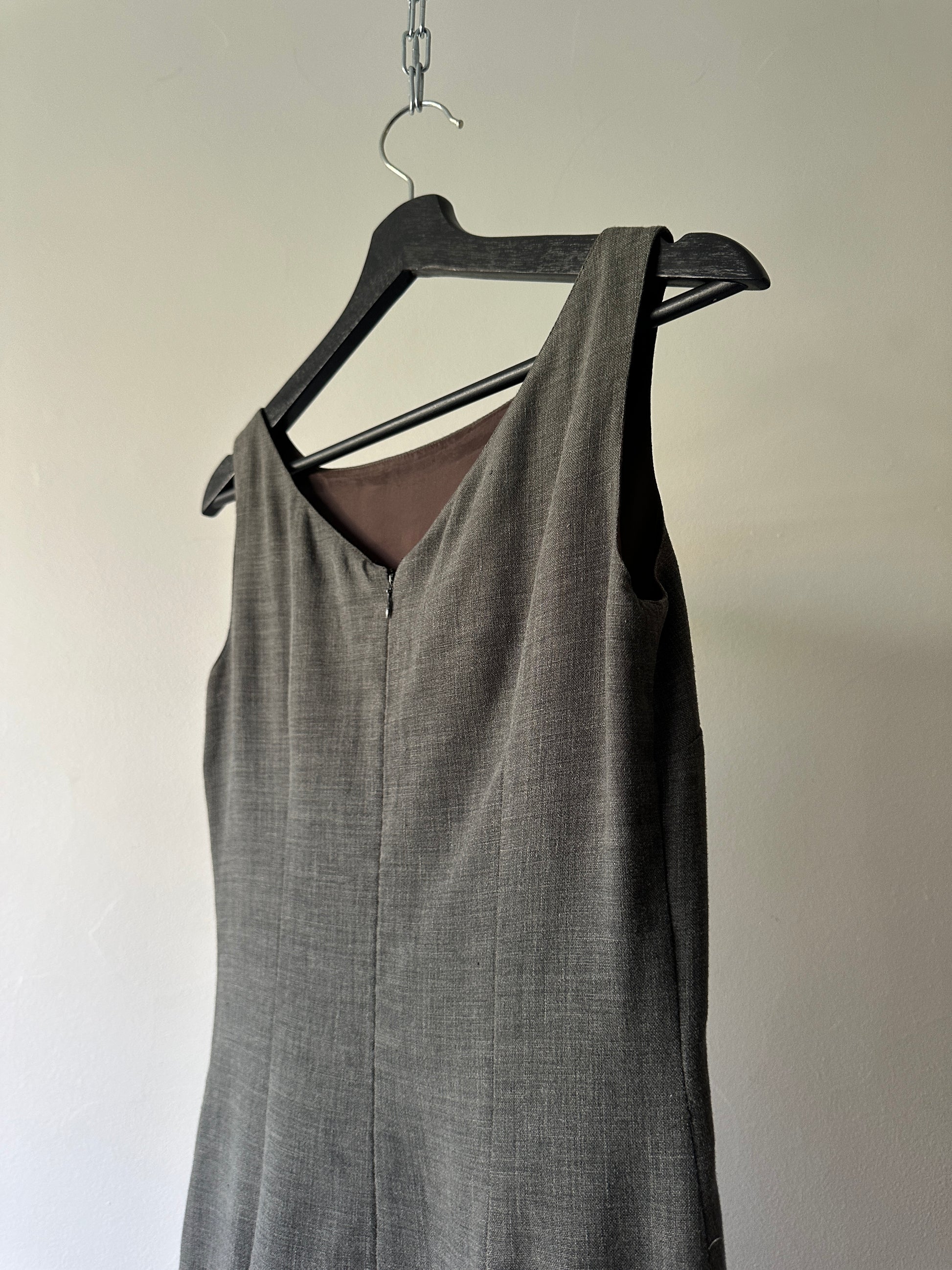 description. a fantastic office siren vibe dress, well fitted, mid-length and a khaki/grey colourway. the neck is square and has a slight slit in the back of the dress skirt