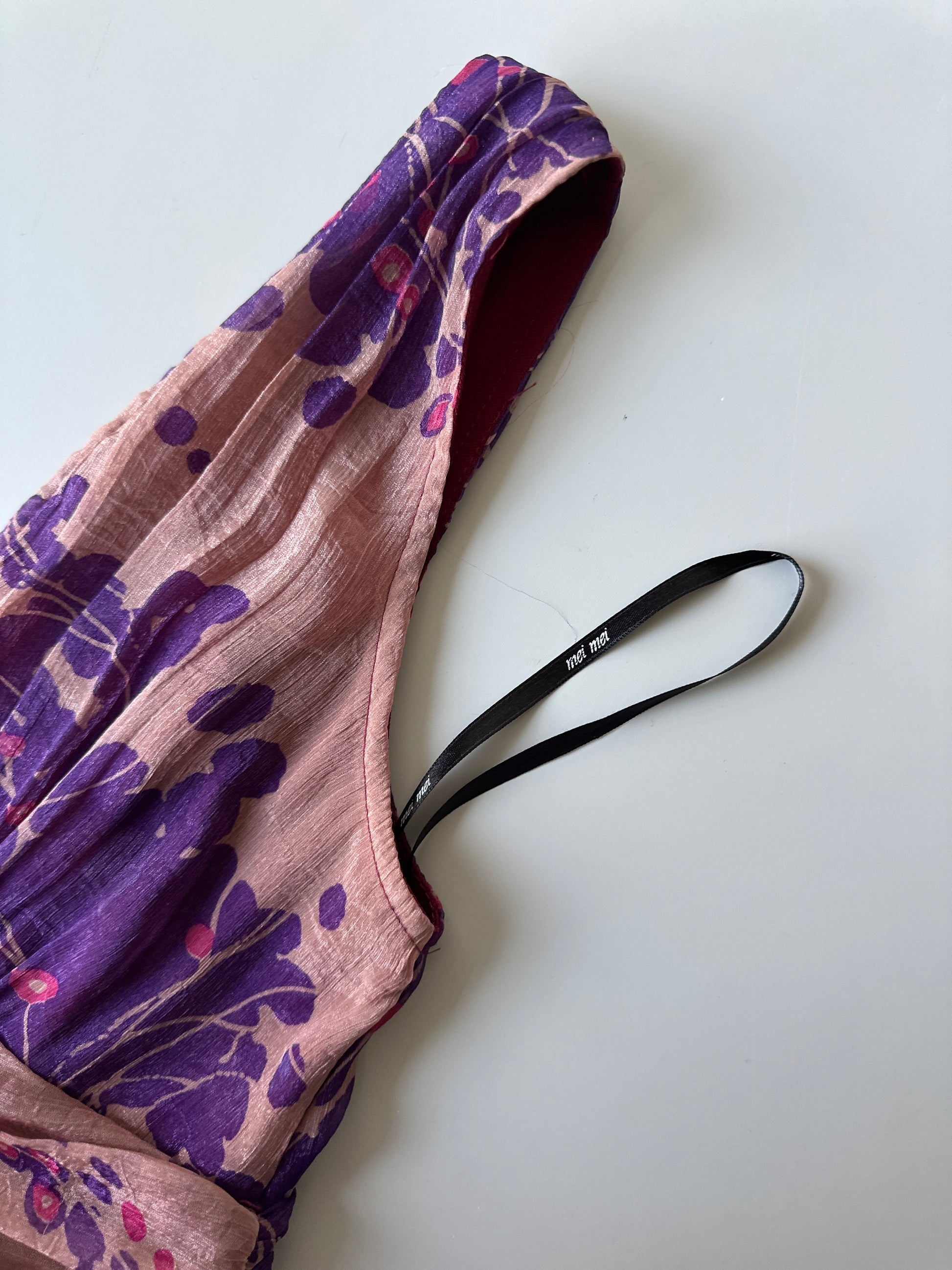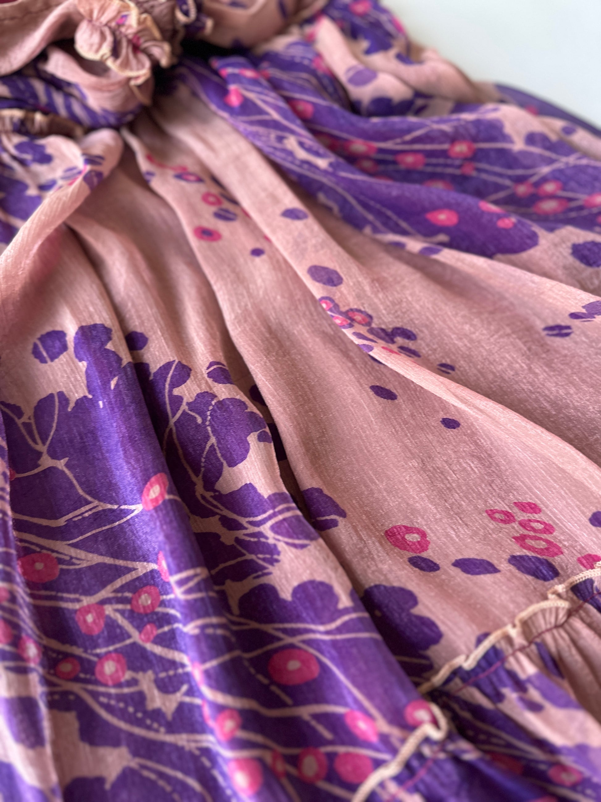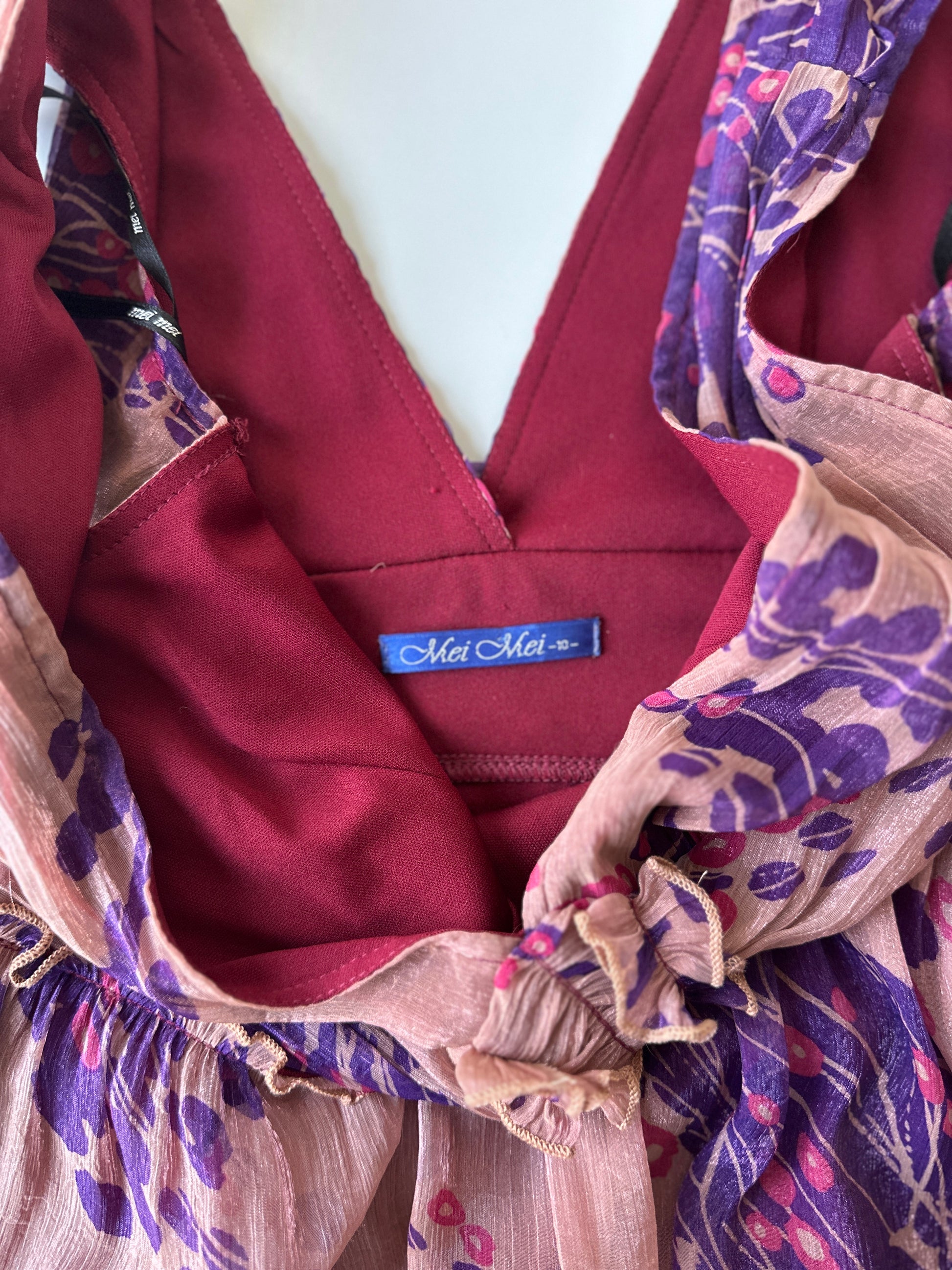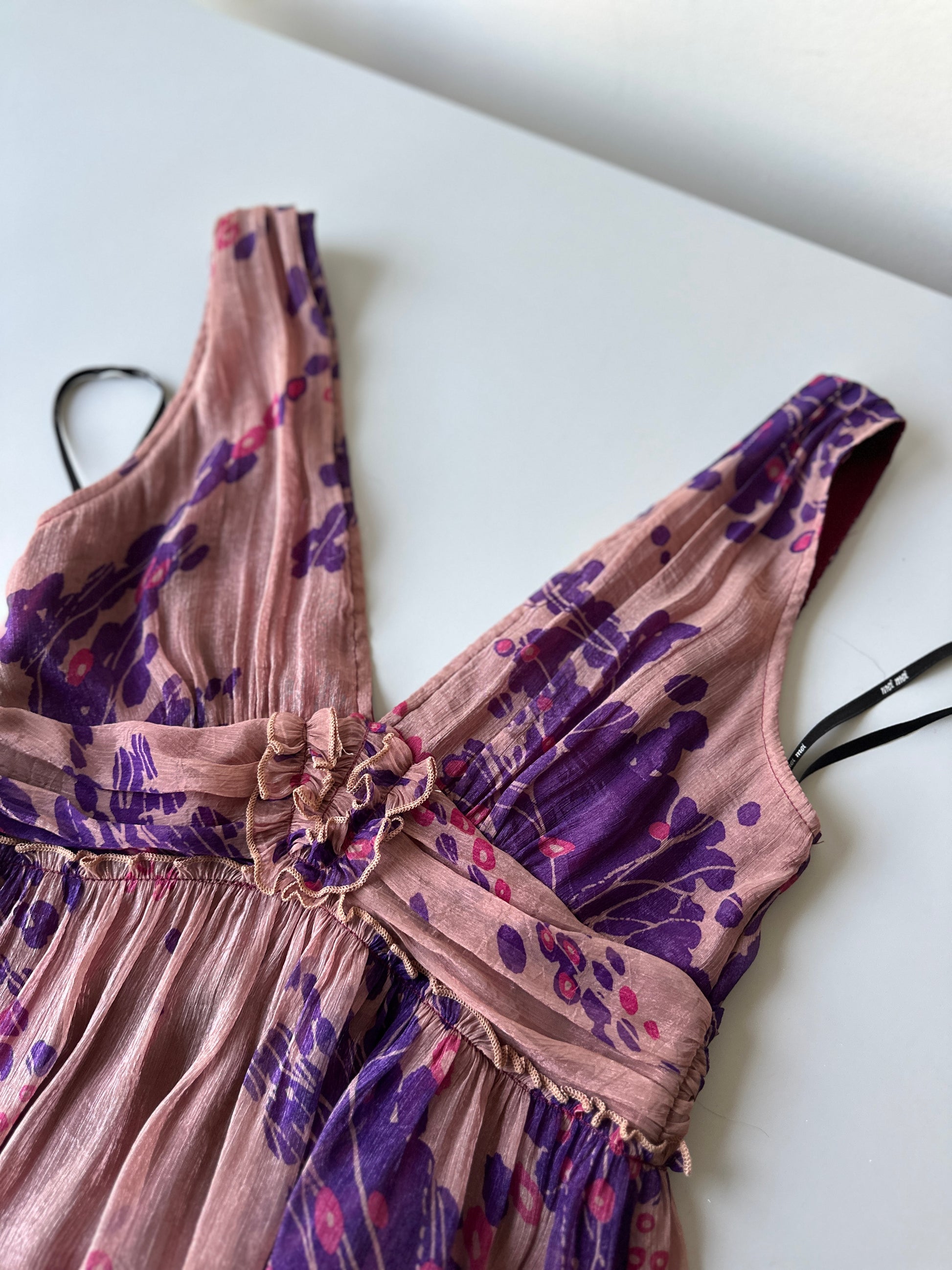 description. a beautiful babydoll dress with the perfect feel v front and back, and soft brown pink and purple floral pattern with a slight shimmer
