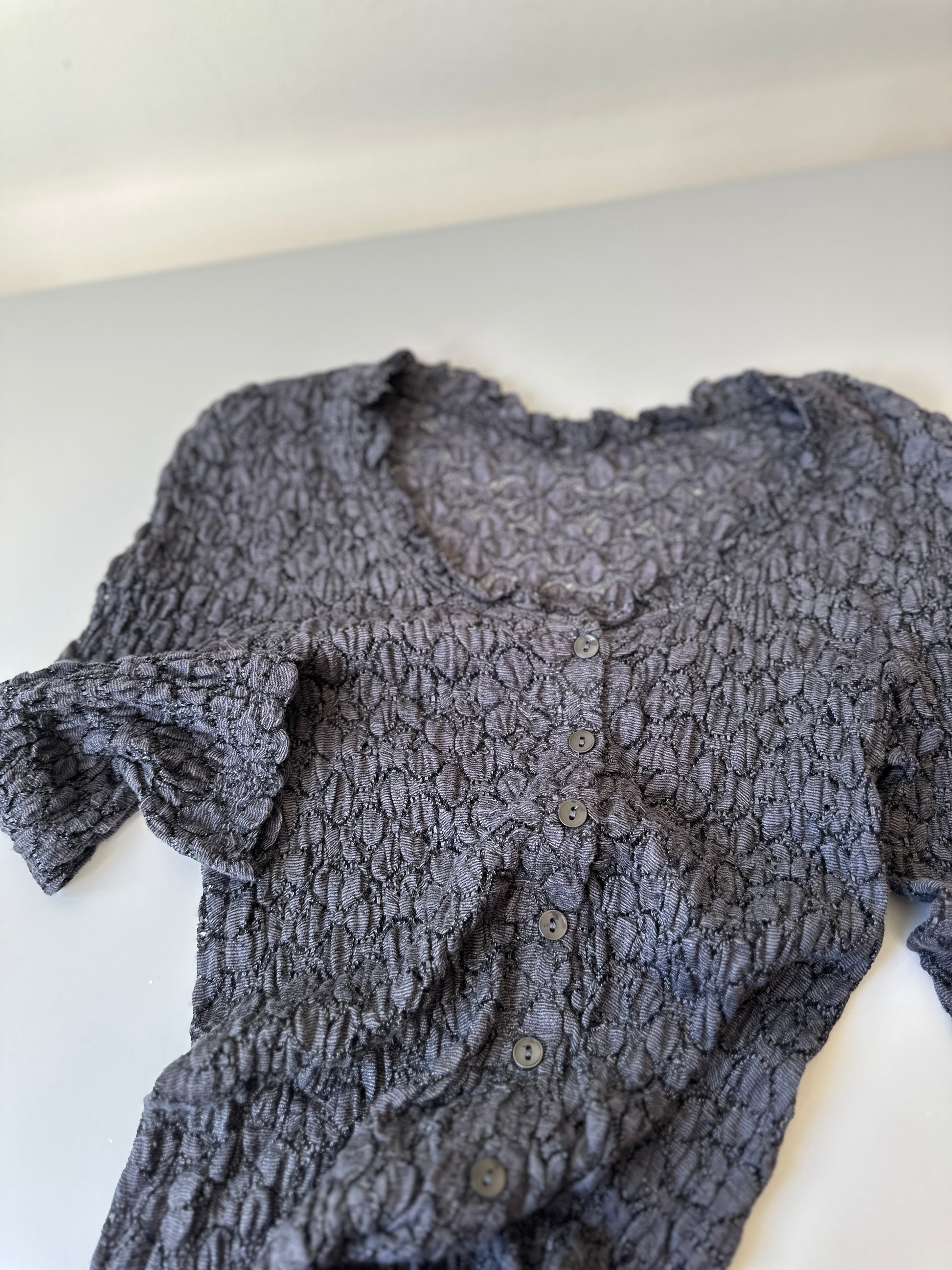 description. a sweet mid length sleeve button up blouses, it's super stretch material and its quite sheer so where it as is or as a cardigan over another top