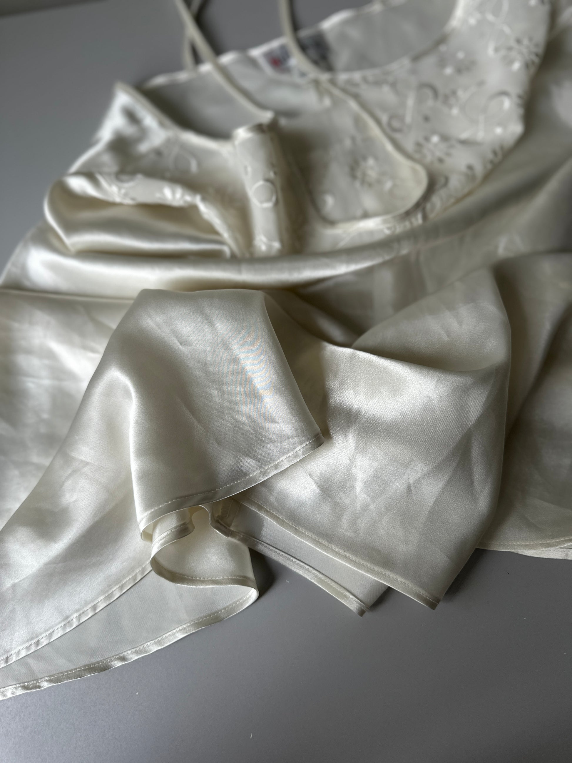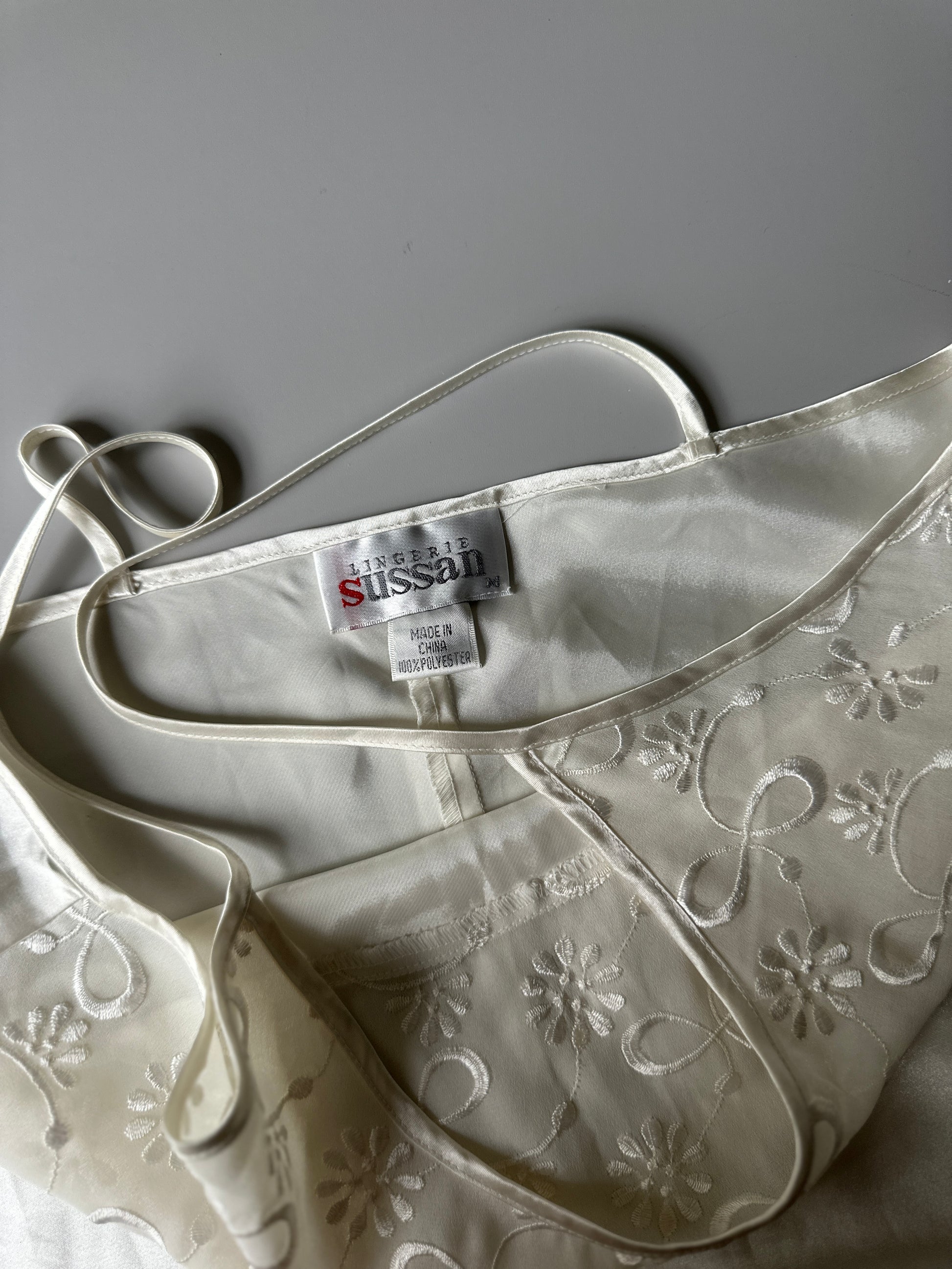 description. a beautiful white coloured dress slip with a solid satin skirt and flower swirl pattern embroidered on the sheer top bust part. the straps are not adjustable, but this piece is so sweet and needs a home!