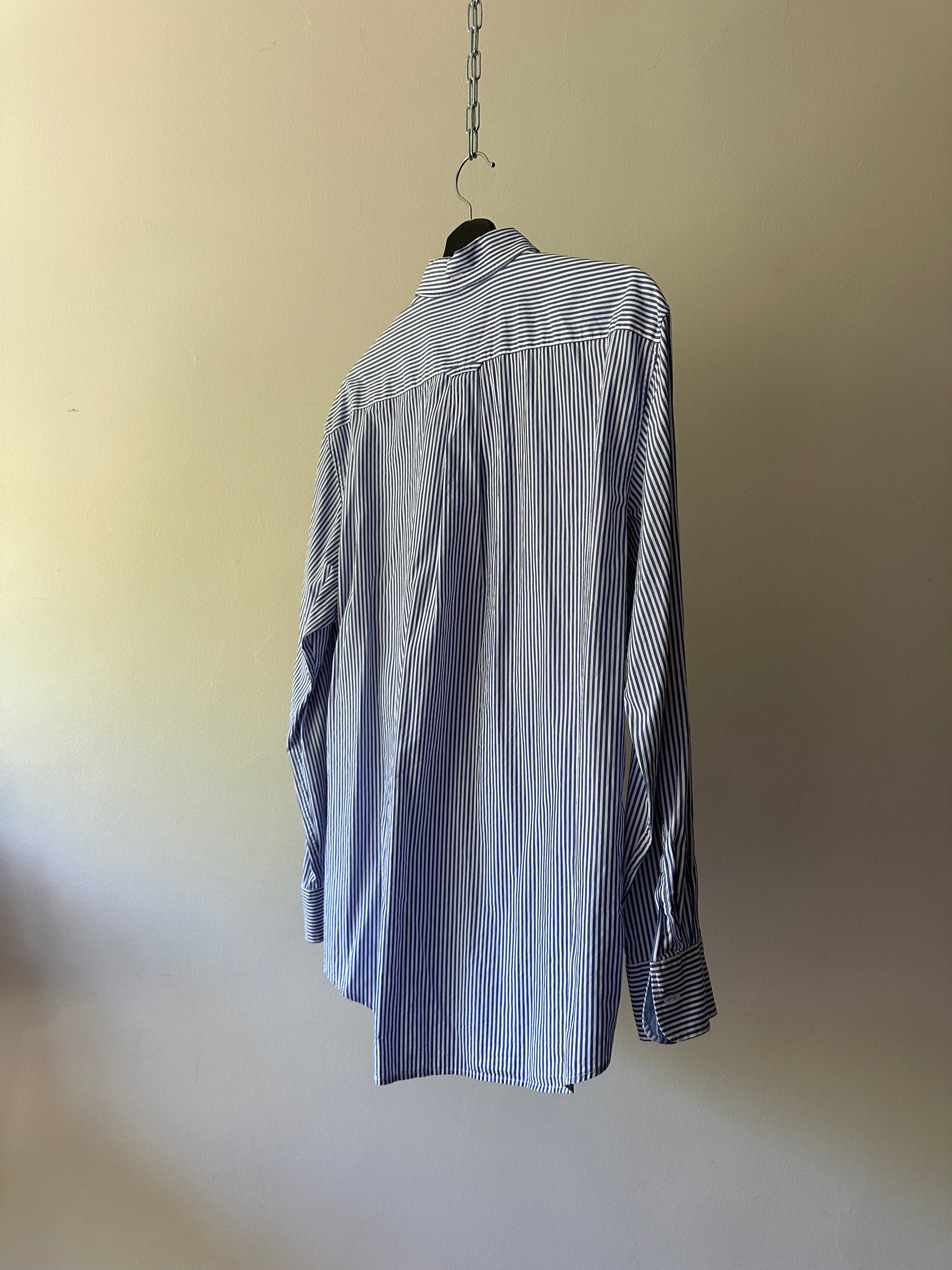 description. a classic GANT button up with blue and white vertical stripes and a logo on the pocket