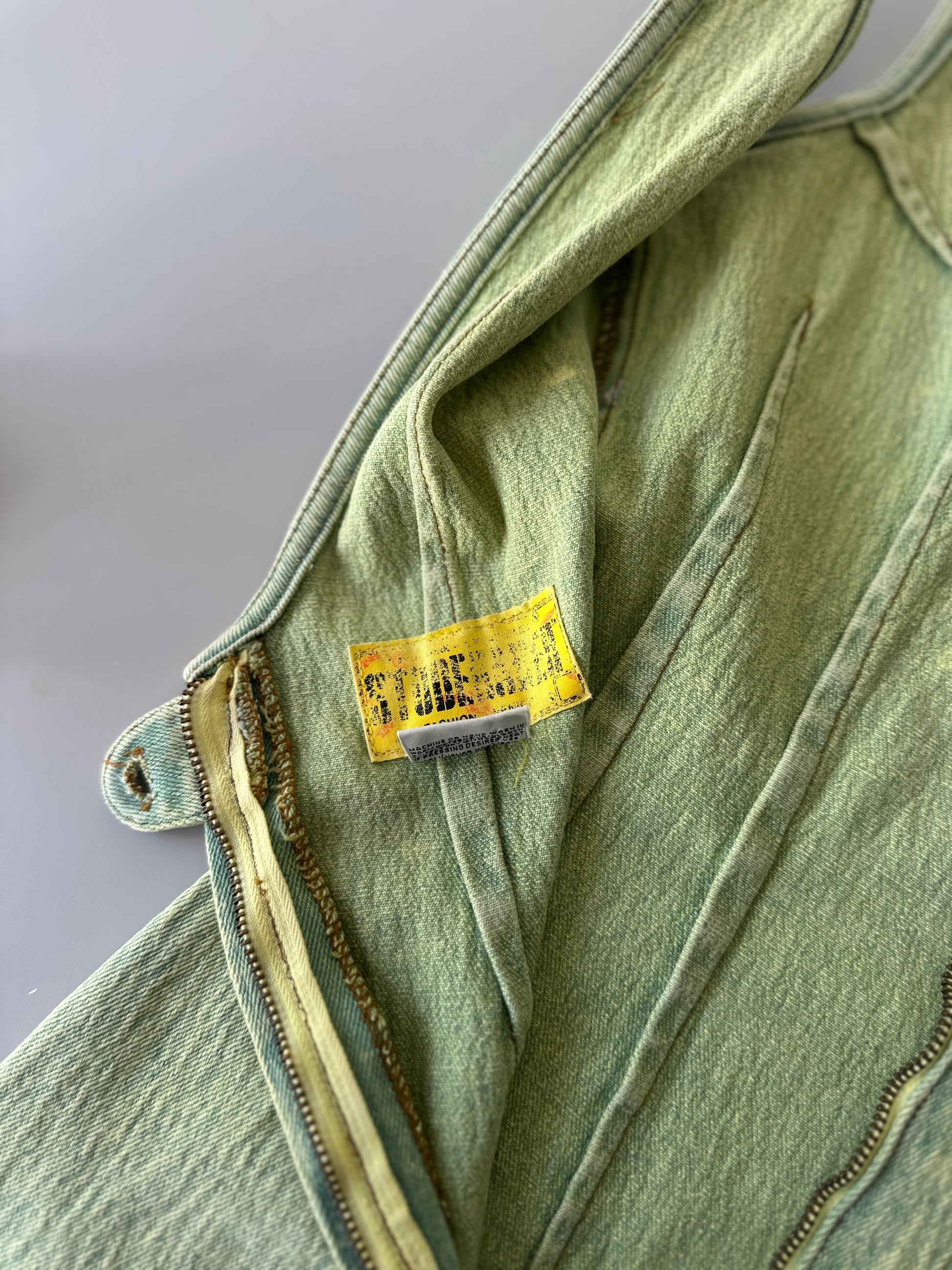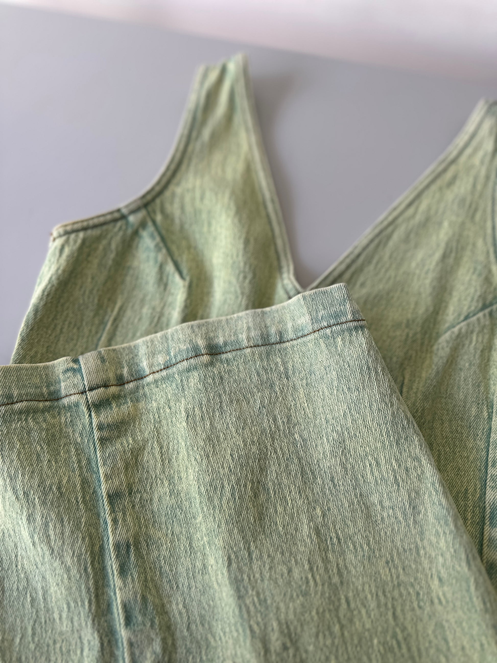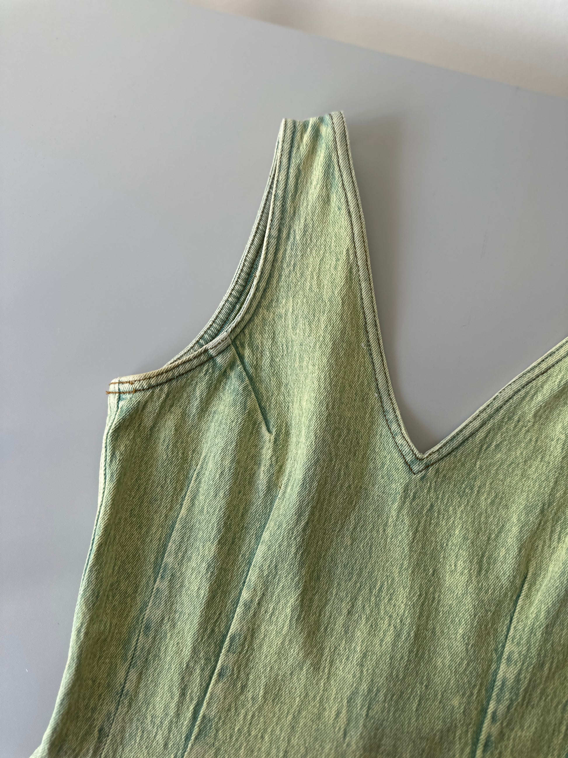 description. THE coolest green coloured denim dress, it will fit perfectly on the right person. with a low cut back that zips and buttons up, and a low front v-neckline. the denim is stretchy so this will fit so so well with the pleats at the front and back.
