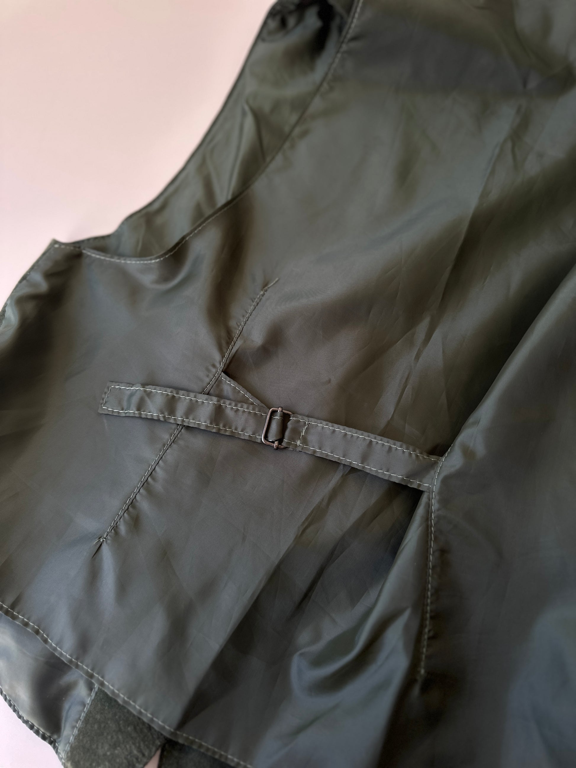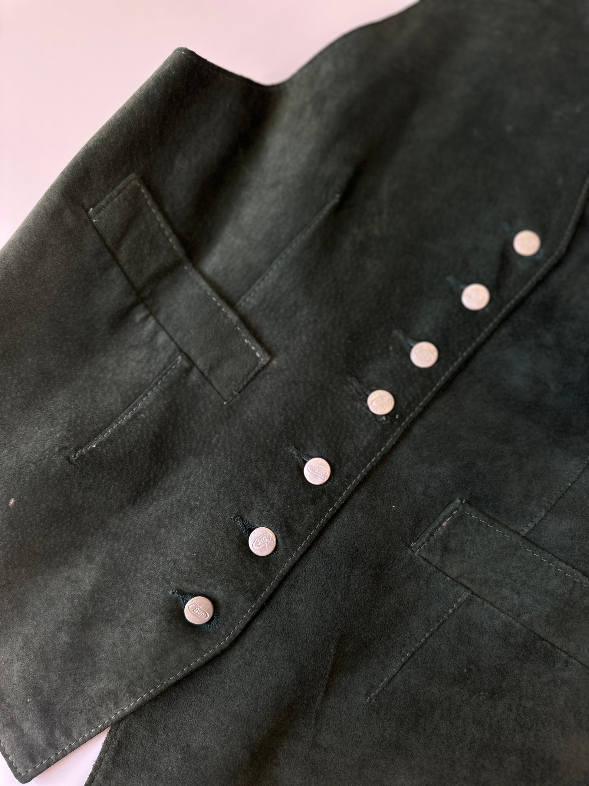 description. the COOLEST vest ever. until I looked for the material, I didn't know it was pig skin! so cool! vintage, green with 7 silver buttons up the front that have JAG jeans branded on them. this is such an iconic piece