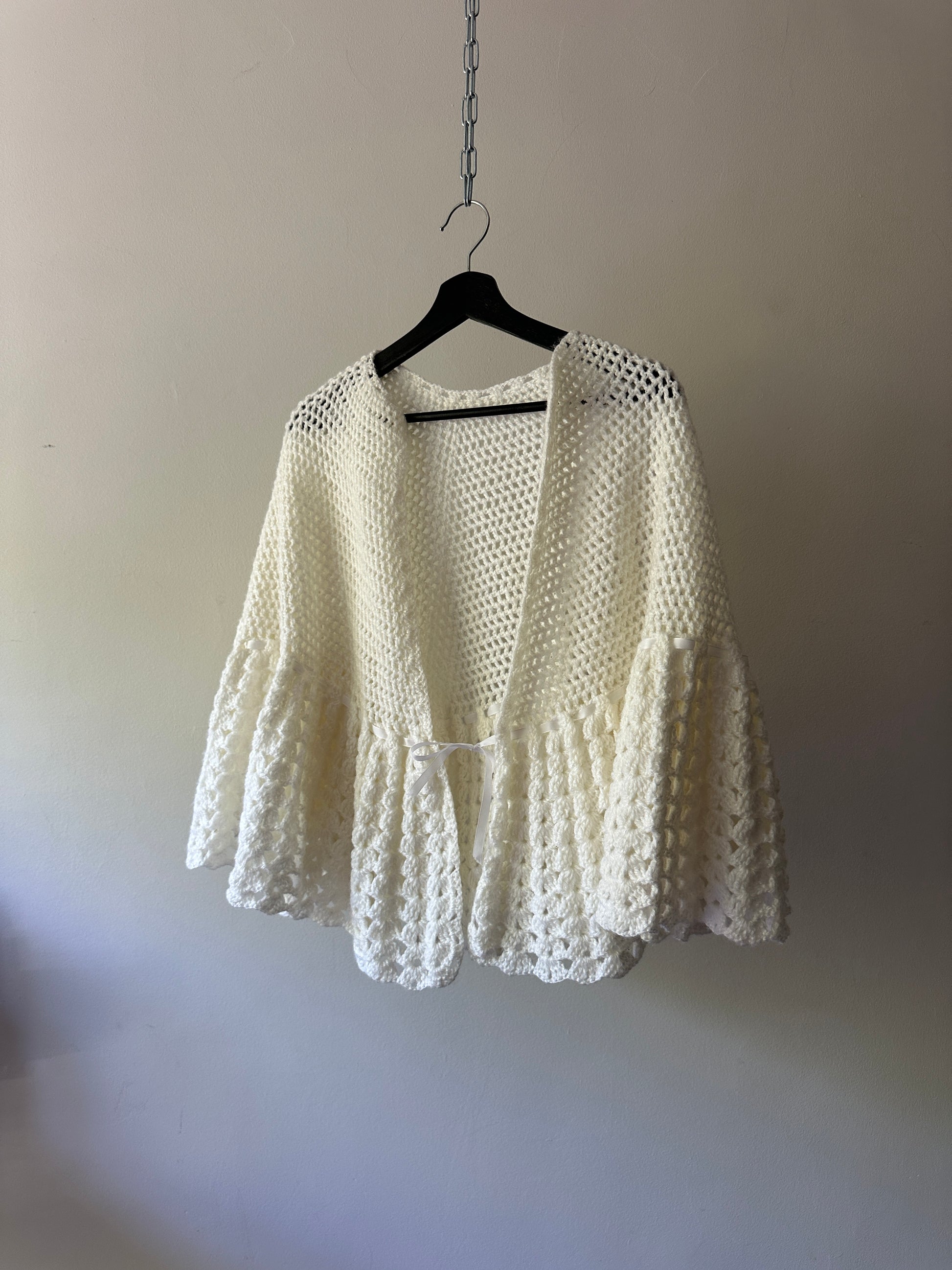 description. the SWEETEST crocheted white poncho with a weaved through to tie it at the front, this was definitely hand made for someone its so cute