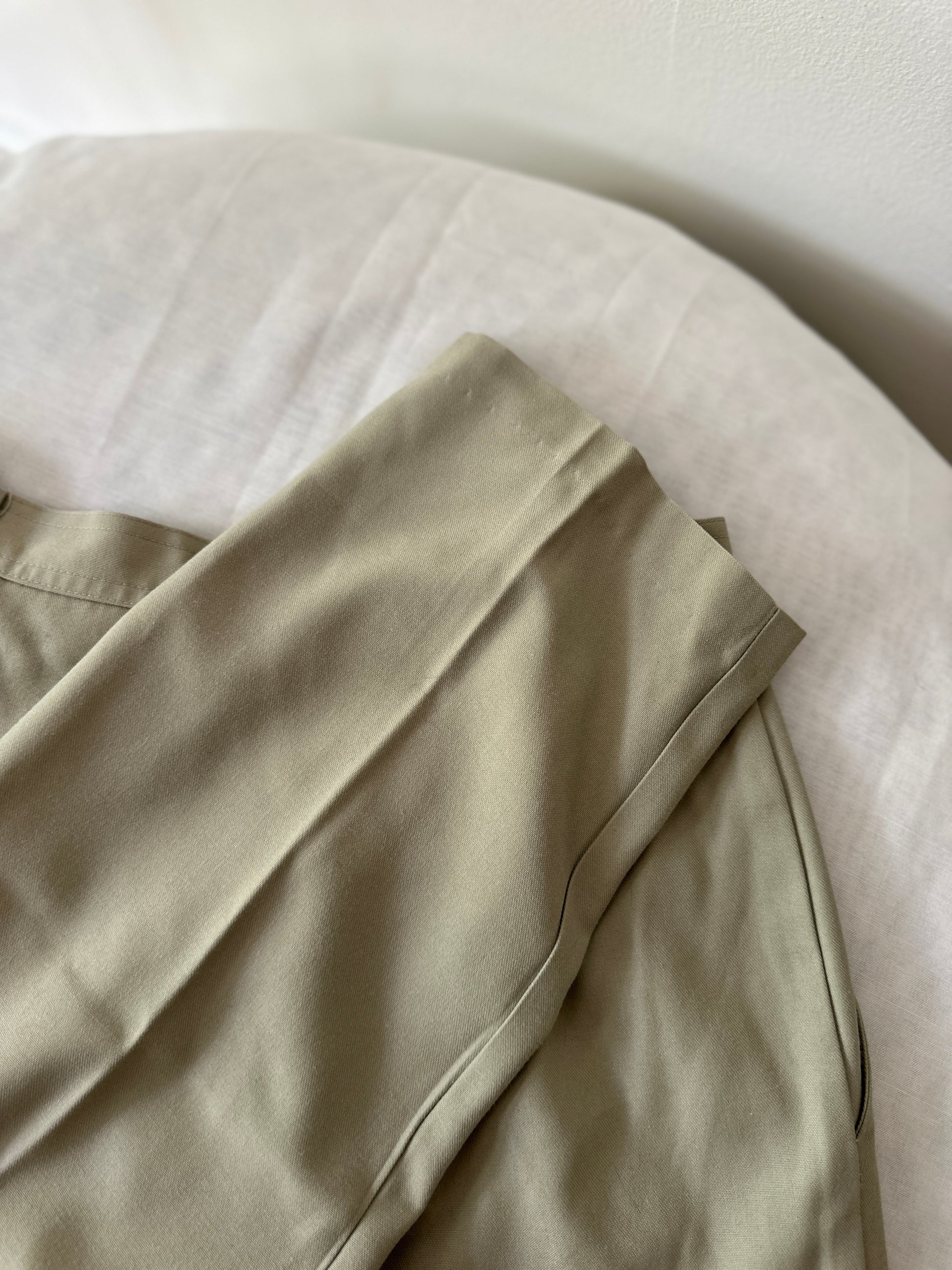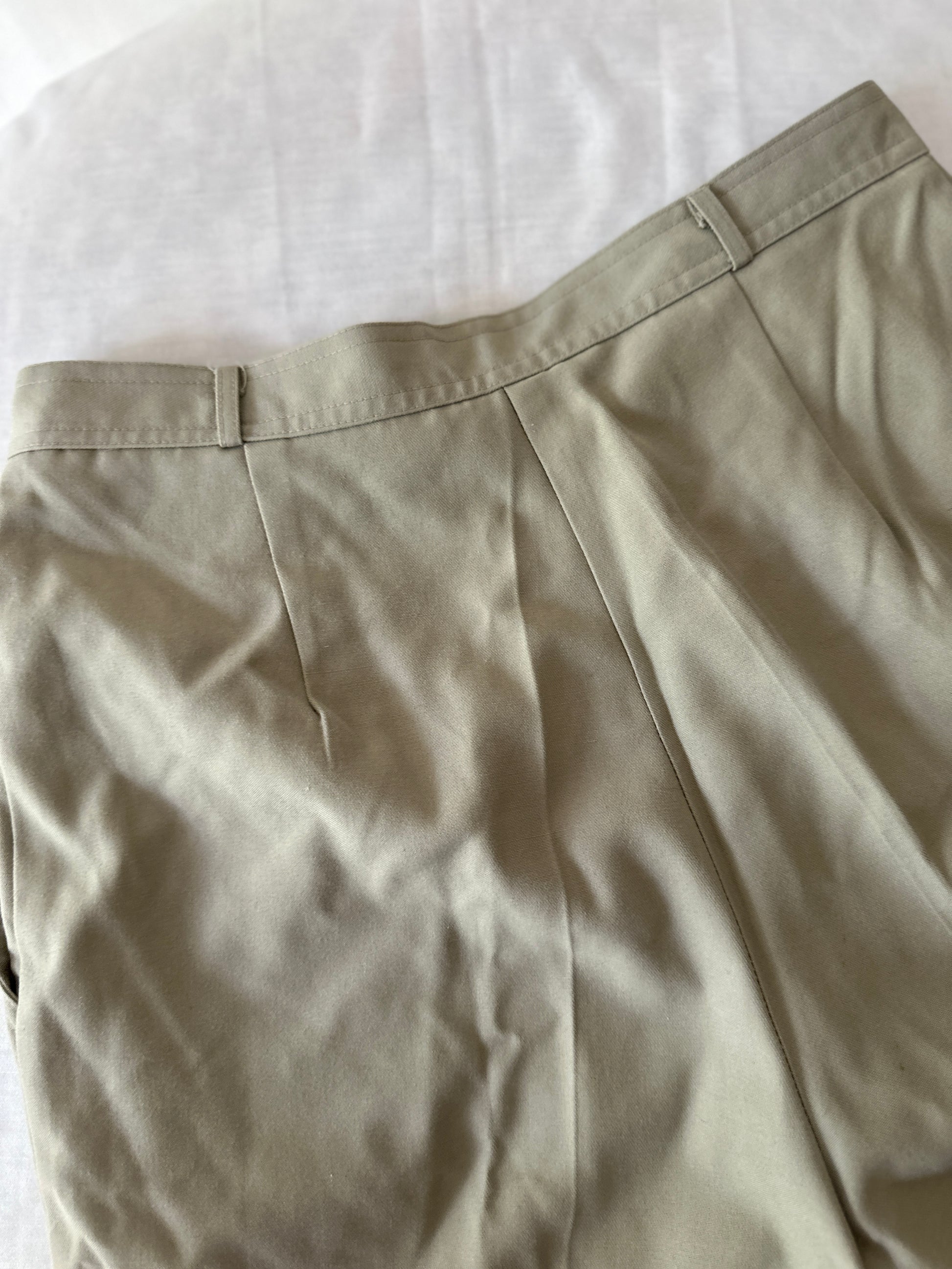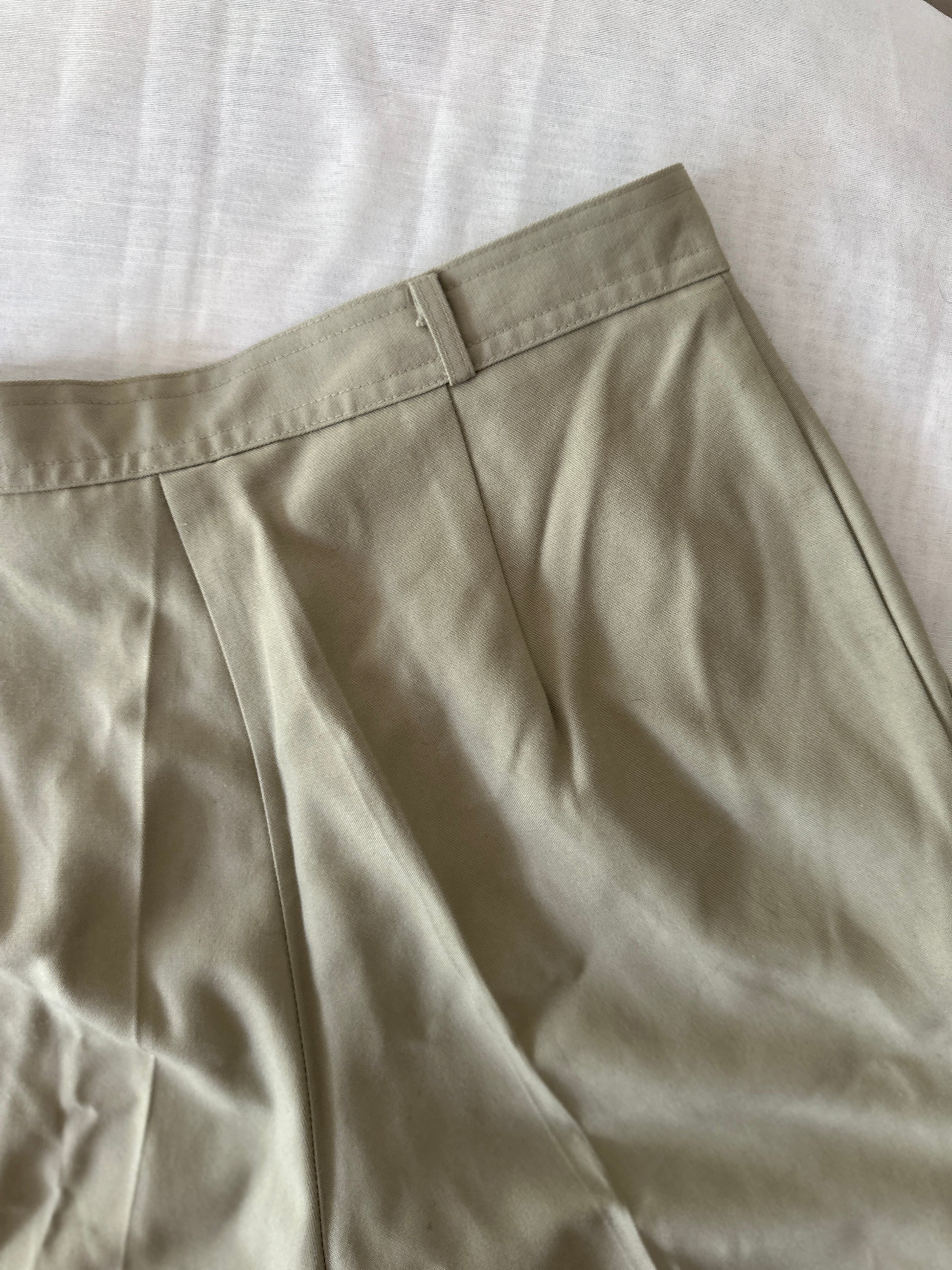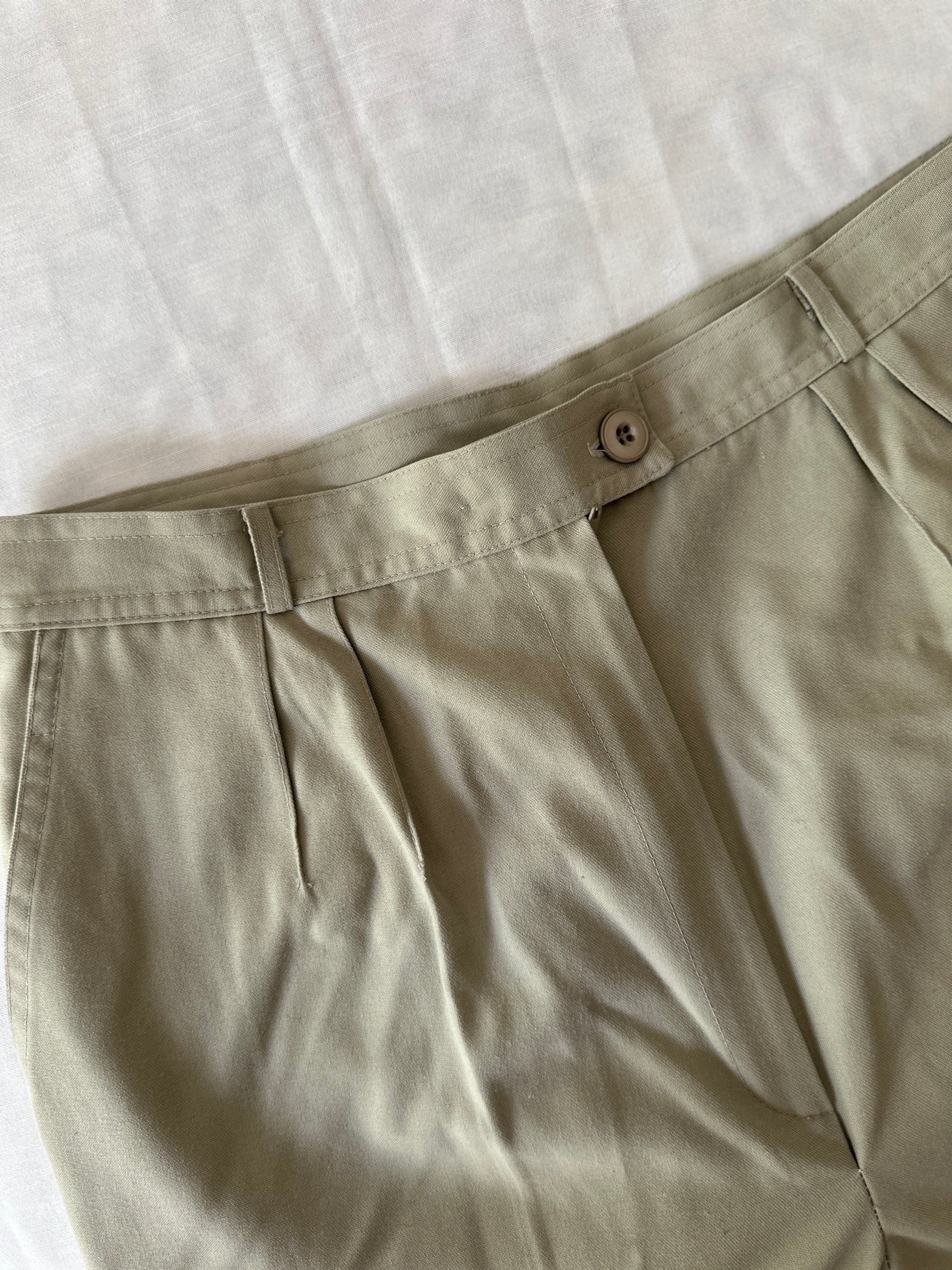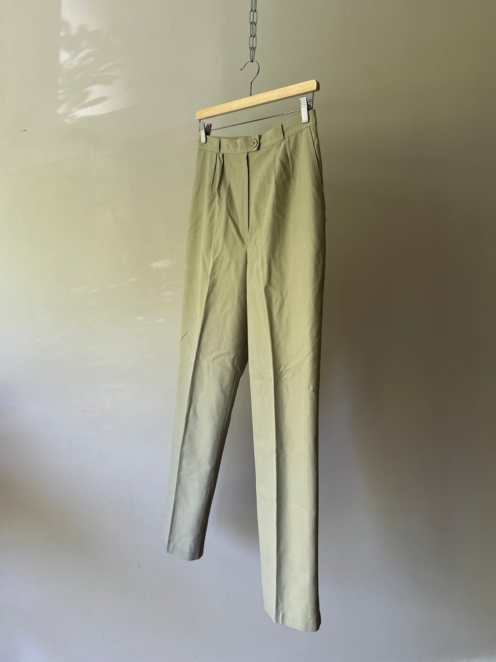 description. a great pair of trousers, high waisted and a fun colour way between light olive green and grey, depending on what you may pair it with. the tousles are pleated and there are a couple belt hoops for extra structure