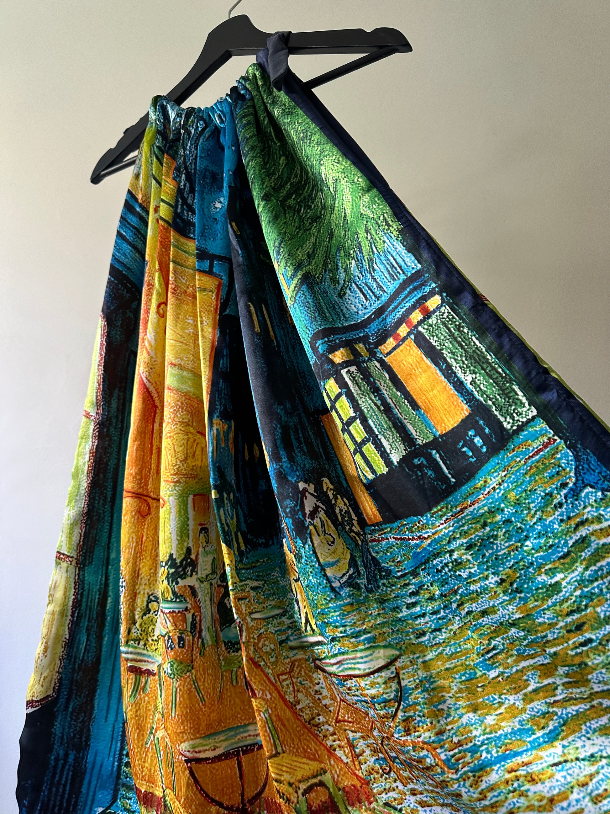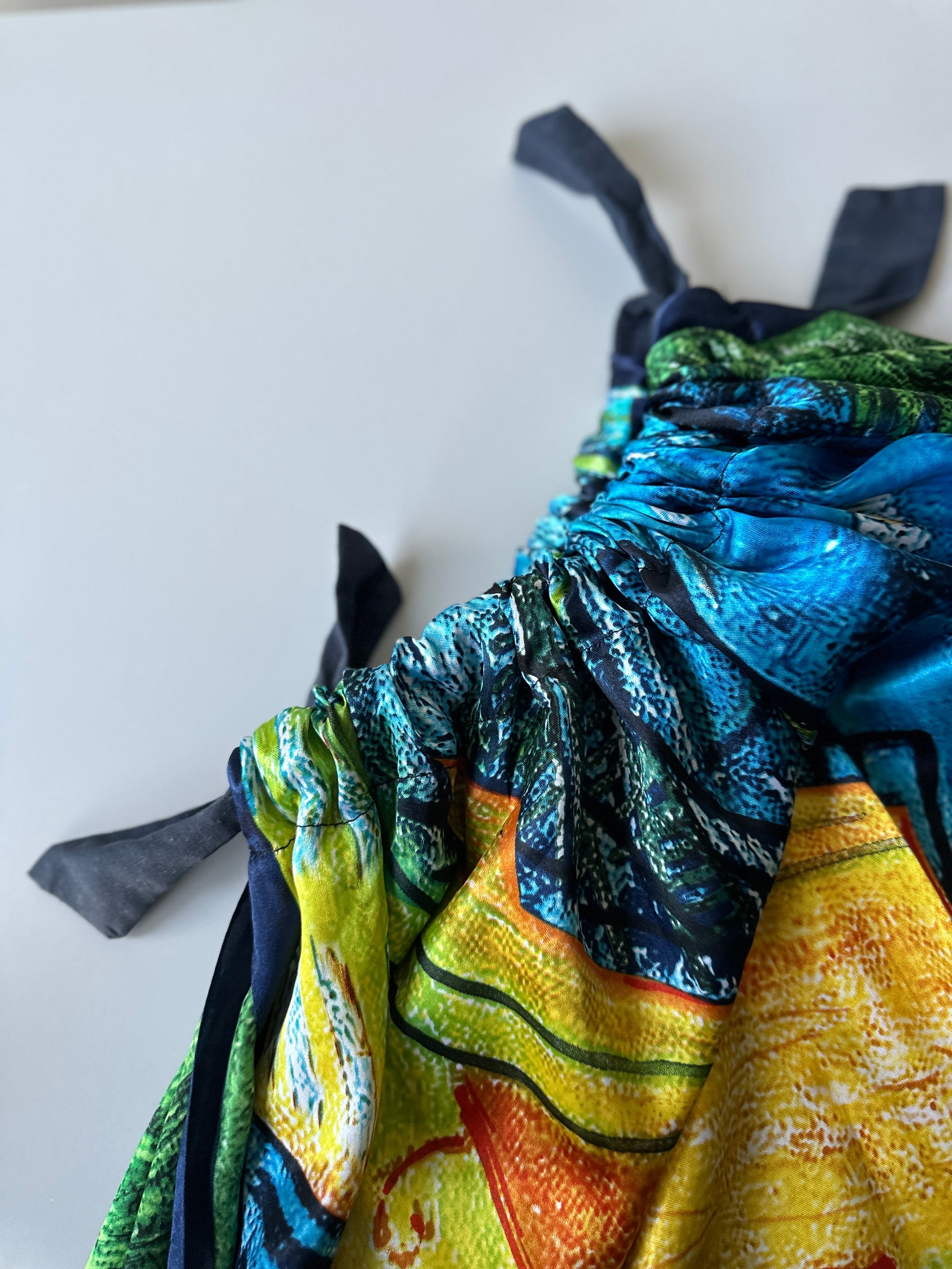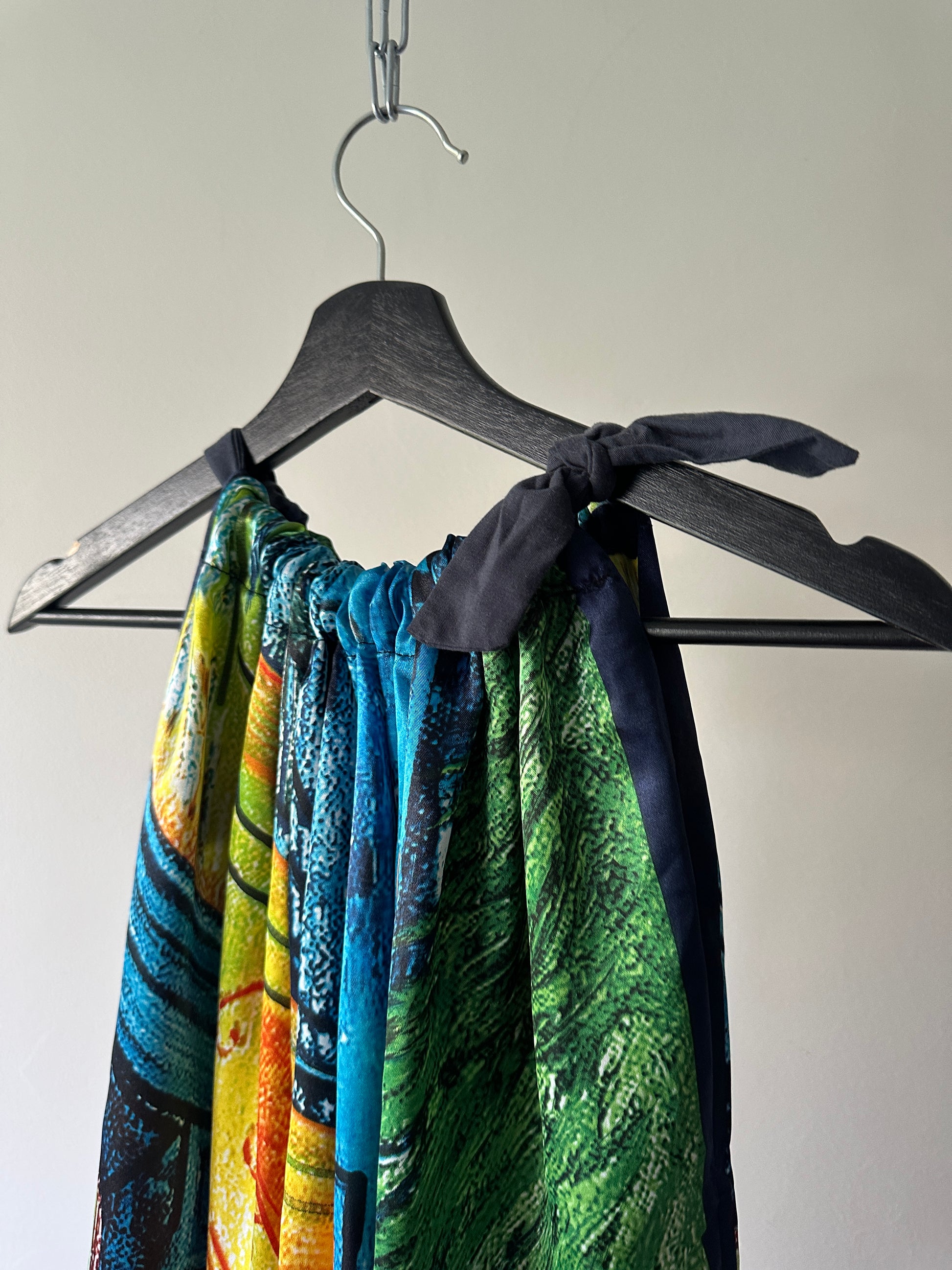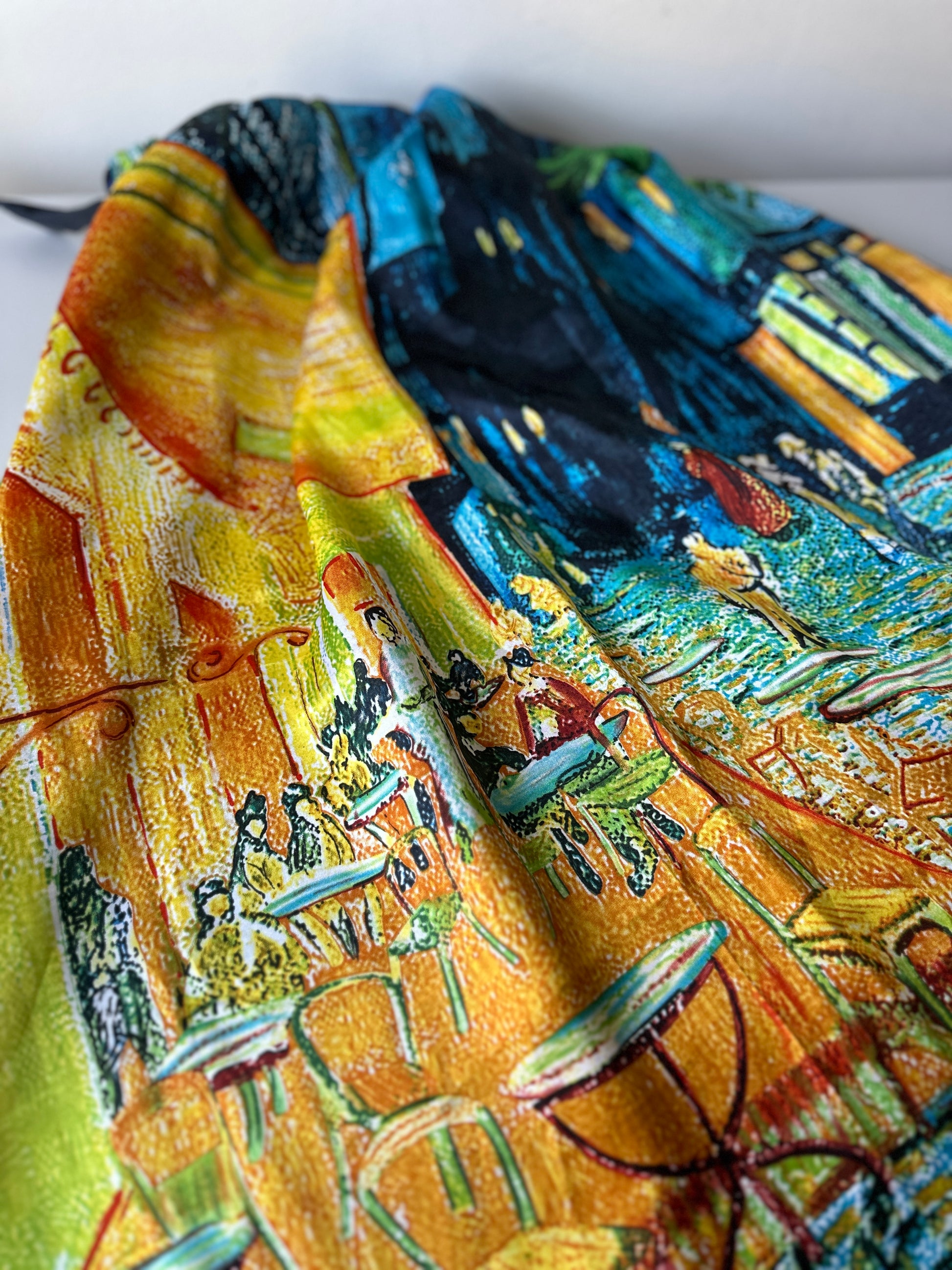 description. three is no label, no size or material on this dress. but it didn't stop me from buying it because the shape and fabric speak for themselves. the GORGEOUS cafe scene pattern on the dress combined with the tie neck and super flow cut, this is honestly perfect for a holiday- no matter the destination