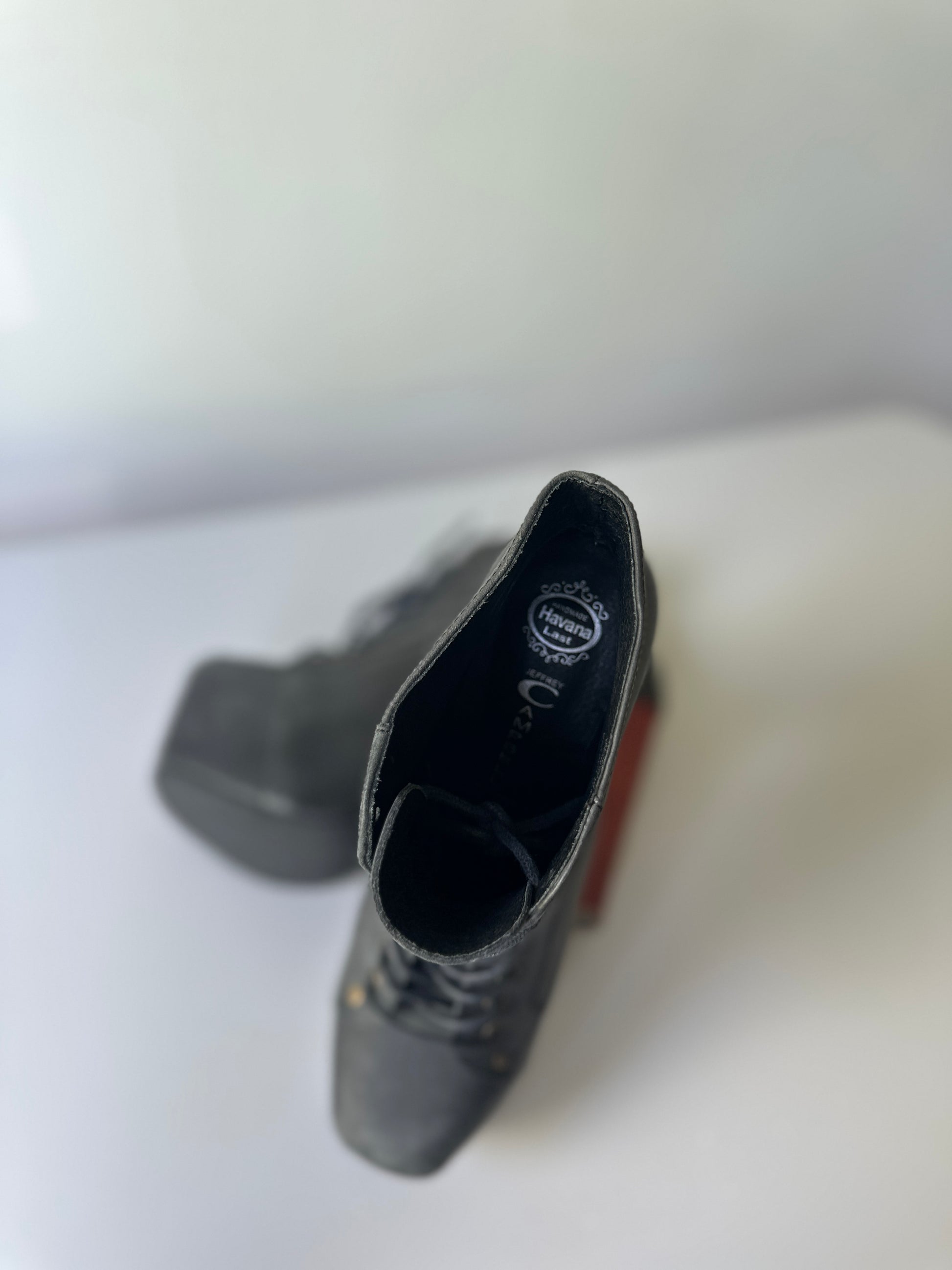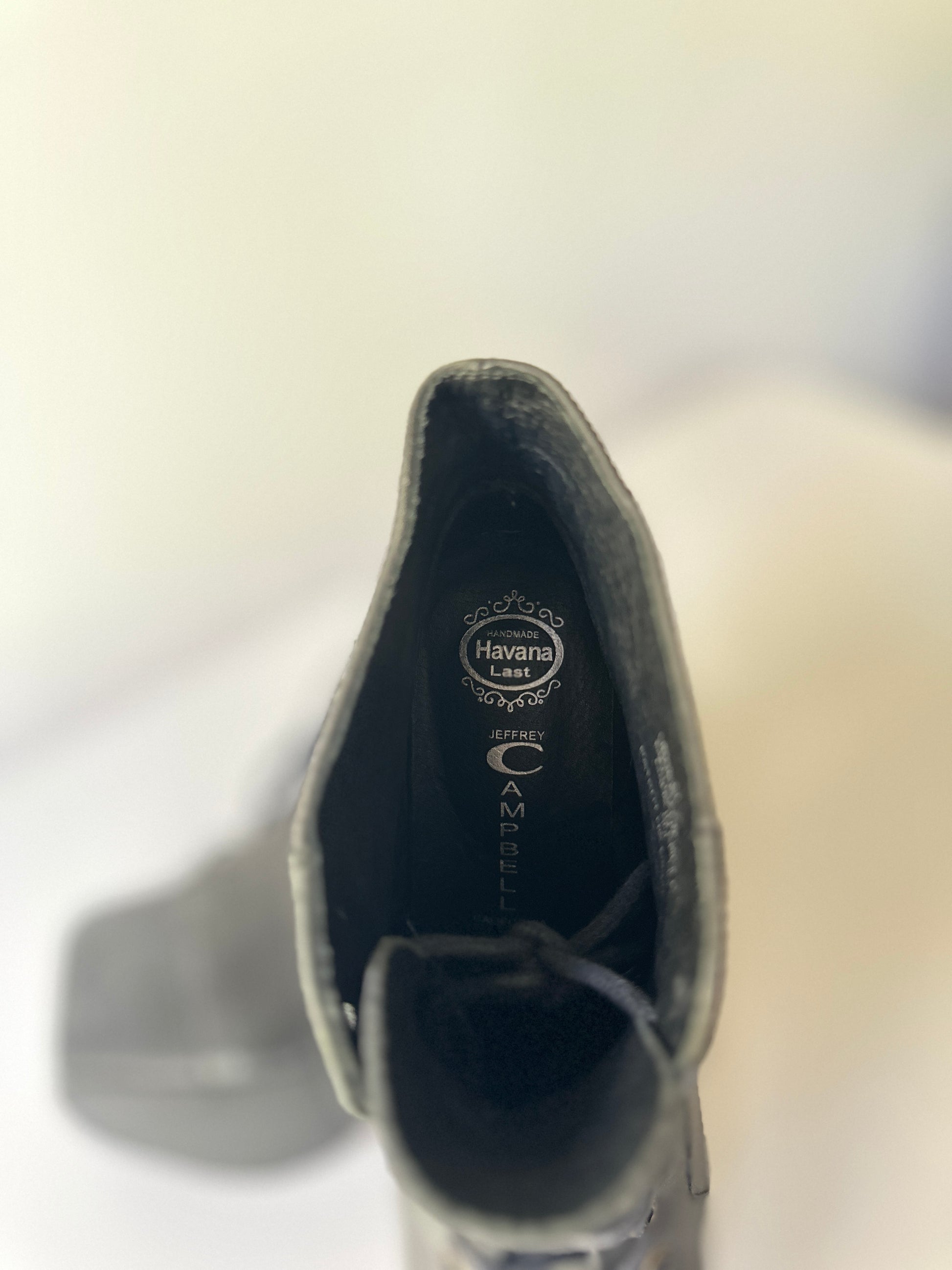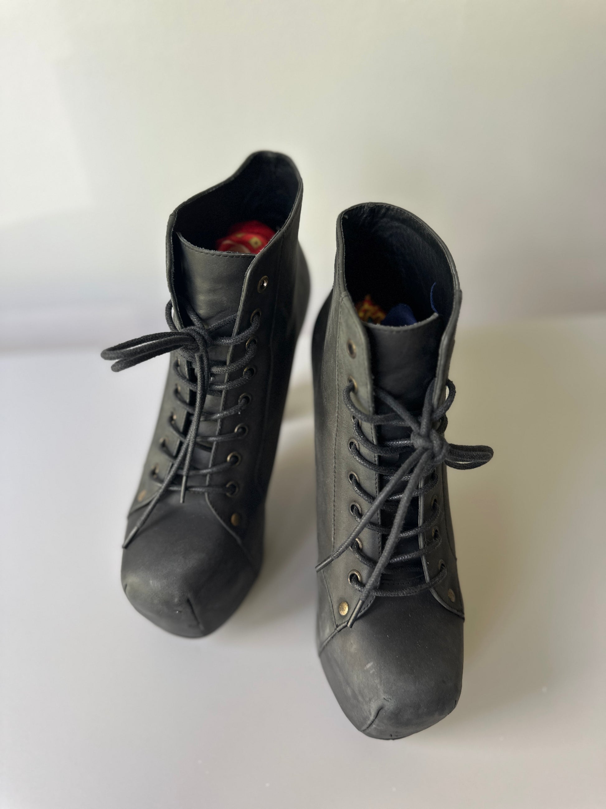 description. STOP, the iconic Jeffrey Campbell Lita shoes dating back to 2010. SUCH a blast from the past, however they still hold up today. these ones are a soft brushed black leather, with the brown wooden block heel