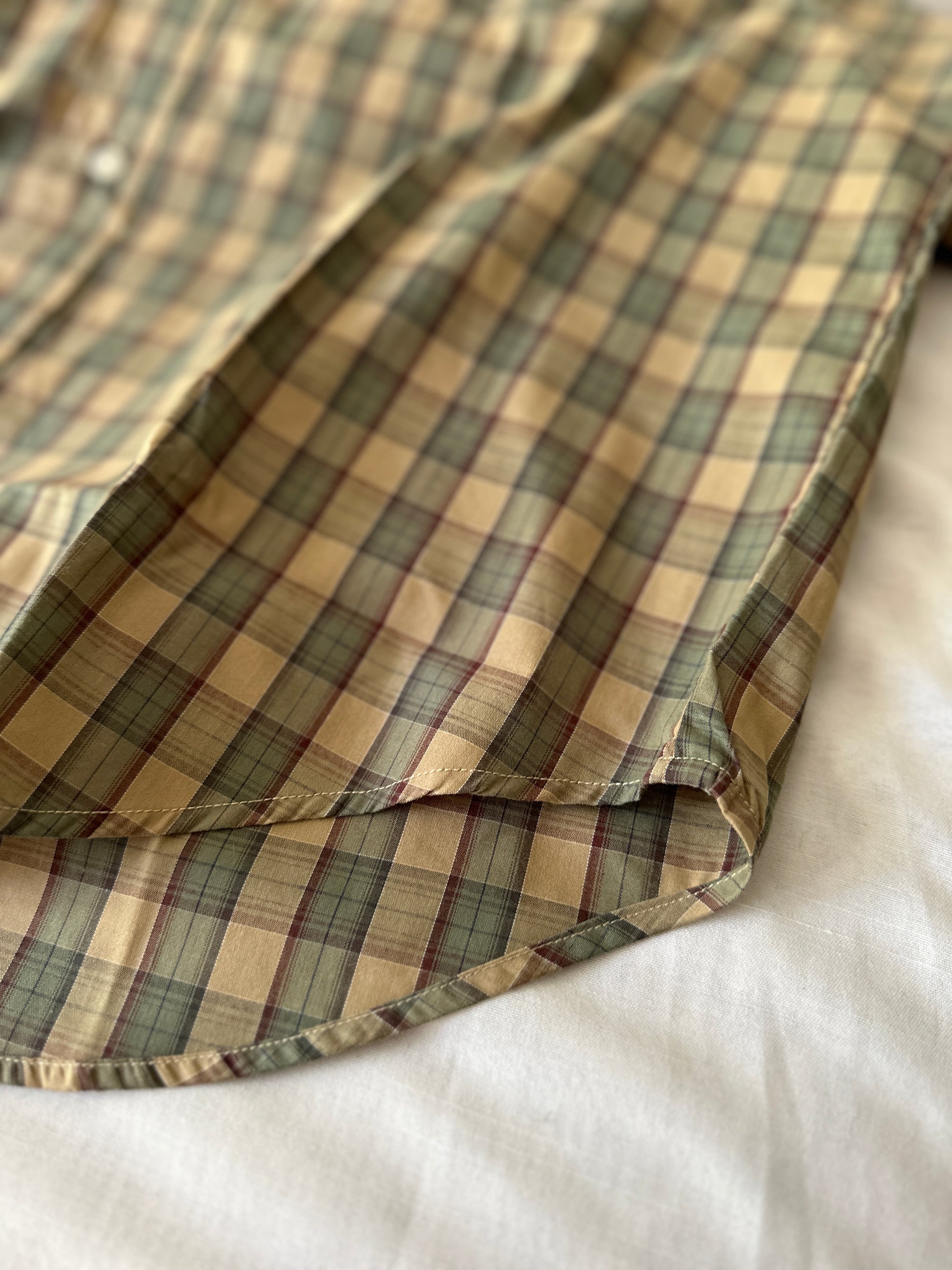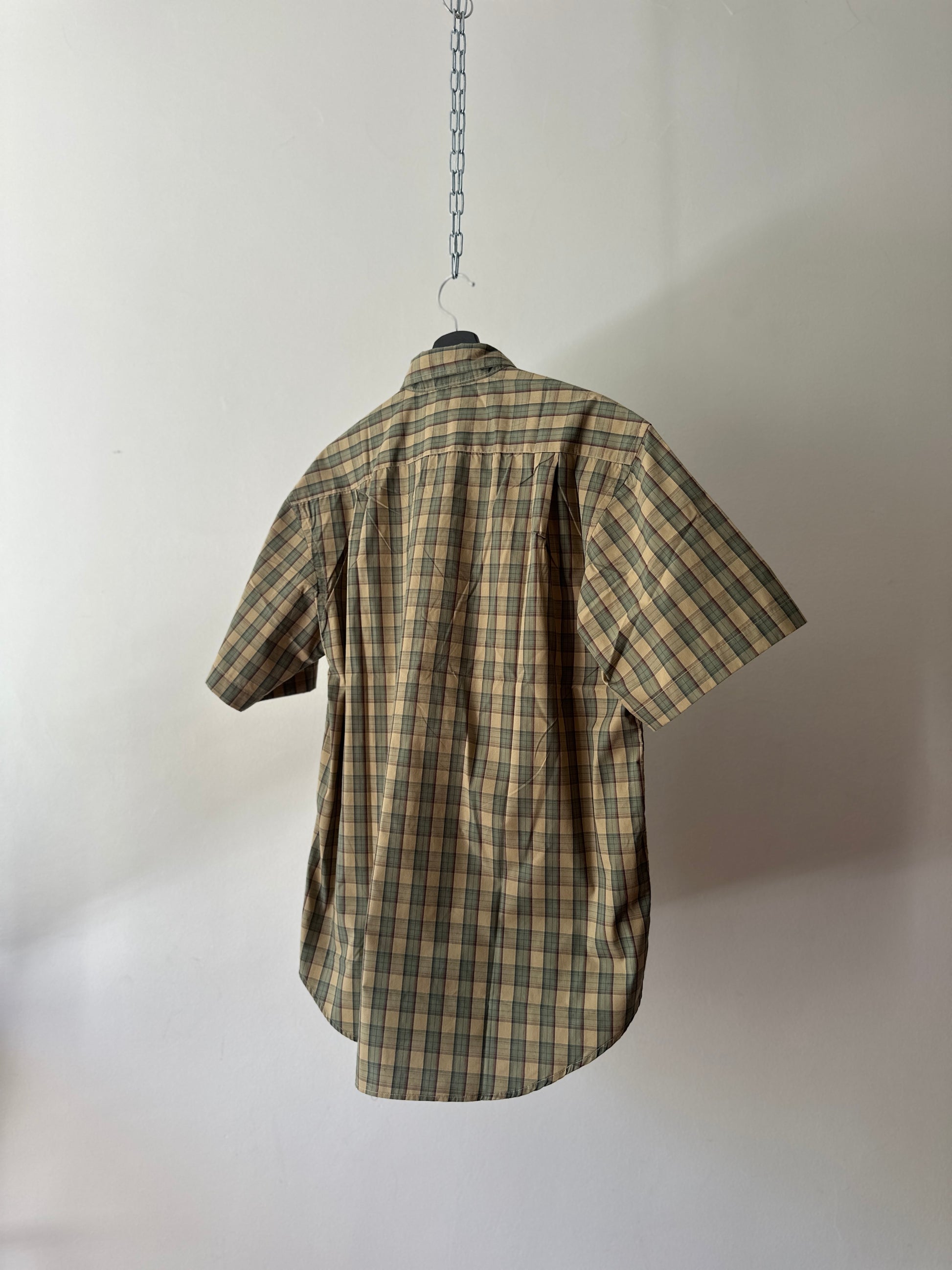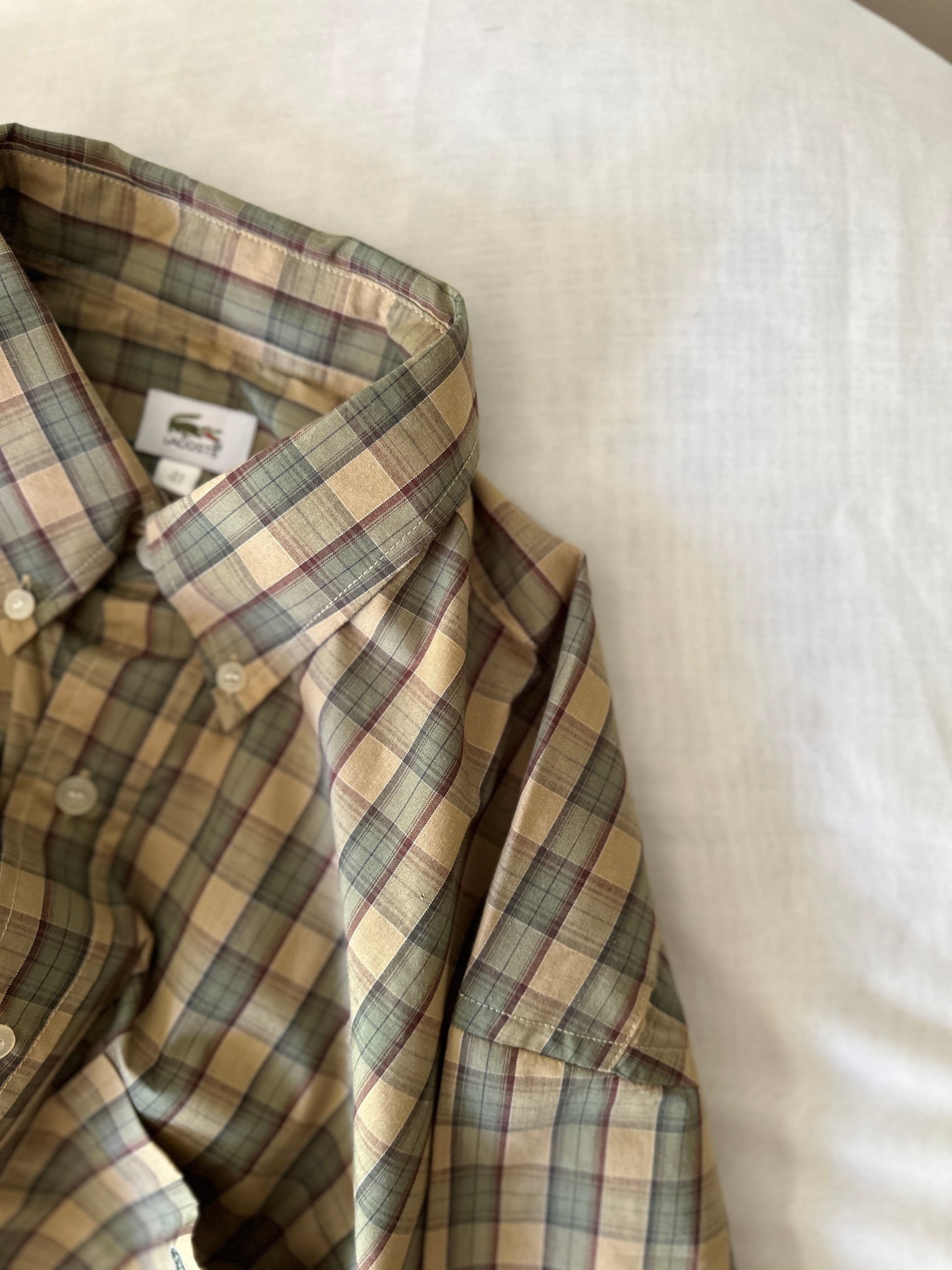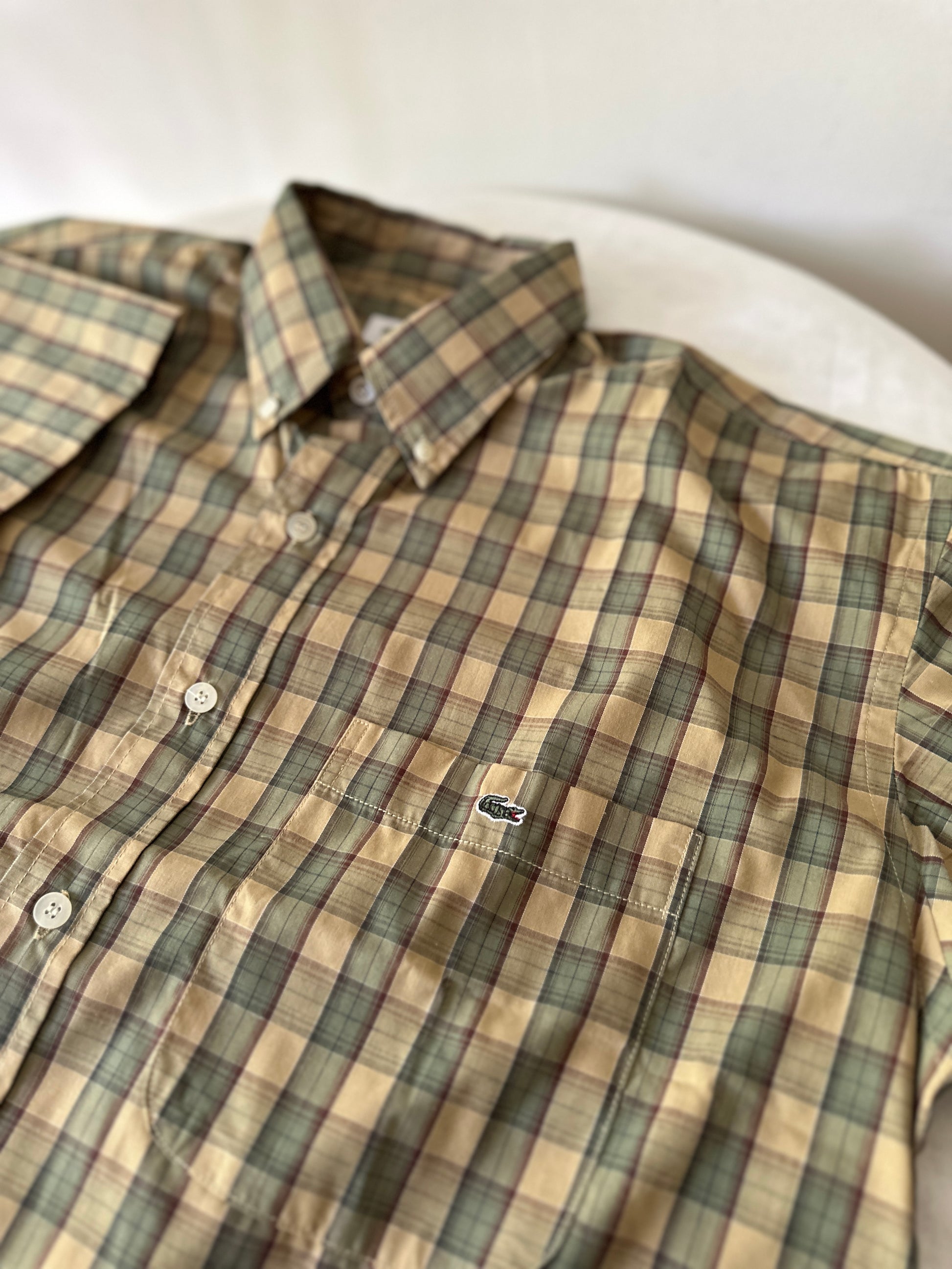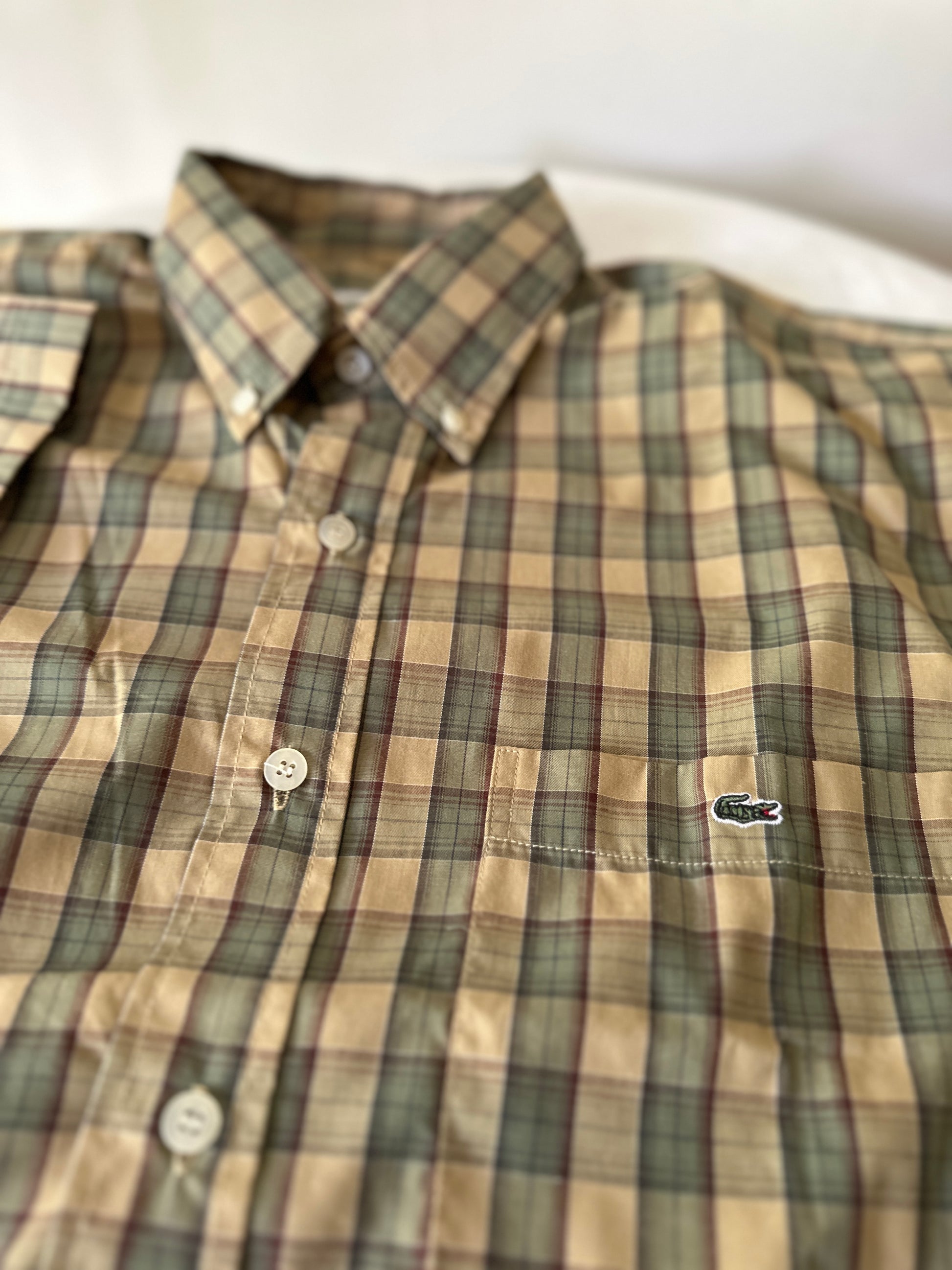 description. a very cool colour way, this cotton Lacoste short sleeve button up has a combination of tan, maroon and green tones in the cross-stitched pattern. pretty much recreating the logo in a print I would say. it's a super light cotton and we also can't go past the iconic alligator logo on the front pocket, it definitely needs a new home