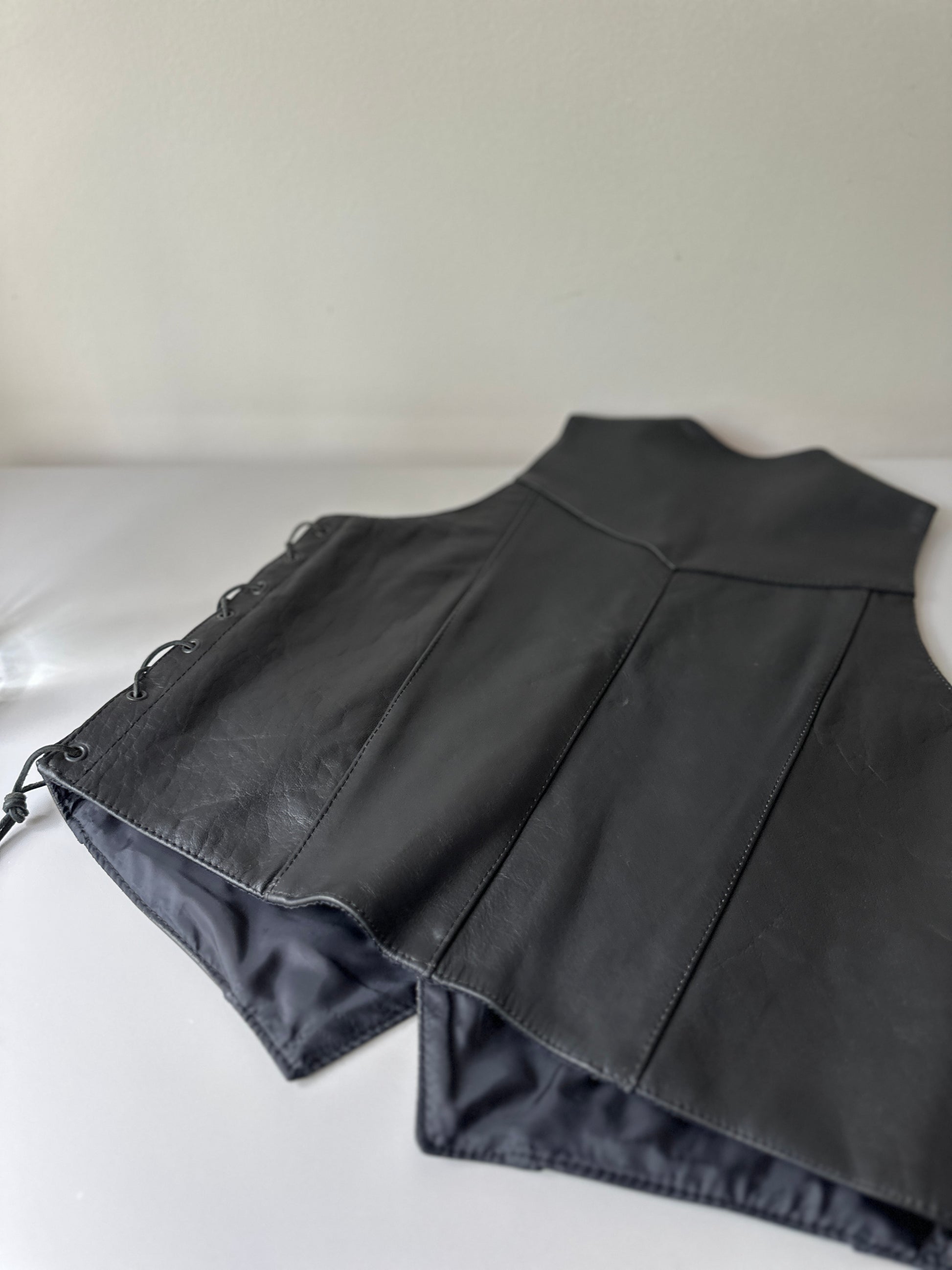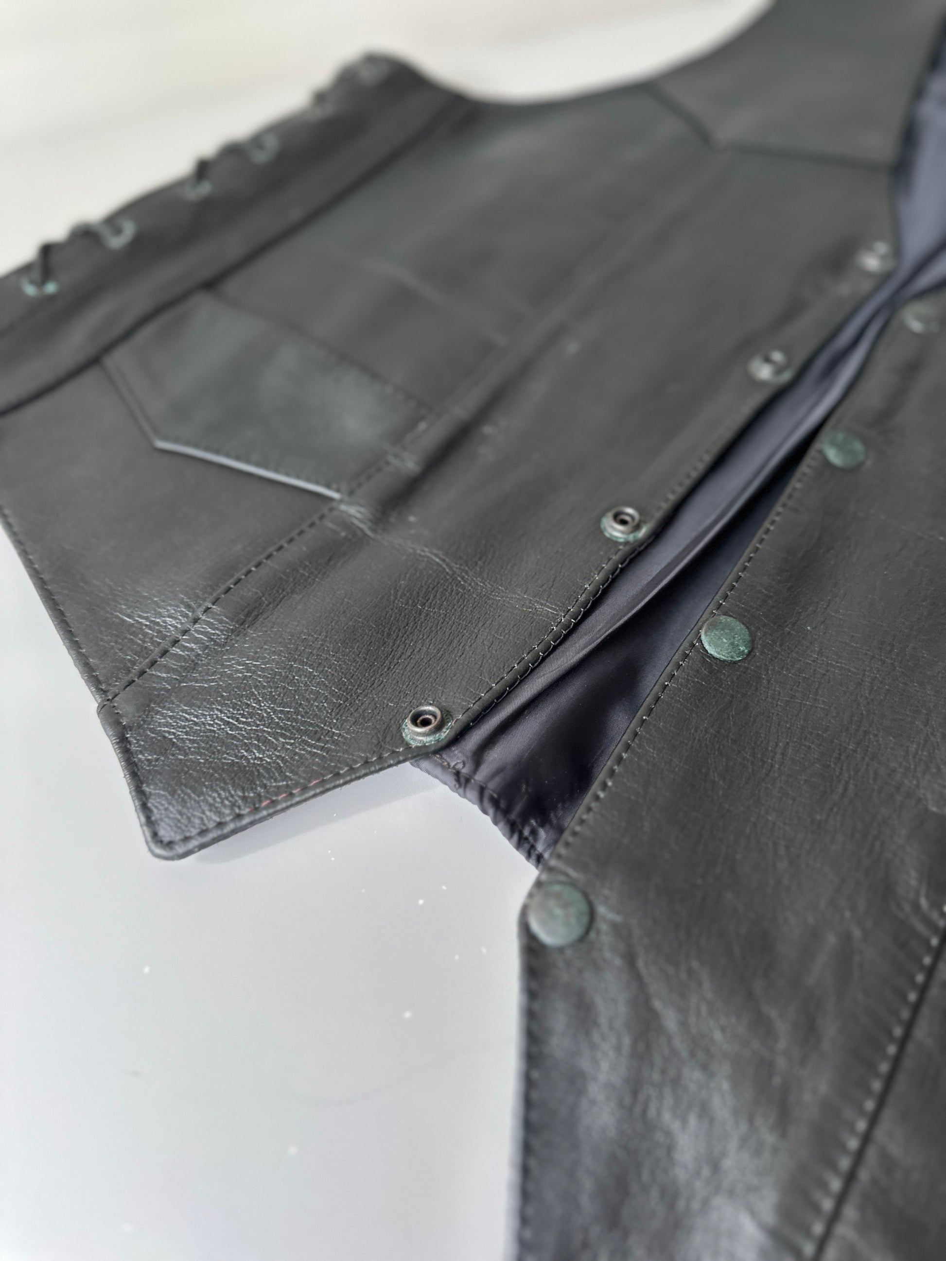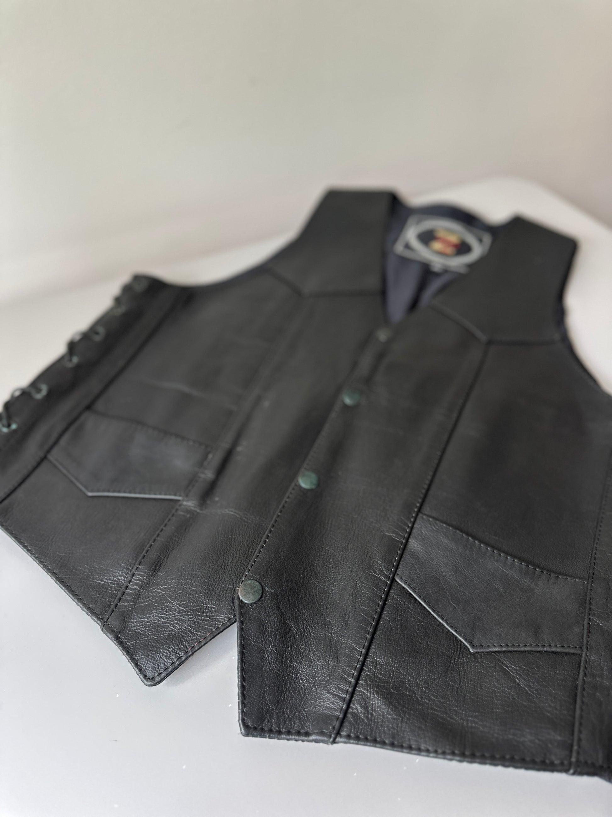 description. just your overall fantastic leather vest with cross tied sides and clip close button front
